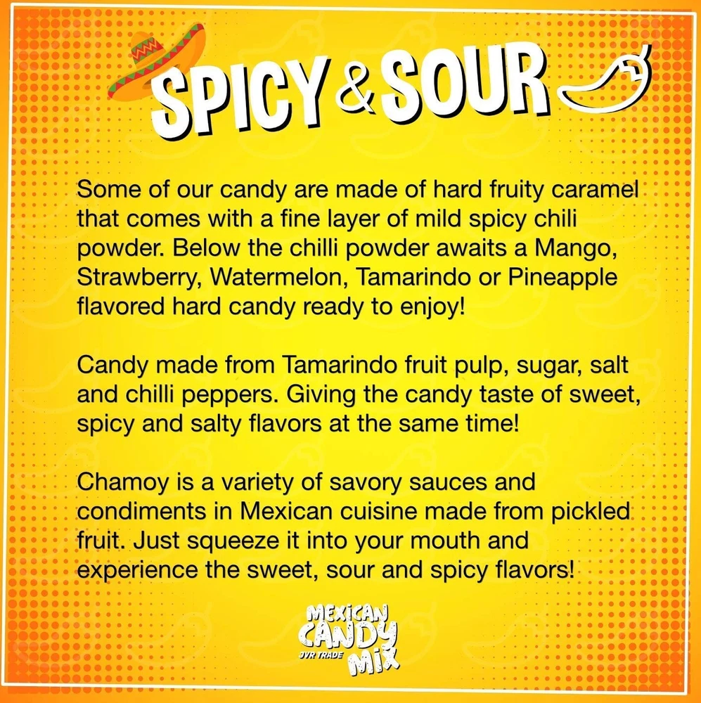 Mexican Candy Mix Assortment Snack (42 Count) Dulces Mexicanos Variety Of Best Sellers Spicy, Sweet, and Sour Bulk candies, Includes Luca, Pelon, Pulparindo, Rellerindo, by JVR TRADE Description: Hand picked fresh candy from the most popular SPICY, SWEET, SOUR candies and popular brands of dulces from Mexico Each bag contains over 1 pound of popular favorite candies: Pelon Pelo Rico, Lucas Muecas Chamoy, Pulparindo Yellow and Chamoy, Skwinkles Salsaguetti, Rockaleta Lollipop, Lucas Gusano, Rebanaditas Sandia, Vero Mango, Elotes Lollipops, Bolitochas, Chaca Chaca, Vero Picagomas, and more.. Fresh Candy Guaranteed!! Includes candy with layers of mild spicy chili powder and fruit flavors awaiting below. Bowl not included !!