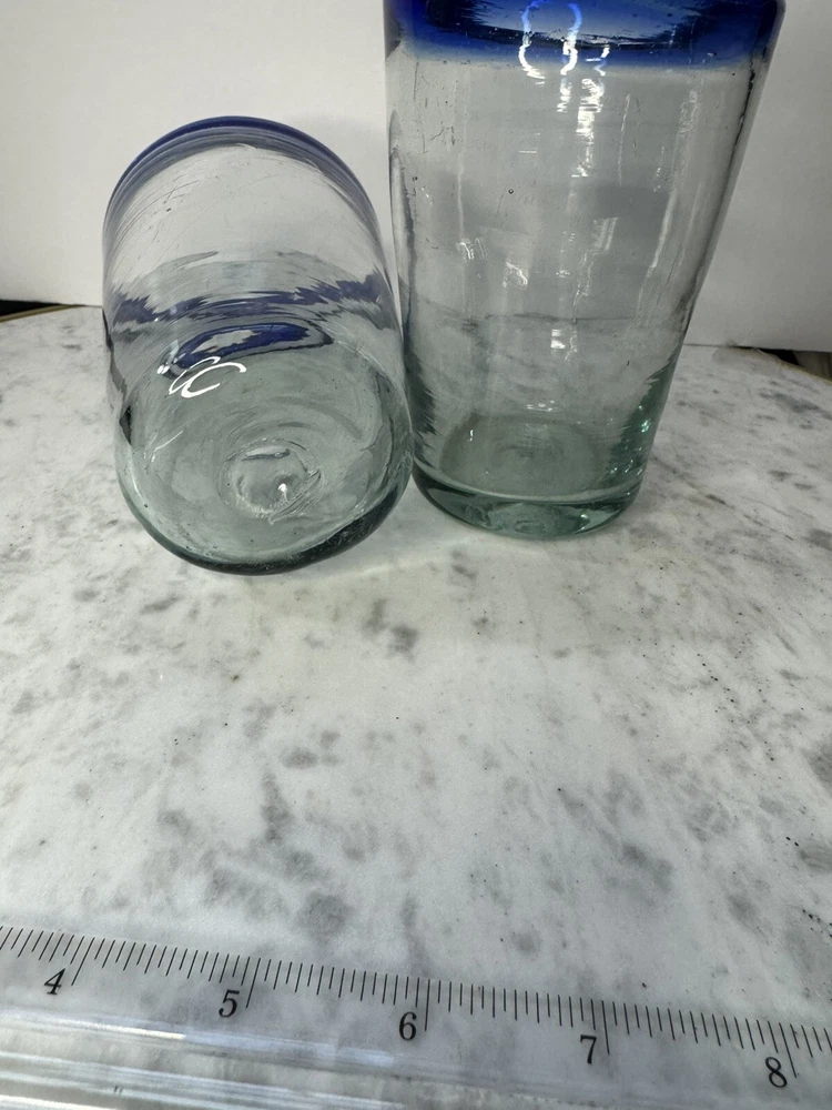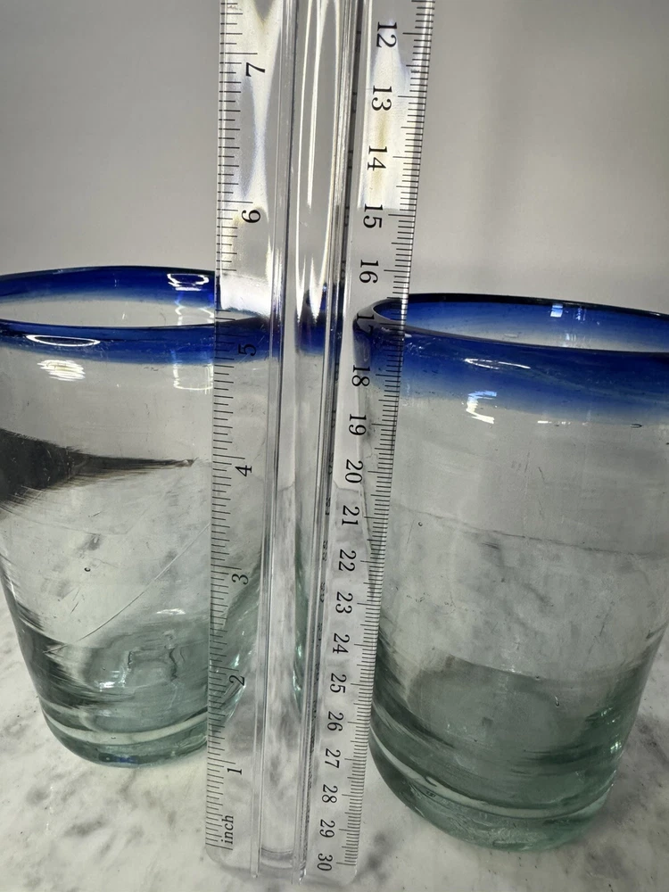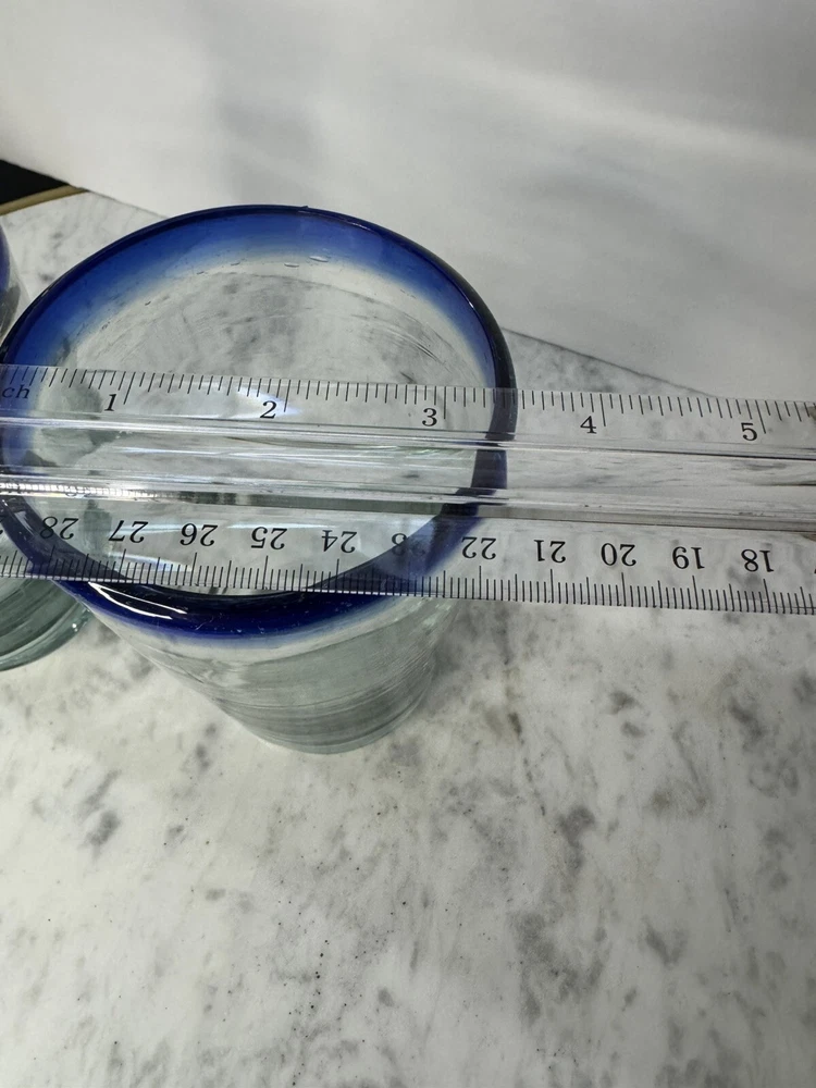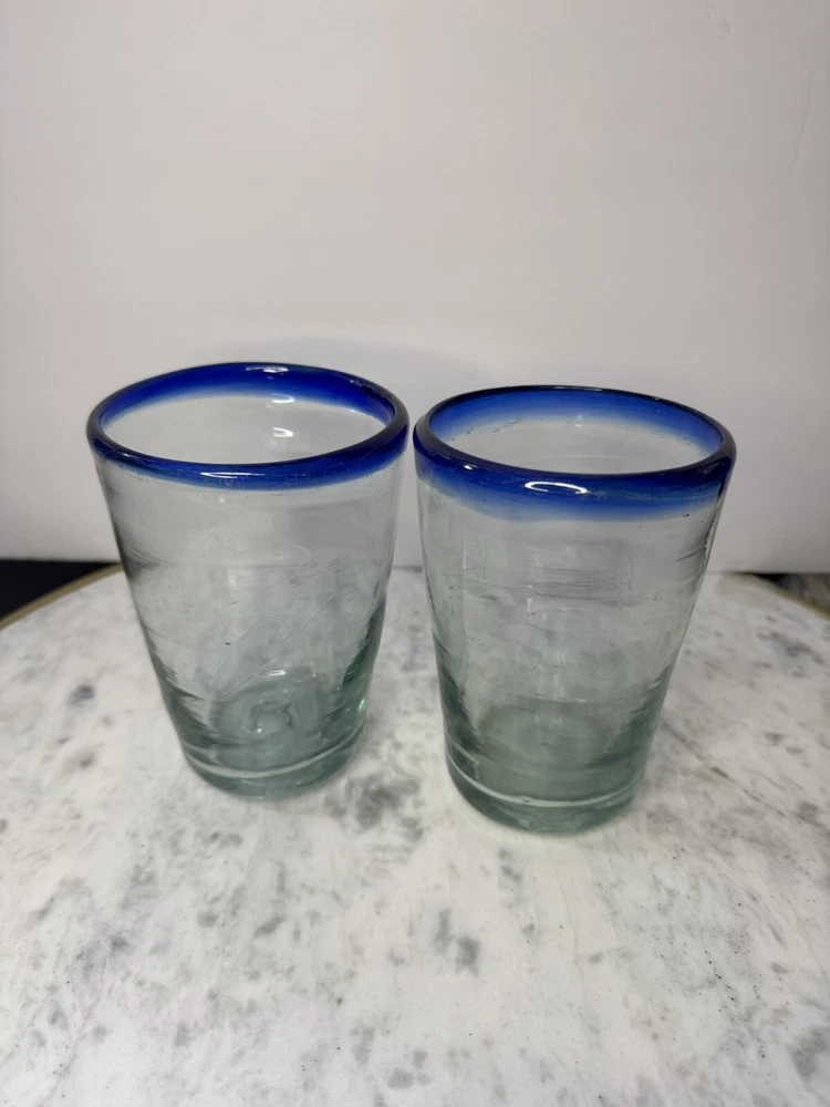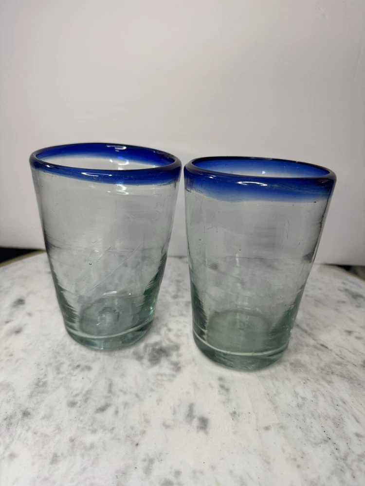 Upgrade your drinkware collection with this stunning Mexican hand-blown tumbler. The clear glass tumbler is beautifully adorned with a vibrant cobalt blue rim, adding a pop of color to your beverages. This vintage/retro style tumbler has a capacity of 16 oz. and stands at 5 inches tall, making it perfect for all occasions. Crafted in Mexico, this tumbler is made of high-quality glass and features a round shape. This two-piece glassware set is perfect for juice glasses, iced tea glasses, highball glasses, cocktail glasses, and drinking glasses. The tumbler is not personalized and is ideal for food and drink themes. Get your hands on this exquisite tumbler and enjoy your favorite beverages in style!