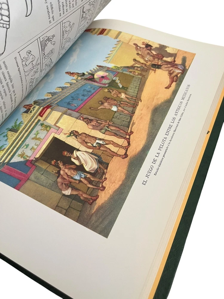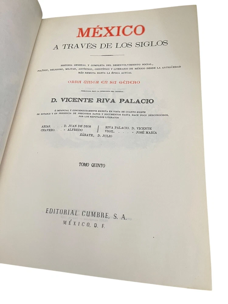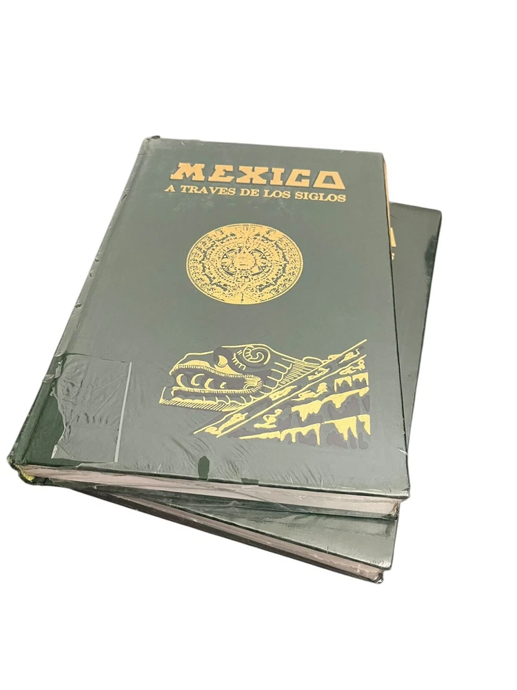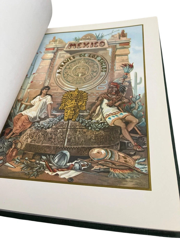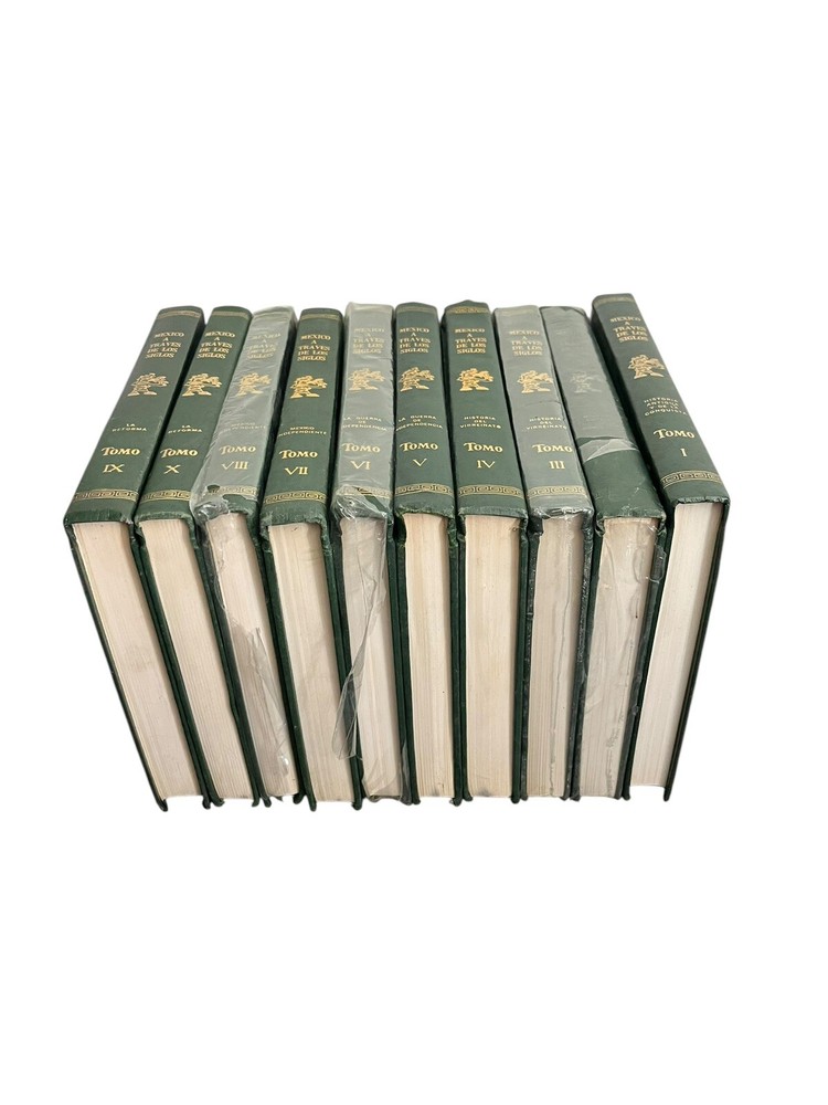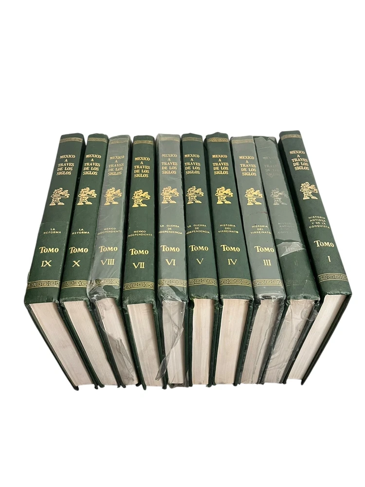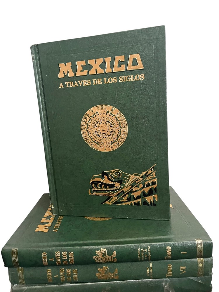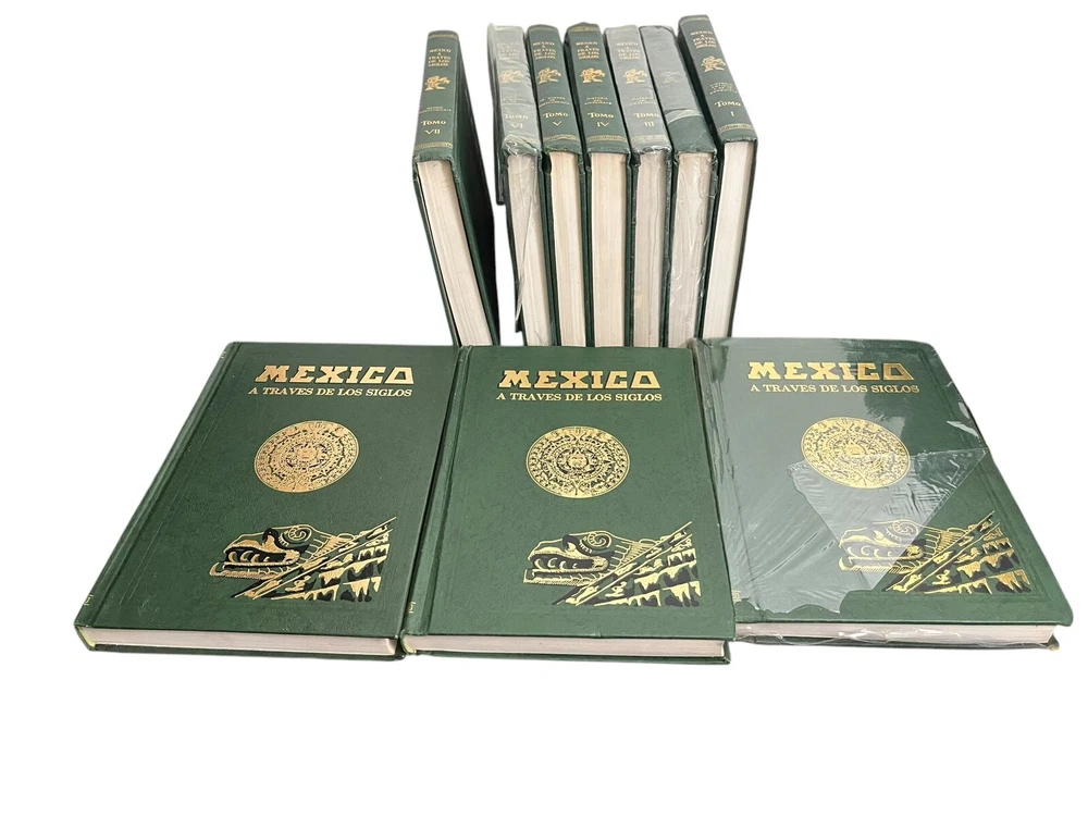 Mexico A Traves de Los Siglos: 10 Volumes by Palacio, Vicente 1981 Ed. (Spanish) COMPLETE SET 1981 Decimoseptima Edicion (17th edition) All volumes entirely in Spanish A Rare beautiful set full of color plates and black & white illustrations with lots of historical information Thick Green-Leather bound hardcover volumes stamped with gold gilt to front and spines Rather large books. Each volume measures 12.25 in x 8.75 in and weight roughly 3 1/2 lbs each. México a través de los Siglos. México: Editorial Cumbre, 1981. Historia General y Completa del Desenvolvimiento Social, Político, Religioso, Militar, Artístico, Científico y Literarrio de México desde la antigüedad más remota hasta la época actual. Obra única en su género. Con ilustraciones intercaladas en el texto y láminas en color. Encuadernados en pasta dura. Total de piezas: 10. Complete Rare set