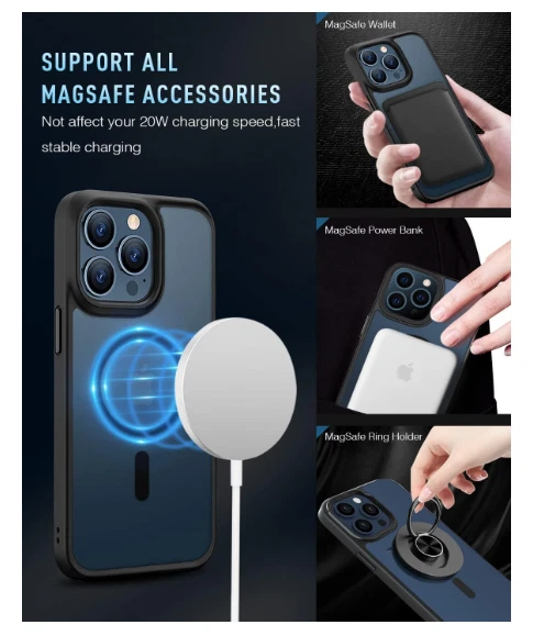 New MGNAOOI Qi Wireless charging case for iPhone 13 Pro Product Details: [Super Magnetic Attraction] Particularly designed for iPhone 13 Pro, the phone case is compatible with Magsafe chargers and other Qi Wireless chargers without signal influence. Built-in strong magnet, the iPhone 13 Pro phone case will not fall off no matter how it rotates with super adsorption capacity. The perfectly aligned magnetic attraction makes wireless charging faster and more stable. [20W Quick Charging Experience] Perfectly aligned magnets make wireless charging faster and easier than ever, providing a magical attach and detach charging experience, which is good news for players who play mobile games. [8Ft Military-grade Drop Protection] MGNAOOI compatible for iPhone 13 Pro Case ensures your iPhone is safe when it drops 5000+ times from 8 FT height. It also comes with 4 corners patented dispersion airbags and upgraded impact-resistant technology. [Anti-Scratch & Anti-fingerprint] The matte back stays clean with a smart Nano Oleophobic Coating design that prevents fingerprints, watermarks, oil, and dust. Meanwhile, the MGNAOOI case for iPhone 13 Pro also brings you excellent skinny touch. [Screen & Camera Guard] The MGNAOOI shockproof compatible for iPhone 13 Pro Case provides 3 mm Camera Lips and 1.5 mm Screen Lips, which help prevent your iPhone 13 Pro from rubbing against surfaces that leave permanent scratch marks.
