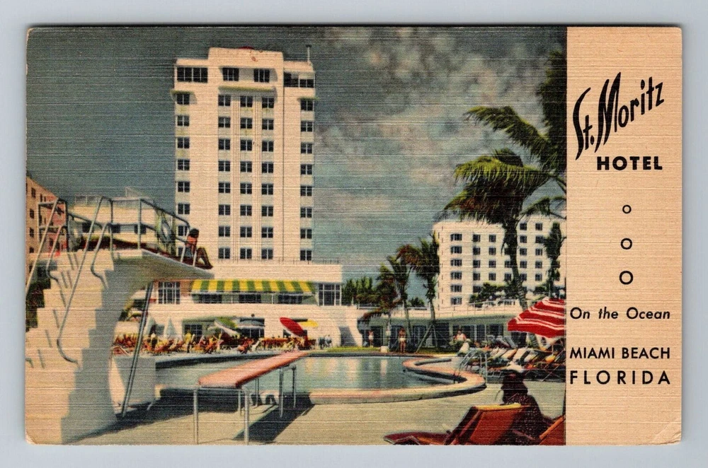 Miami Beach FK-Florida St. Moritz Hotel Pool Scene Antique Vintage Postcard