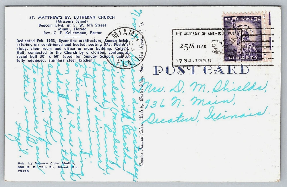 Welcome to People and Places of The Past! Come take a look into generations past of real people and places throughout the world that were photographed by many great people and studios. Here you will find unique antique photographs, real photo postcards, and other vintage postcards that can be used for collecting, genealogy, or crafting. Many of these historic photographs are rare, hard to find, and are one-of-a-kind images that cannot be found any where else. Please contact us if you have any questions about our listed images. Thank You! Miami FL-Florida, St. Matthew's Evangelical Lutheran Church, Vintage Postcard This rare and hard to find vintage, antique post card is in good, posted condition. It is 65 years old! Please see high resolution scans of the front and back of this card closely for detailed cosmetic condition. This post card measures 3.50 inches x 5.50 inches. Vintage post cards can show normal signs of wear associated with an old post card including folds, creases, holes, stains, rips, scratches, worn edges, fading, crackling, handwriting, postage cancellations, postage stamps, being put into or taken out of old postcard albums, or other damage. They will have imperfections from being handled or from being mailed. Please visit our other listings for more unique and one-of-a-kind images of People and Places of The Past! We try our best to represent the item in the images as accurately as we can. However, due to variations in color from image scanners, computer screens, and cell phone displays, the color may be slightly different than the color of the actual product. This post card will be shipped to you packaged well inside of a clear plastic sleeve, inside of a rigid stay flat envelope to keep the card flat and to protect the card during shipping. Shipping within the United States. Your post card will be delivered to the post office the same day or the next business day after receiving payment. Returns are accepted within 30 days. Each item is inspected, packaged, weighed, and sealed individually for FAST SHIPPING! Thank You for visiting People and Places of The Past!