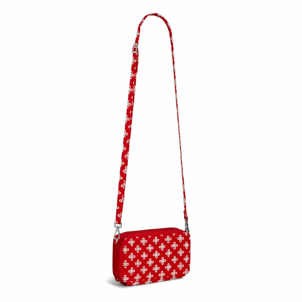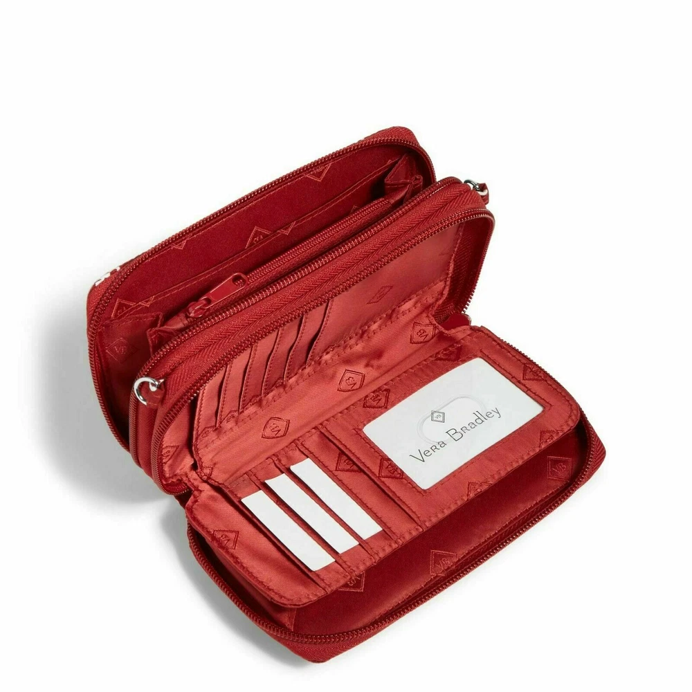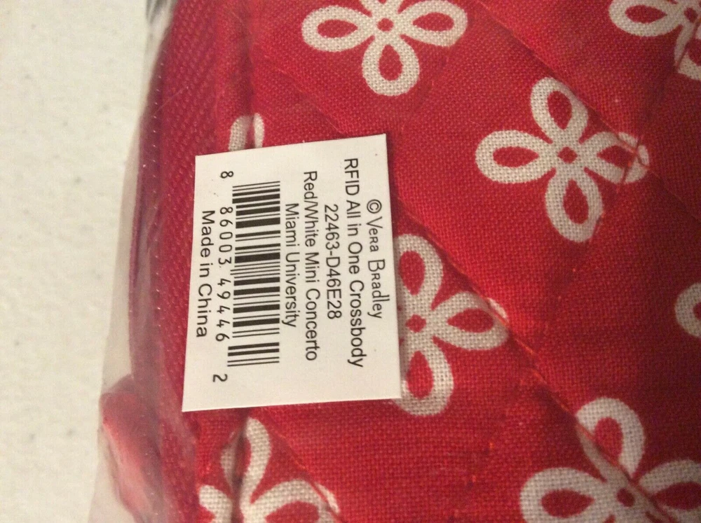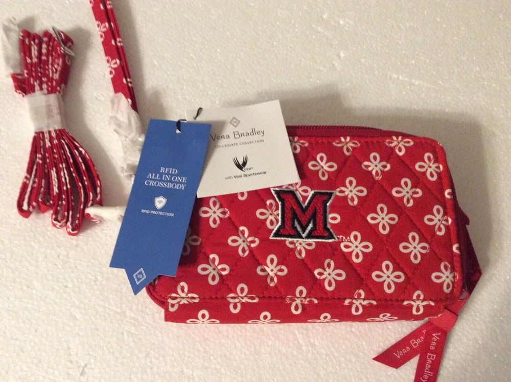 RFID All in One Crossbody Bag Wallet Red & White ~ Miami of Ohio University Logo M in Mini Concerto Product Description Item: Collegiate RFID All in One Crossbody Bag in signature cotton This is the one you’ve been waiting for! With a place for everything - cards, money and even your phone - this little crossbody truly holds it all. Plus, with its removable shoulder strap and removable wrist strap, it offers the ultimate in versatility. Wear it as a crossbody, carry it as a wristlet or use it as a wallet. Official Collegiate Licensed Product Vera Bradley's quilted cotton is colorful and lightweight Provides RFID protection for credit and debit cards Exterior features a phone slip pocket Interior features eight card slips, six slip pockets, one bill pocket, one zip pocket and one ID window Zip and magnetic closures Dimensions: 6.50" w x 3.75" h x 2.00" d with 6.00" removable wrist strap; 52.00" removable, adjustable strap If you remove both straps then its a wallet SKU# 22463D46E28 UPC# 886003494462 Product Fabric Details Signature Cotton - The colorful and lightweight cotton you know and love, refreshed for a modern feel. Packable and detailed with expressive pattern options, this fabrication is a smart pick for your go-to favorites. ANY QUESTIONS PLEASE ASK This item is new. We had a brick and mortar store that we closed and we are listing everything on eBay. If you are looking for anything please ask. If we have we will list it and notify you first. Please CLICK ON the link below to go to MY EBAY STORE: https://www.ebay.com/str/Longaberger-Vera-Bradley-Coach-ETC To see many more items. We have lots of items not yet listed. So if you are looking for something and can’t find it then send an email and we will let you know if we have it and then we will get it listed. You can scroll down the left side of the page to find the items that you want to look at. We have Dinnerware ~~ Longaberger, Pfaltzgraff, and Corelle. We have Purses and Travel items in Vera Bradley, Longaberger, and Coach We have Baking items -- Longaberger, Pfaltzgraff, and Pyrex We have all types of Clothing items and Shoes TERMS: FOR BUY IT NOW: Immediate Payment FOR AUCTIONS: Payment must be received within 24 hours after auction close. If no payment is received, We will request refund from eBay for our fees; eBay will record a strike against you; The item will be re-auctioned. SHIPPING: WE ONLY SHIP TO CONFIRMED ADDRESSES. PLEASE INCLUDE YOUR PHONE NUMBER. I USE ONLINE FEDEX OR UPS SHIPPING FOR HEAVY ITEMS AND A PHONE NUMBER IS REQUIRED. Items marked as free ship with FedEx or UPS can only be shipped in the continental United States. Contact us if you want this shipped to Alaska, Hawaii or a Post Office Box REFUNDS: If you return items then they must be returned in the same condition that it was shipped. For instance. If the leather purses had protective covering then it must be returned in the same condition. If an item had a box then the original box must be returned without damage. If the item is not returned in the same condition then we have the option of deducting fees up to 50%