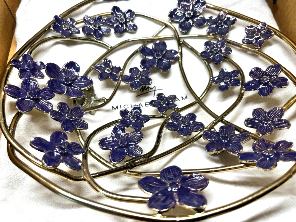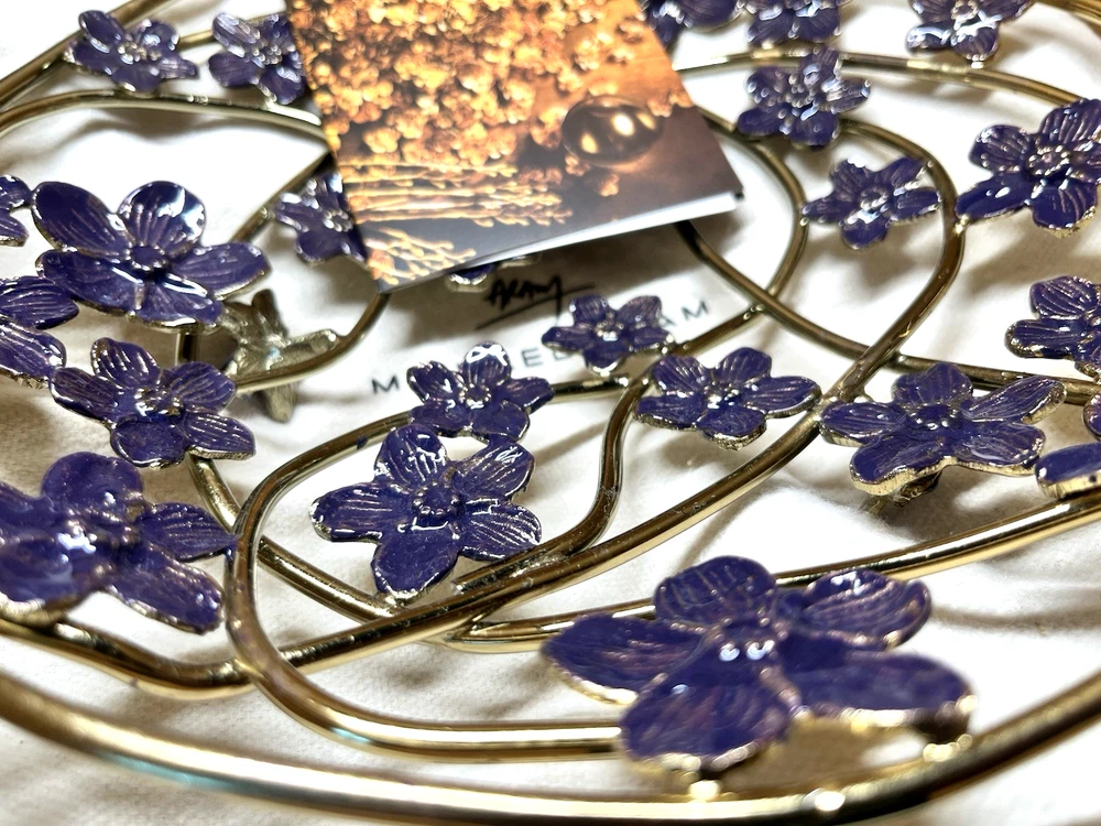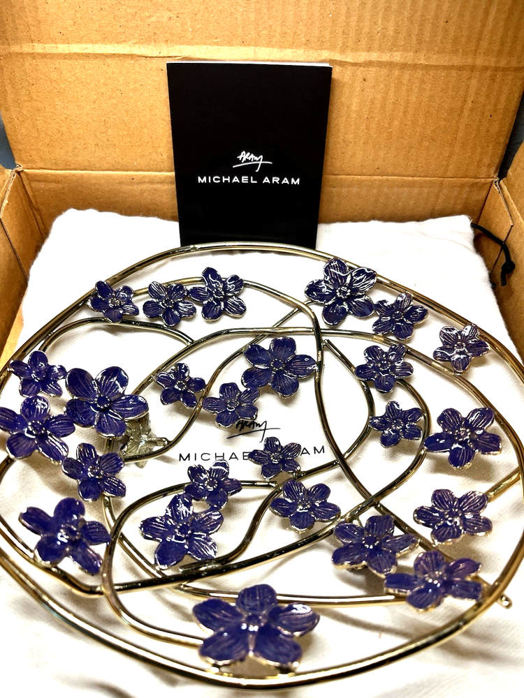 Michael Aram Forget Me Not Decorative Bowl. Elegant handcrafted piece made from natural brass with a detailed enamel finish. Beautiful floral design inspired by the Forget Me Not motif — symbolizes love, memories, and renewal. Features: Authentic Michael Aram collection Natural brass with enamel accents Approx. size: 9.5" x 9.5" x 2.5" Handcrafted artistic detailing Perfect as a centerpiece, décor accent, or gift Ships fast and securely packed. Ideal for home décor lovers and collectors.
