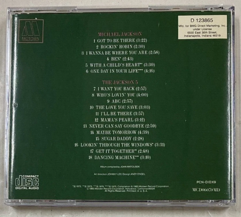 Case Type: Jewel Case: Standard Genre: Funk, Pop, R&B & Soul, Soul Format: CD Artist: Michael Jackson, The Jackson 5 Catalogue Number: MCD06070MD Language: English Style: 1970s, 1980s, Classic R&B, Pop R&B, Vocal Case Condition: Near Mint (NM or M-) Country/Region of Manufacture: United States Features: Compilation, Import Edition: Greatest Hits, Club Edition CD Grading: Near Mint (NM or M-) Release Title: 18 Greatest Hits Record Label: Motown Type: Album Seller Notes: “CD and case are in near mint condition.” Inlay Condition: Near Mint (NM or M-)