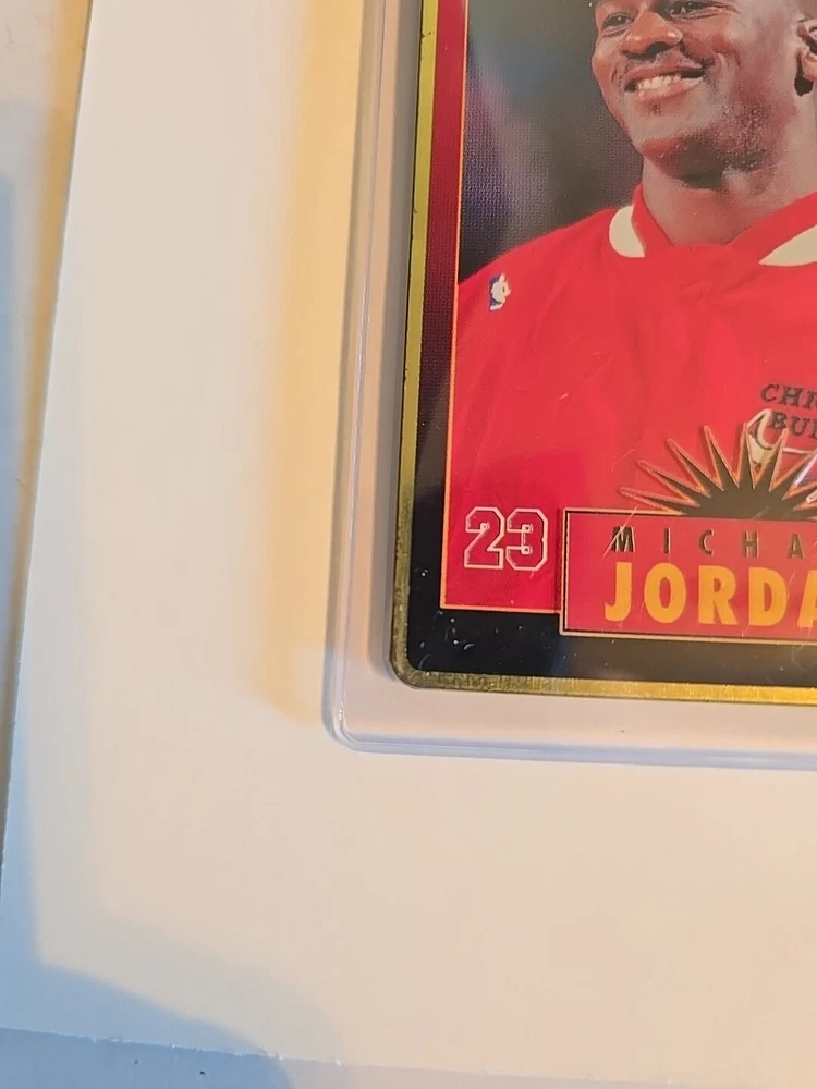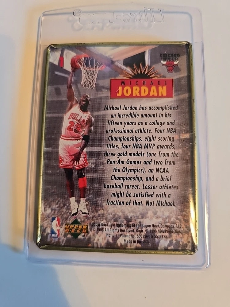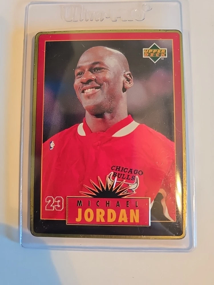 This Michael Jordan All Metal Upper Deck 1996 Card is a must-have for any basketball fan. The card features a stunning image of Jordan in action, with a metal finish that adds a unique touch to the design. The card is an original from the 1996 Upper Deck Metal set, and is in excellent shape for its age. The card is a collectors edition and is perfect for any sports trading card collector. Add this rare and valuable card to your collection today!