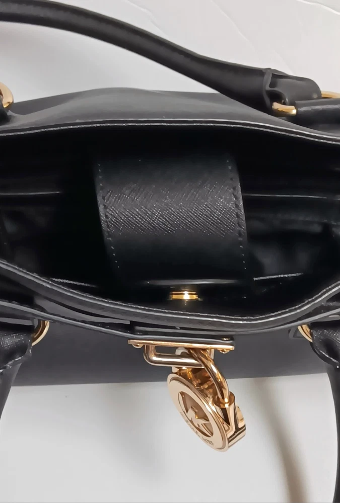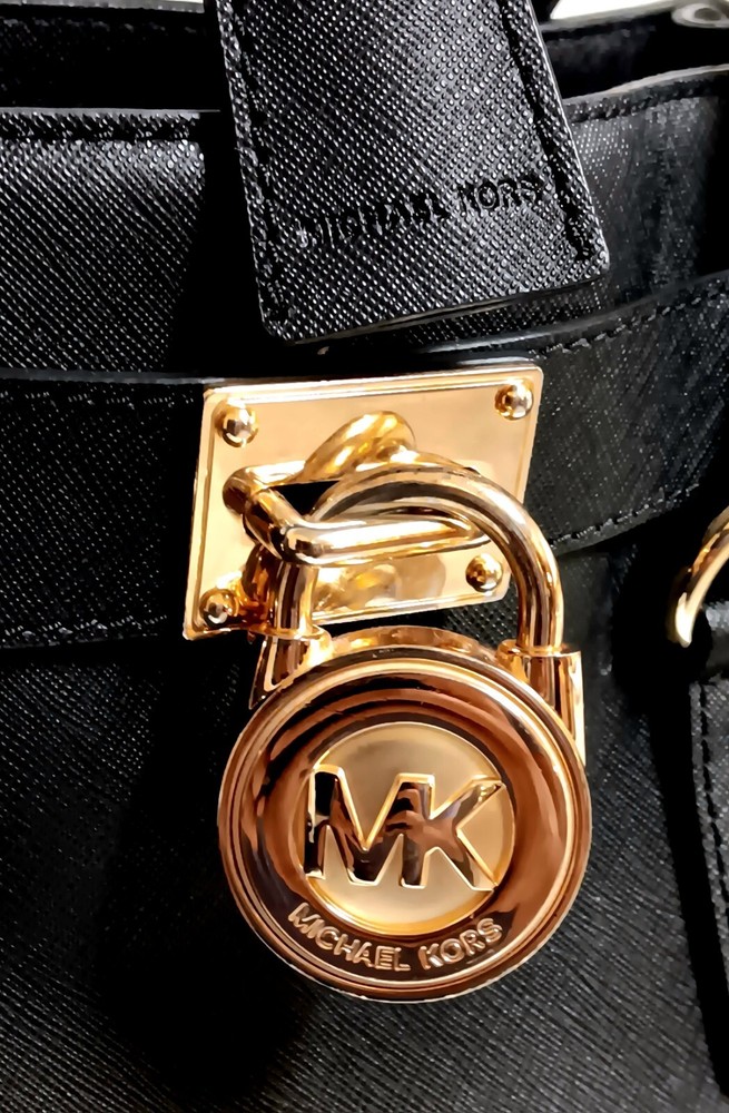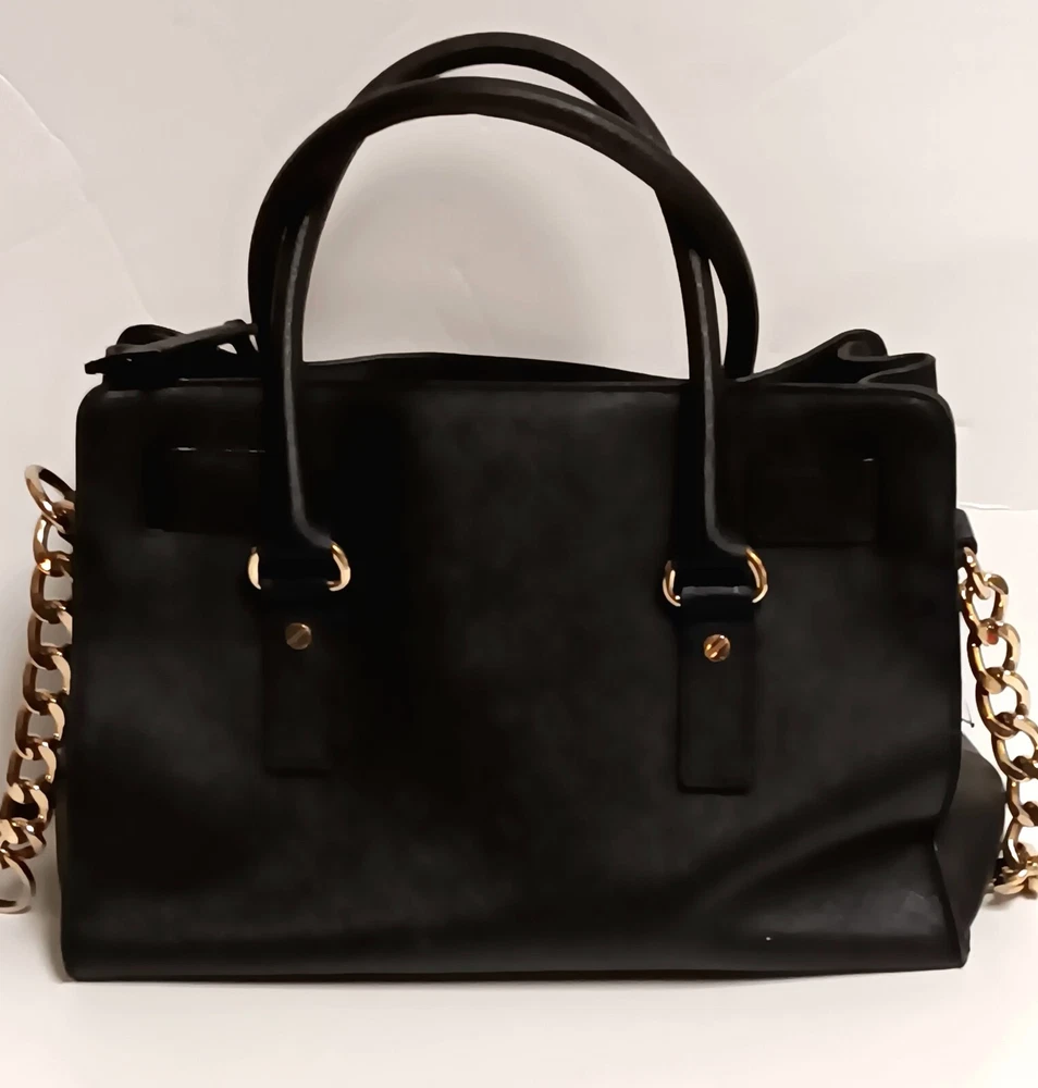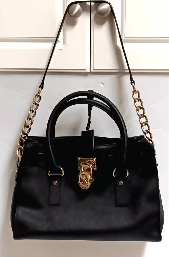Michael Kors Purse Black Hamilton Satchel Tote Shoulder Bag Gold Chain & Lock With Key. Gently pre-loved good clean condition. I purchased this purse and a caramel brown one approximately in 2017 or 2018 from Dillard's. The purse measures approximately 12"L X 9"H X 5"W. Unsure of the outer material, which feels like a man-made synthetic leather. The key for the padlock is inside the black hang tag on the carry handle. The chunky gold chain shoulder strap is not removable on this particular design. There is also a keychain attachment strap inside of the purse. It weighs approximately 2.8 lbs empty. See photos.