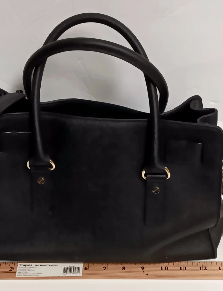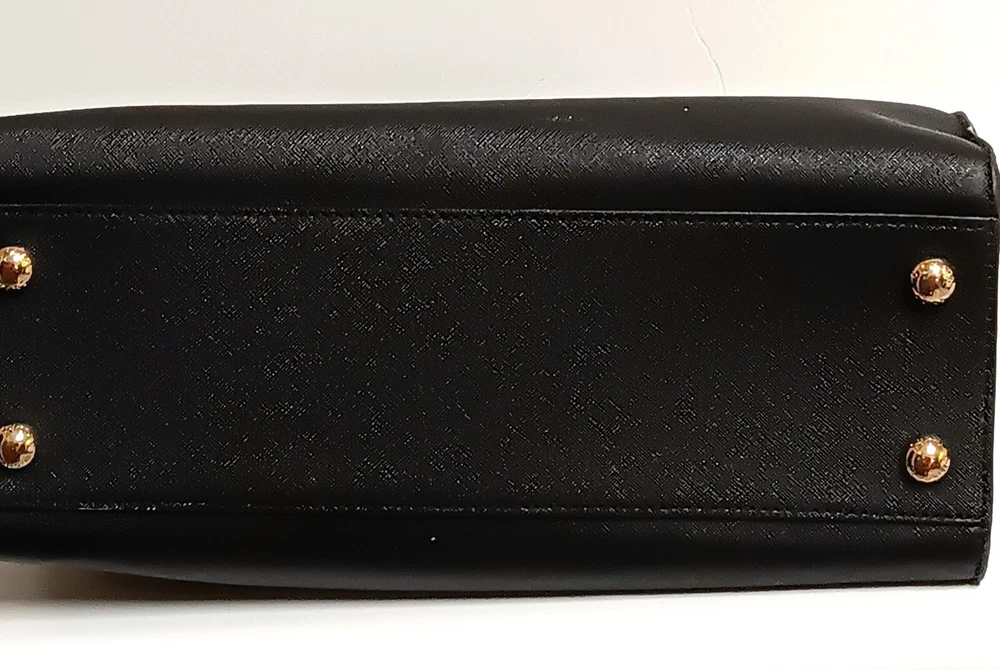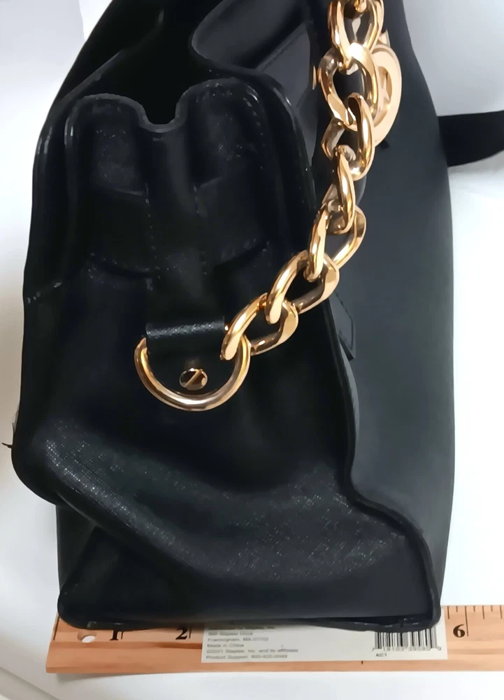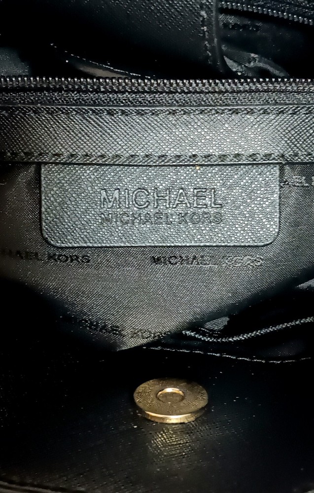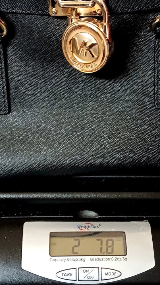 Michael Kors Purse Black Hamilton Satchel Tote Shoulder Bag Gold Chain & Lock With Key. Gently pre-loved good clean condition. I purchased this purse and a caramel brown one approximately in 2017 or 2018 from Dillard's. The purse measures approximately 12"L X 9"H X 5"W. Unsure of the outer material, which feels like a man-made synthetic leather. The key for the padlock is inside the black hang tag on the carry handle. The chunky gold chain shoulder strap is not removable on this particular design. There is also a keychain attachment strap inside of the purse. It weighs approximately 2.8 lbs empty. See photos.