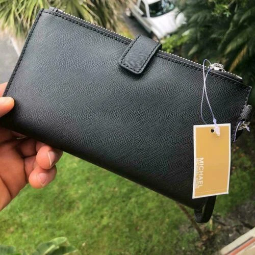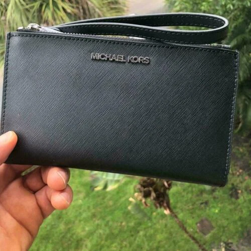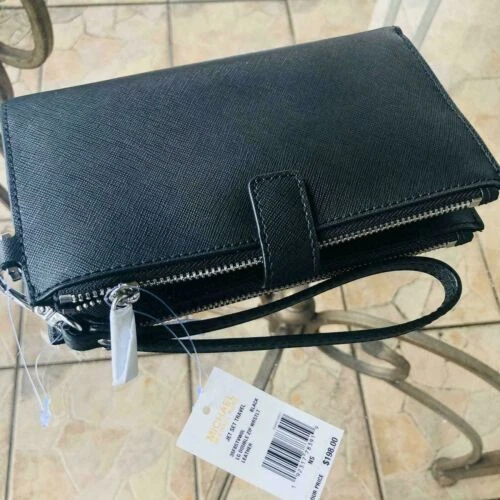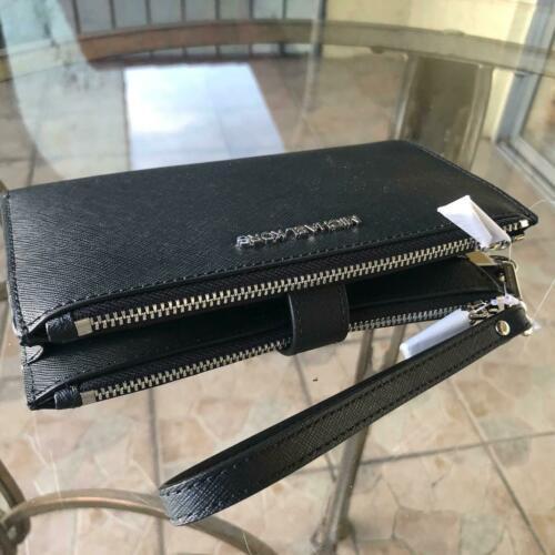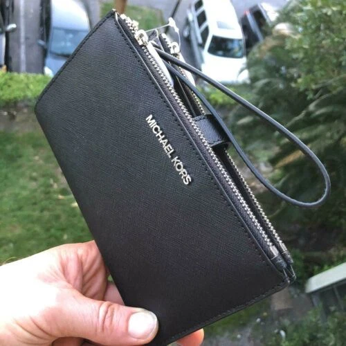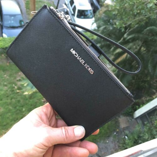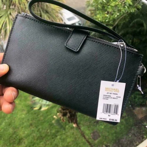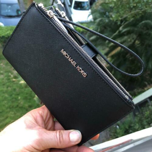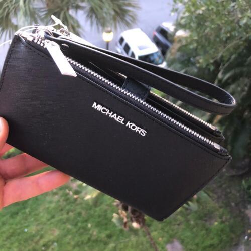 100% Authentic or your Money Back===Always Michael Kors Jet Set Travel Double Zip Wristlet Black Saffiano Leather With Silver Tone Hardware Michael Kors Logo On Front Double Zip Closure for 2 Compartment with Snap Closure Custom Fabric Lining 6 Card Slots, 2 Zipper Pockets 2 Full Length Slip Pockets Phone Pocket 7.25"(L) X 4.25"(H) X 1"(D) Strap: 6" Powered by ExportYourStore.com