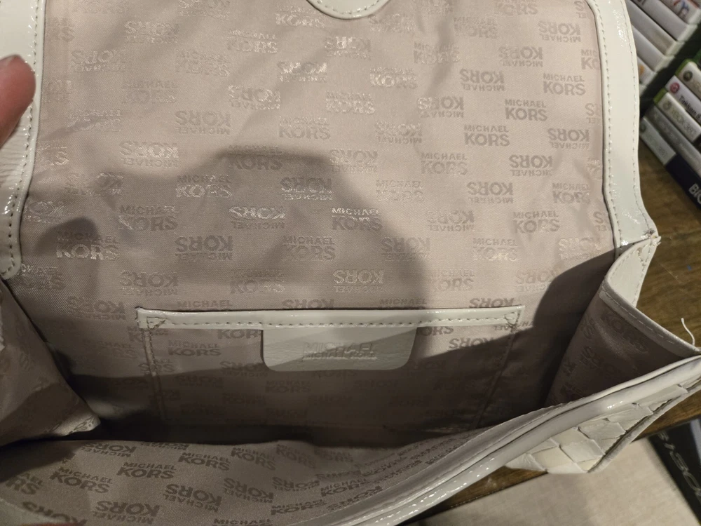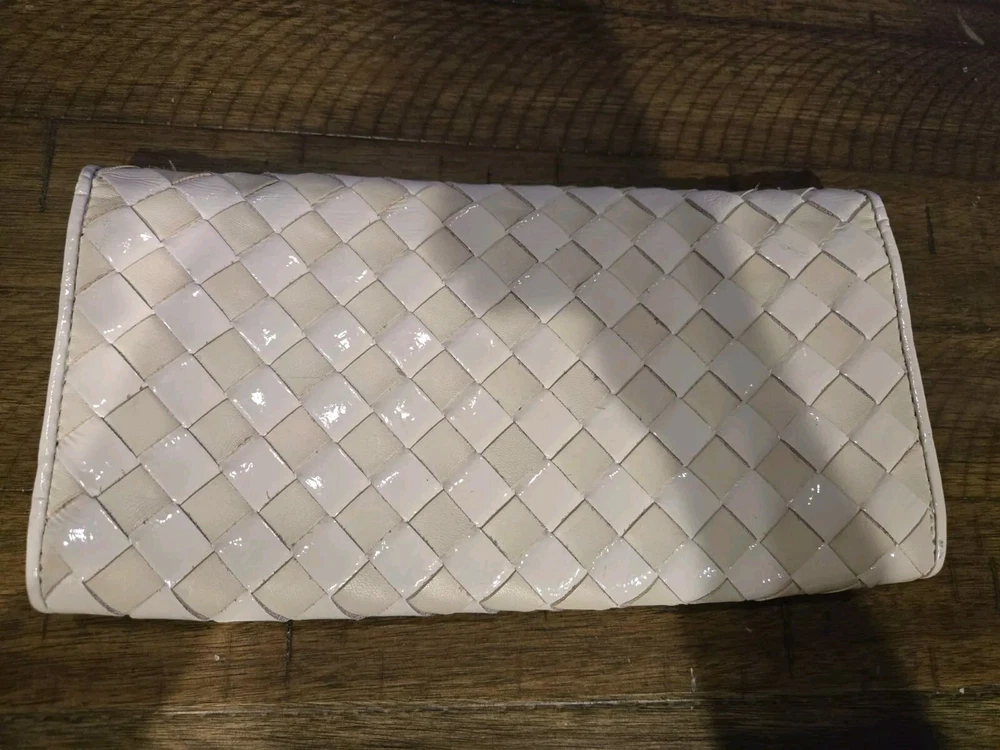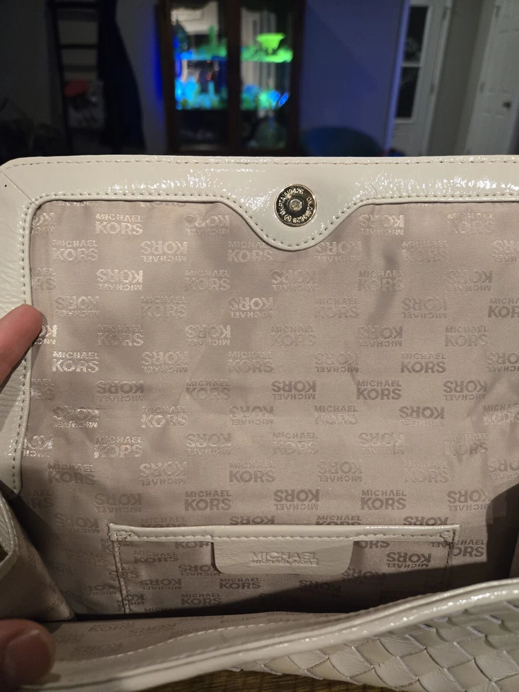 This Michael Kors Jet Set cream leather hand underarm clutch features a beautiful basketweave pattern and a snap closure for easy use. The gold hardware adds a touch of elegance to the design. The lining is made of white and tan fabric, complementing the exterior color and style. This medium-sized clutch is perfect for any occasion and is a must-have for any Michael Kors fan. It is made of genuine leather, ensuring durability and quality. The product line is Jet Set, known for its stylish and luxurious designs. Add this stunning clutch to your collection today!