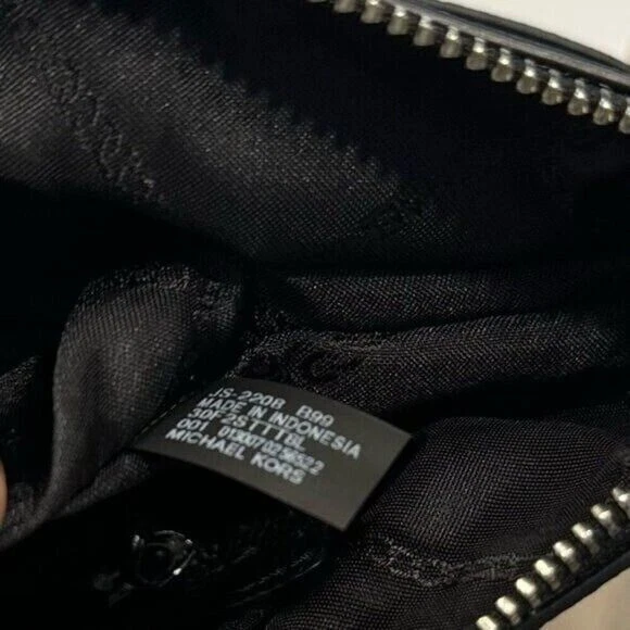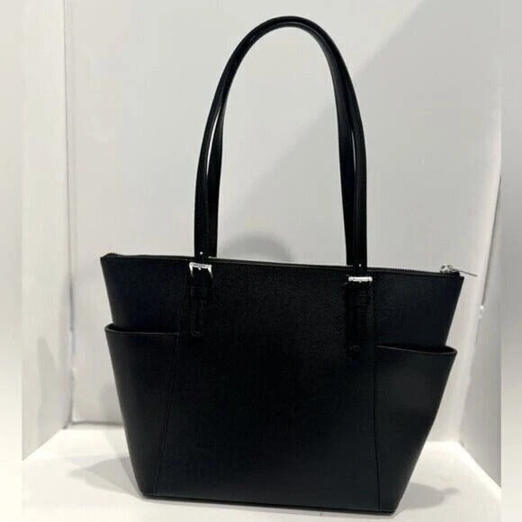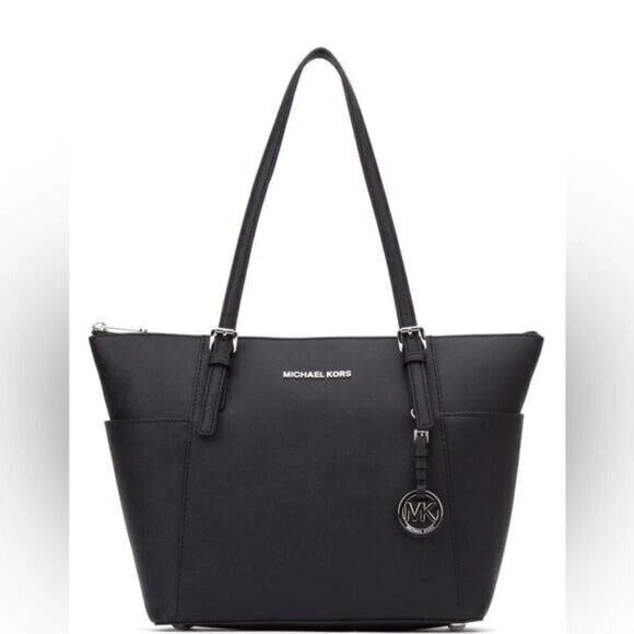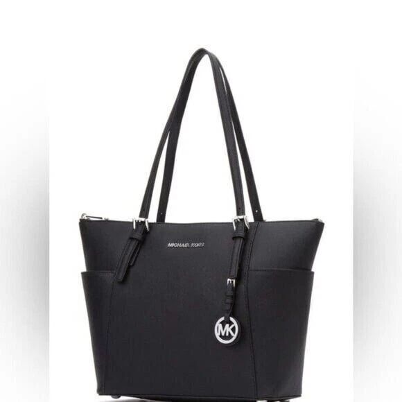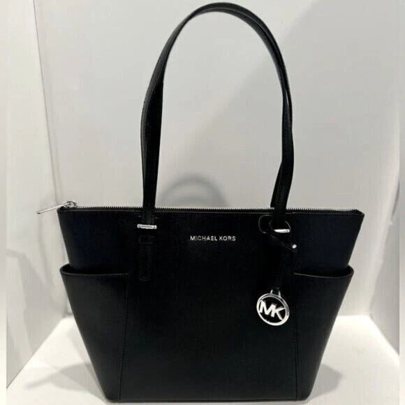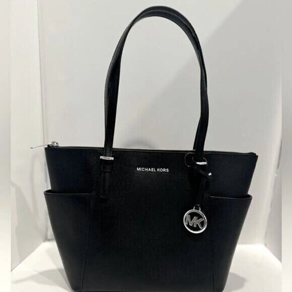 DESCRIPTION Item #04090941 From Michael Kors, the Jet Set East West Silver Tone Logo Charm Tote Bag features: Saffiano leather Silver-tone hardware Top zip closure MK logo charm Zip pocket, three slip pockets, cell phone pocket, and key fob inside 2 end slip pockets outside Double top handles Approx. 14" L x 9" H x 3.5" W bag; 9" handle drop Listing and template services provided by inkFrog