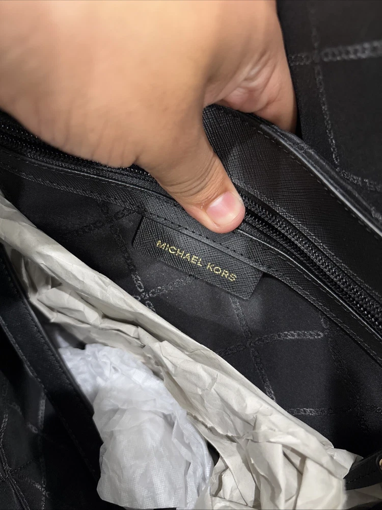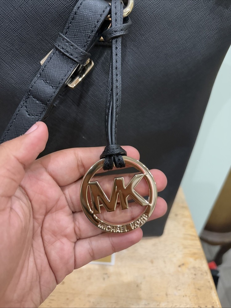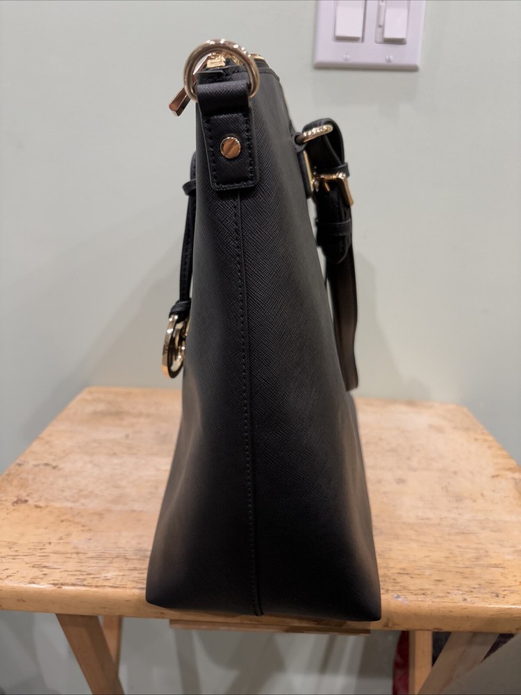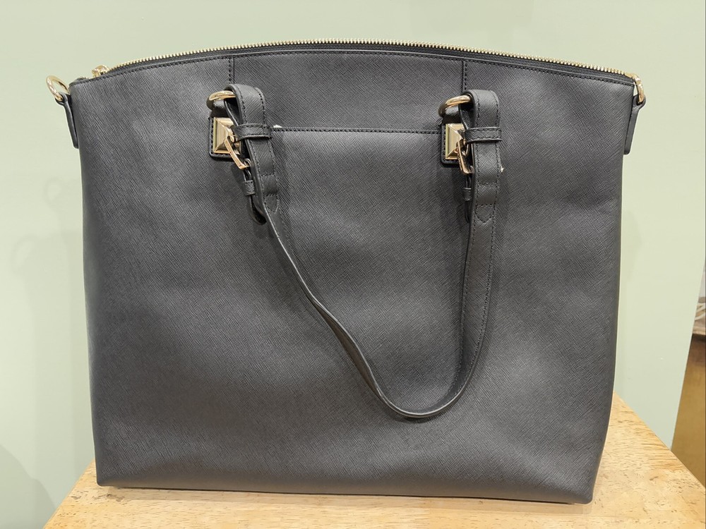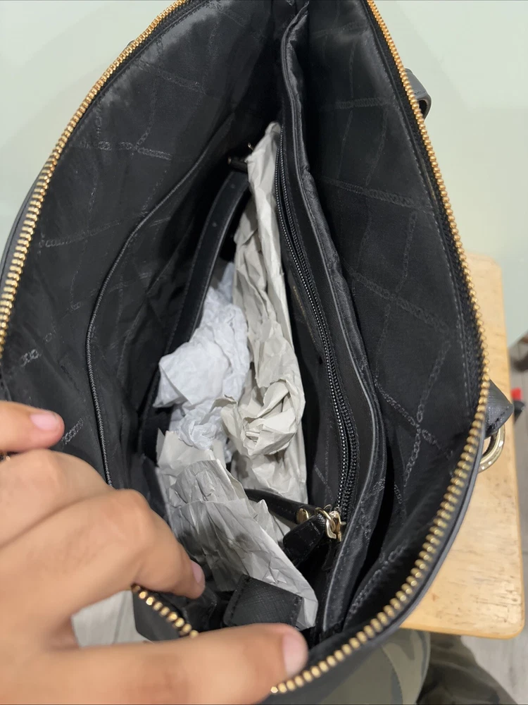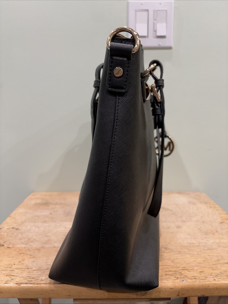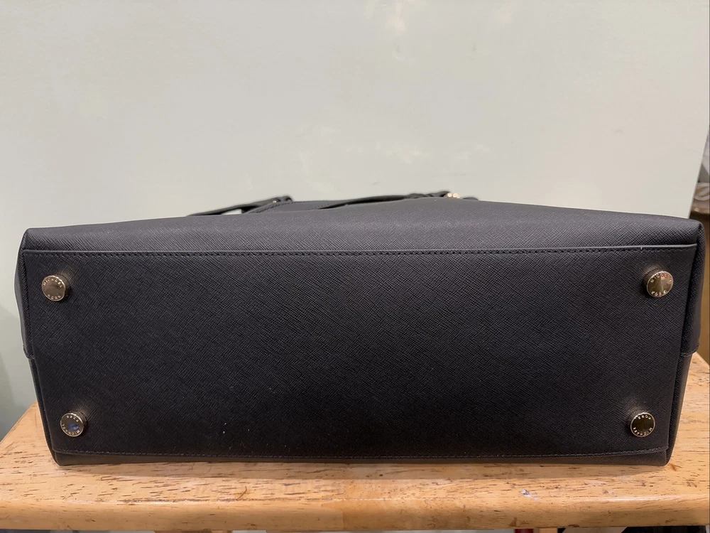 Michael Kors Karla Large Saffiano Black Leather Zip Top Handbag Luggage Tote. Condition is Pre-owned. Shipped with USPS Ground Advantage.