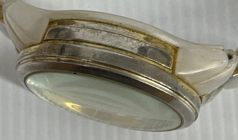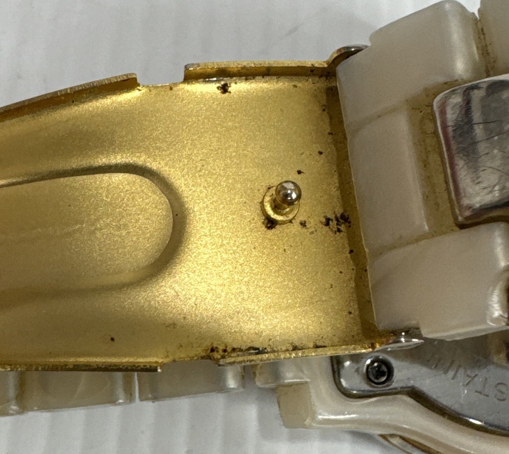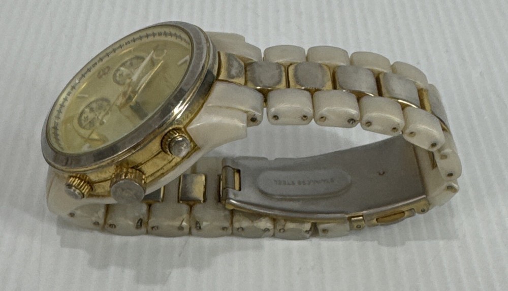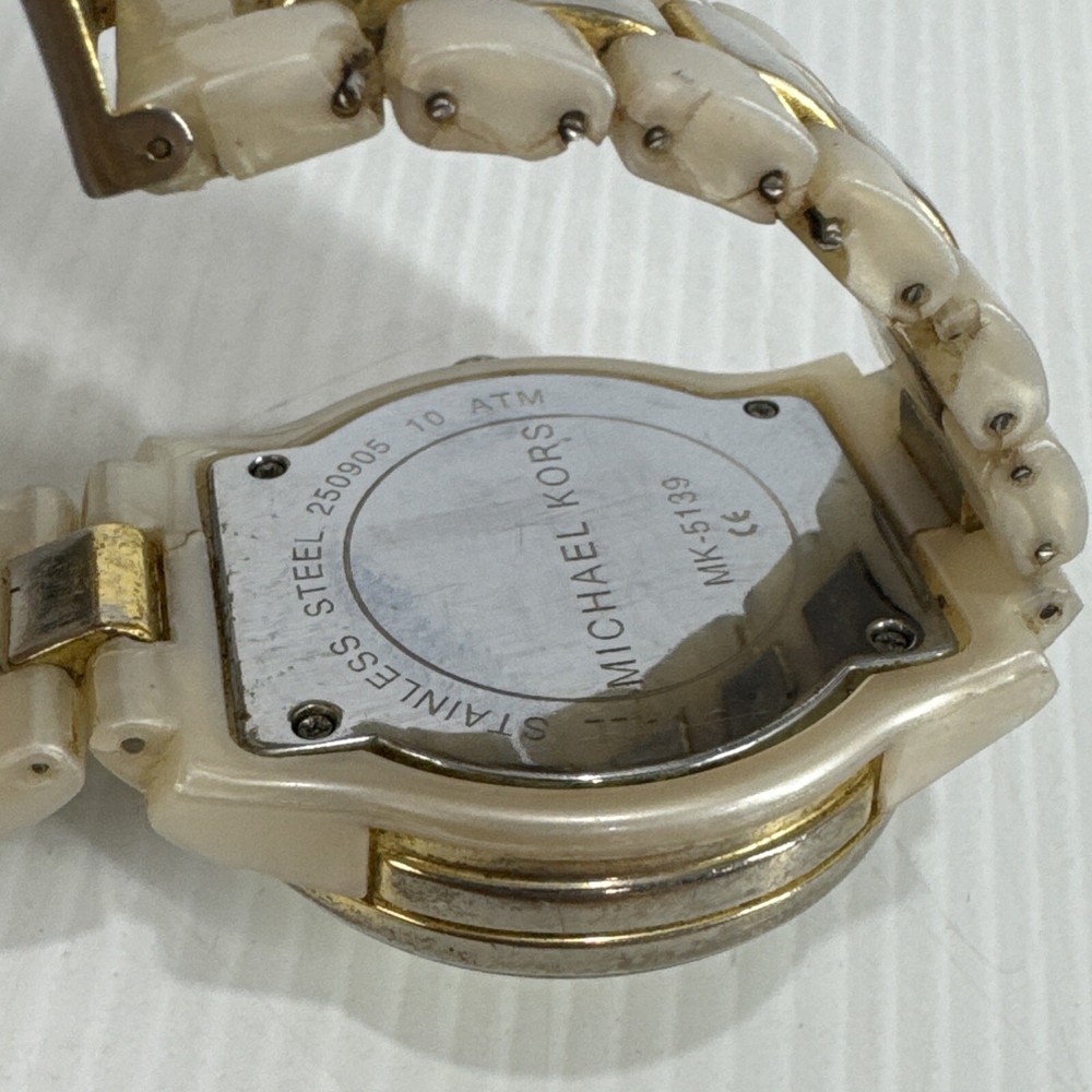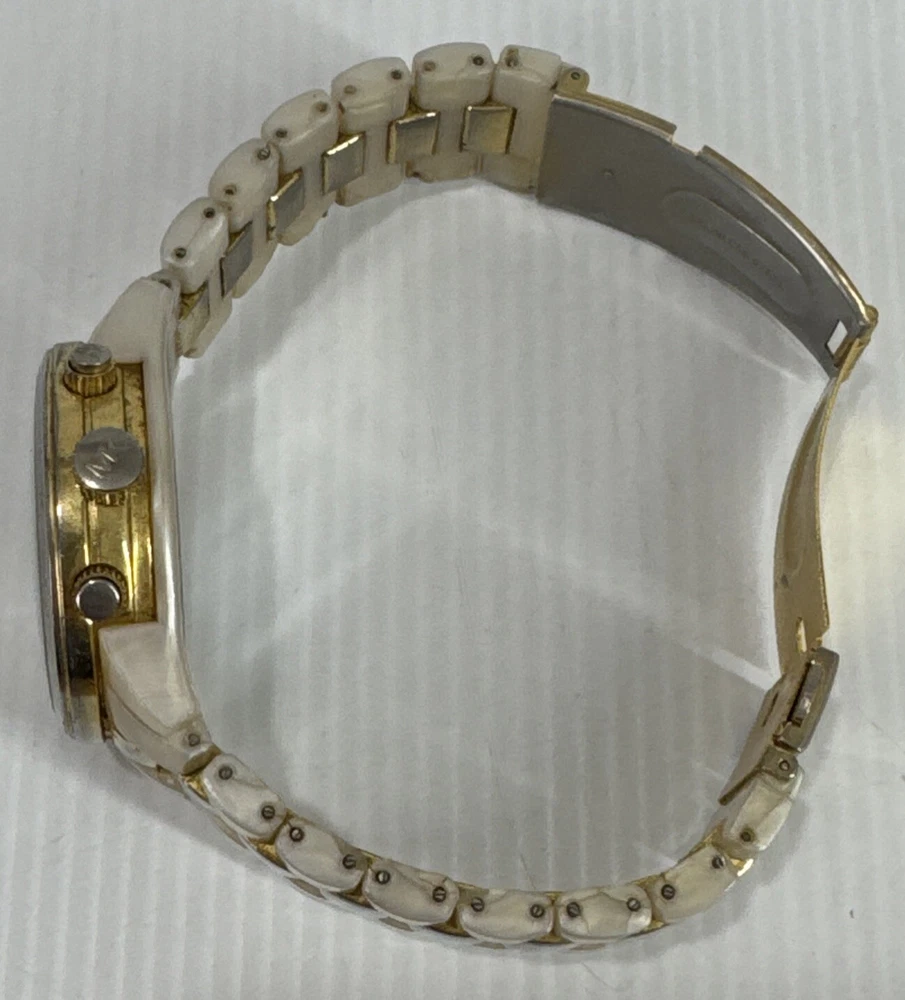 Elevate your timepiece collection with the Michael Kors MK 5139 Chromograph Ceramic Strap Gold Ladies Watch, a harmonious blend of classic style and modern craftsmanship. The watch showcases a sleek round ceramic case paired with a matching cream ceramic bracelet, exuding an air of sophistication that's both timeless and contemporary. The gold dial is accented by practical features, including a date indicator and luminous hands, ensuring both functionality and elegance. Designed for the discerning woman, this wristwatch offers a comfortable fit and a secure tri-fold clasp closure. The quartz movement ensures precise timekeeping, while the analog display provides a clear view of the time. This Michael Kors watch, crafted with attention to detail, is a perfect accessory for any occasion, seamlessly transitioning from daywear to evening attire. Watch has mark and wear & tear Selling as is Works