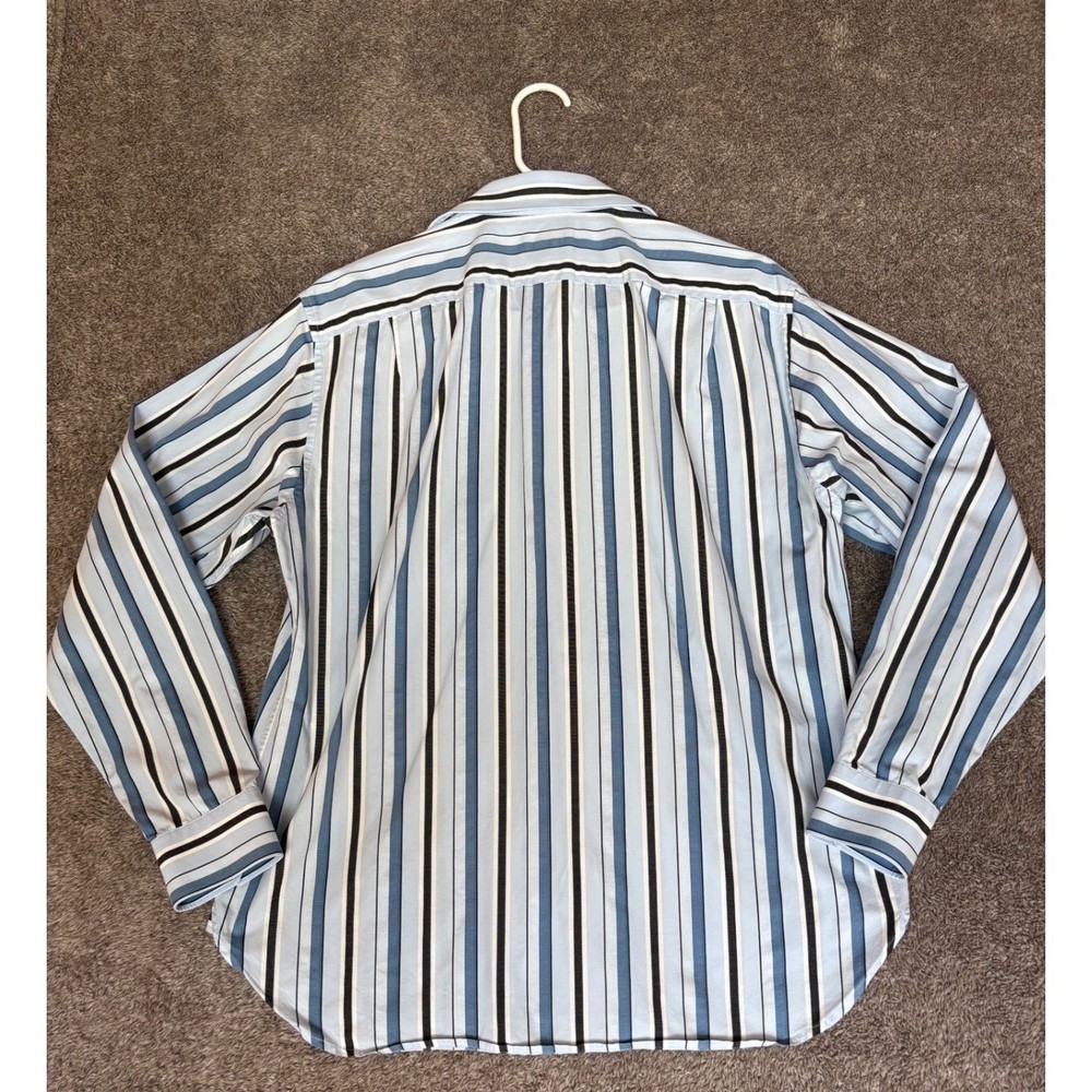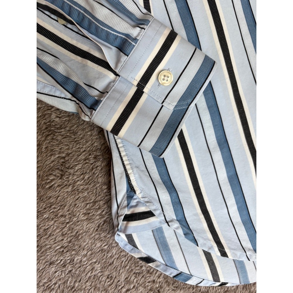 A classic men's long-sleeved button-down shirt in a refined stripe pattern. This collared shirt offers a sharp and sophisticated look. Its versatile design makes it an excellent choice for a business casual office environment, a smart dinner outing, or as a stylish addition to a weekend ensemble. Department: Men Sleeve Length: Long Sleeve Pattern: Striped Type: Dress Shirt Collar Style: Button-Down Material: Cotton Blend Top Cuff Style: Barrel Cuff Neckline: Collared Length: 27" Pit-to-Pit: 21" Keywords: Michael Kors shirt, Men's dress shirt, Striped button down, Long sleeve shirt, Men's fashion, Business casual, Smart casual wear, Designer shirt, Blue and black stripes, Menswear, Collared shirt, Office attire, Weekend style, Fashionable shirt