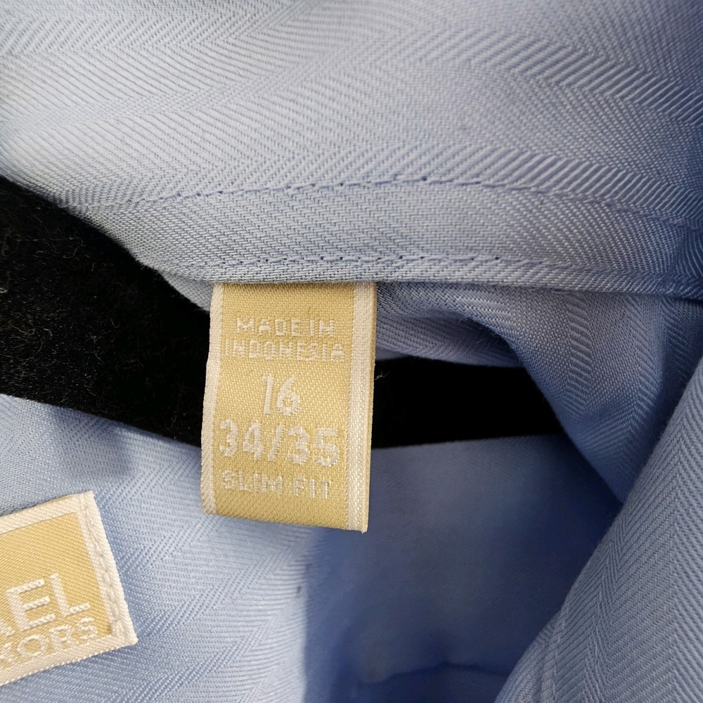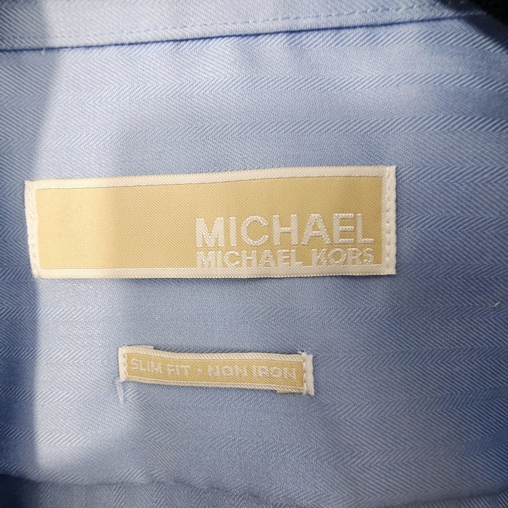 Michael Kors Mens Button Up Shirt Size 16 34/35 Blue Slim Fit. Excellent pre-owned condition. No rips, tears or stains. See photos for best representation. Measures: Length 30" Width 22" Sleeve 26"