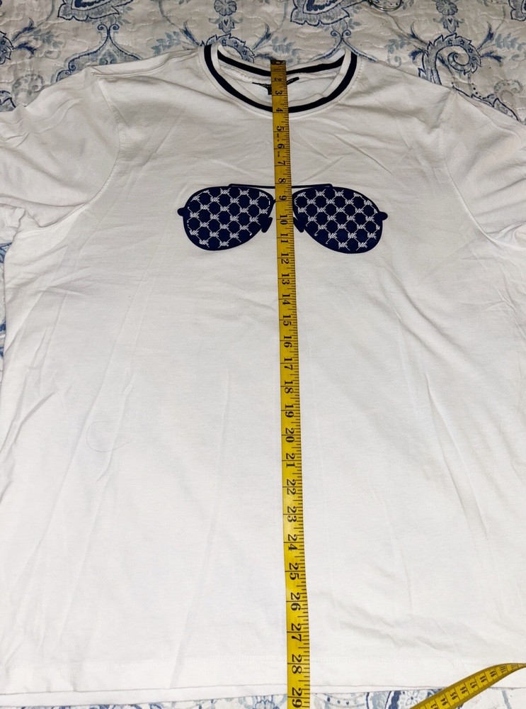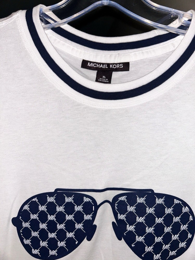 Upgrade your wardrobe with this stylish Michael Kors T-shirt featuring a graphic print of aviator sunglasses. Made of 100% cotton knit fabric, this shirt is perfect for summer and spring seasons. The crew neck and short sleeves provide a comfortable fit for regular wear. This logo-accented T-shirt comes in Grecian white and is machine washable for easy garment care. The XL size is suitable for men and the Michael Kors brand assures quality. Perfect for holiday themed events, this T-shirt is a must-have addition to any fashion-forward men's clothing collection.