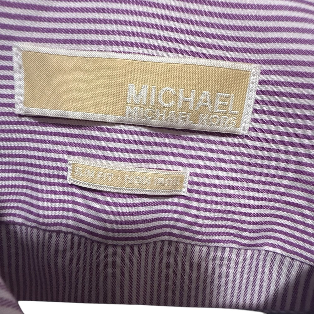 Michael Kors Men’s Slim Fit Non-Iron Dress Shirt - Purple Striped - Size 15 32/33 Brand: Michael Kors Style: Slim Fit Dress Shirt Size: 15 Neck, 32/33 Sleeve Length Color: Purple & White Striped Material: 100% Cotton Fit: Slim Fit Features: • Non-Iron fabric for easy maintenance • Button-down front • Long sleeves with button cuffs • Classic pointed collar Condition: Pre-Owned, Good Condition • No visible stains, tears, or excessive wear
