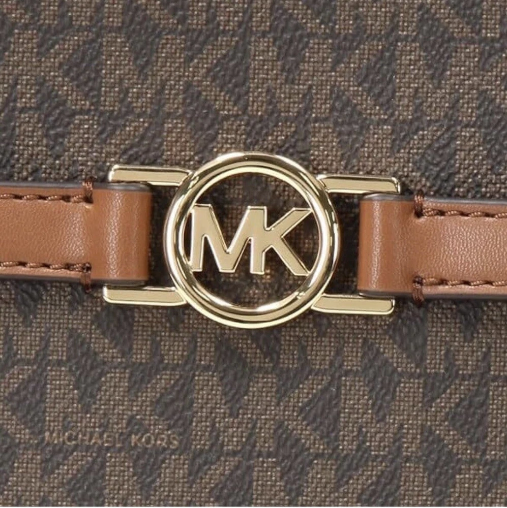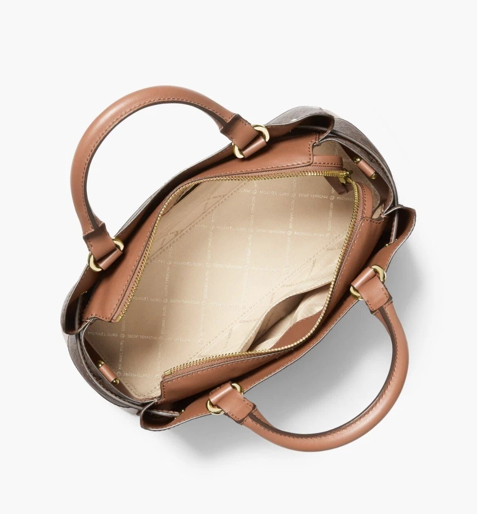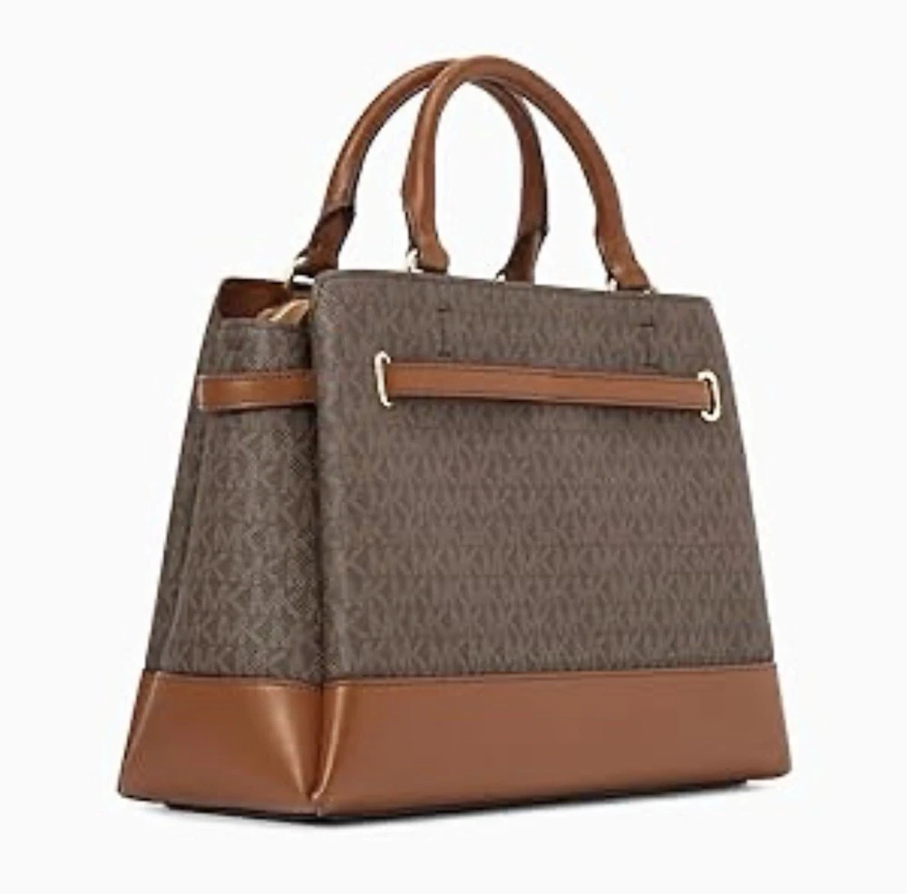 Michael Kors Reed Large Brown Satchel Shoulder Handbag Belted Purse Crossbody. • Satchel • Logo-print canvas/faux leather • 74% coated canvas/19% polyester/7% polyurethane • Trim: 60% polyurethane/20% cotton/20% polyester • Gold-tone hardware • 13.25”W X 9.25”H X 5.25”D • Handle drop: 4” • Adjustable strap: 18.5”-22.25” • Interior details: back zip pocket, front slip pocket • Lining: 100% polyester • Zip fastening • Dust bag not included • Imported