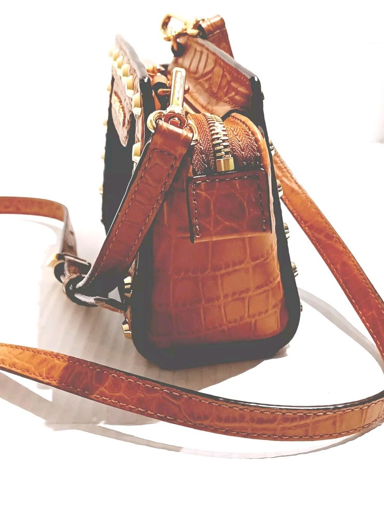 This Michael Kohrs Selma Mini Camel Embossed Leather Denim Crossbody Bag is a stylish and versatile addition to any wardrobe. With a zip closure and studded accents, this bag is perfect for a night out or a day of running errands. The crossbody strap is adjustable and the bag has a depth of 3 inches, making it easy to carry around. The exterior is made of camel color leather with a blue denim colorblock pattern, and the bag is lined. It comes with a detachable strap and handle keeper, making it easy to switch between crossbody and over-the-shoulder modes. This designer bag is a must-have for any fashion-conscious woman. Comes with a certificate of authenticity. Bag is in great condition but has a ink spot on lining (see photo)
