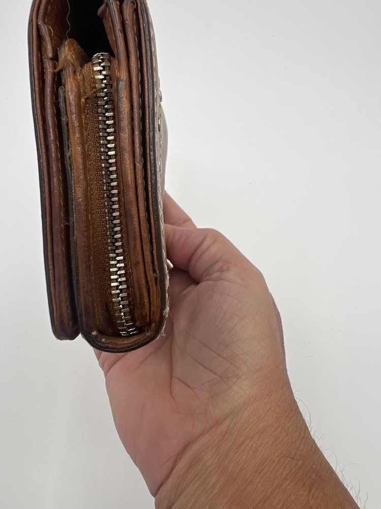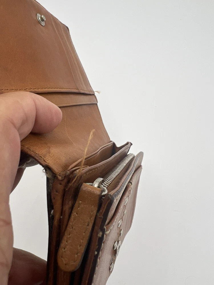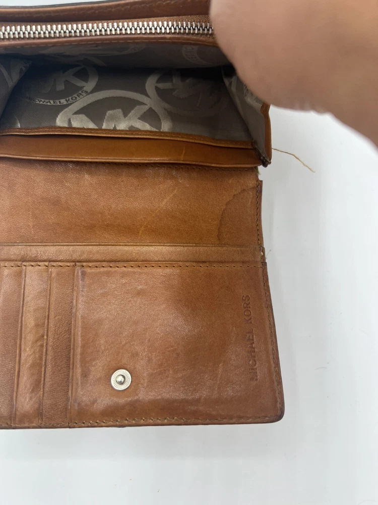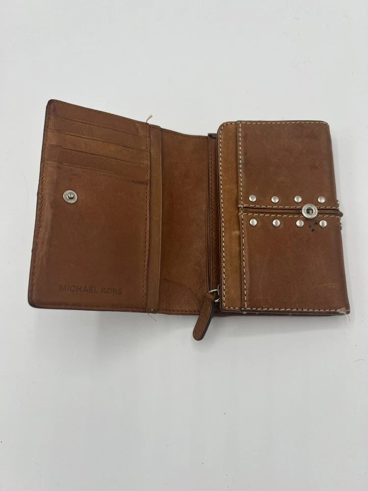 This Michael Kors wallet is the perfect accessory for any fashionable woman. Crafted from high-quality leather in a beautiful tan-brown color, this wallet features studded accents that add a touch of glamour to any outfit. The wallet is designed with multiple compartments and card slots, making it easy to organize your essentials. Whether you're running errands or heading out for a night on the town, this wallet is a stylish and functional choice. It's perfect for women who want to keep their belongings organized and secure. Add this Michael Kors wallet to your collection today! This wallet is beautiful but is preloved and has wear, some tiny spots and a few loose threads, so please view all photos before bidding.