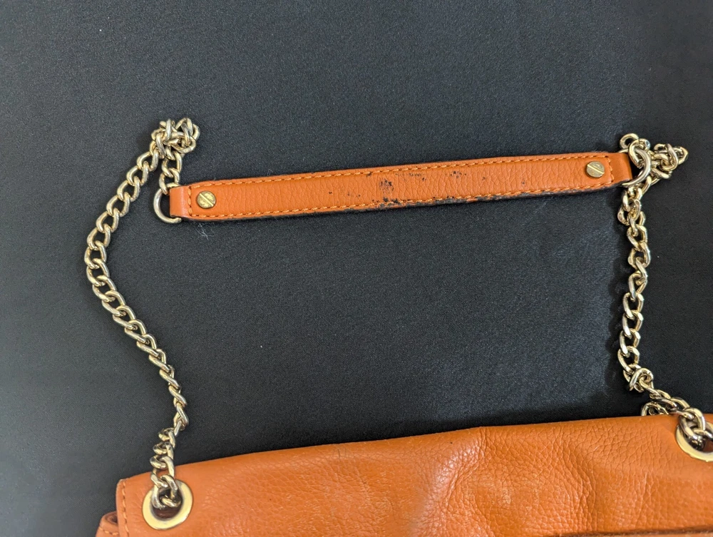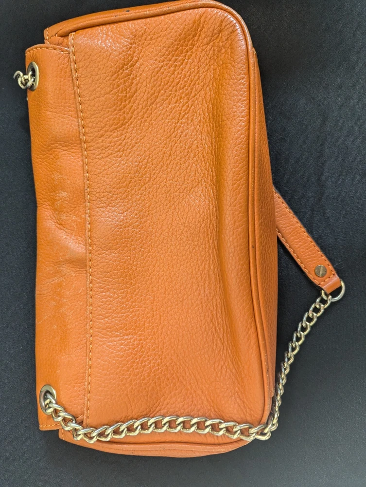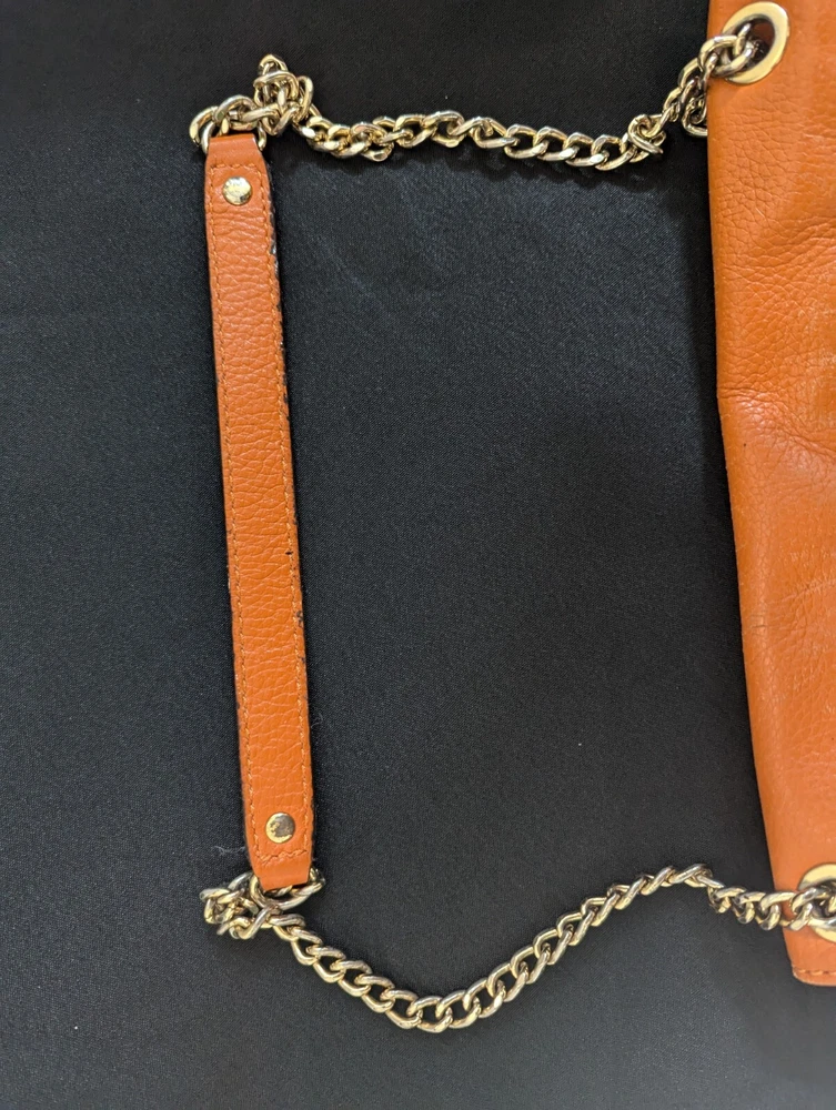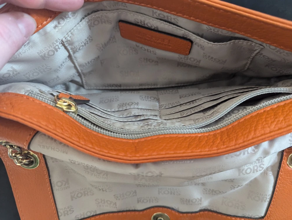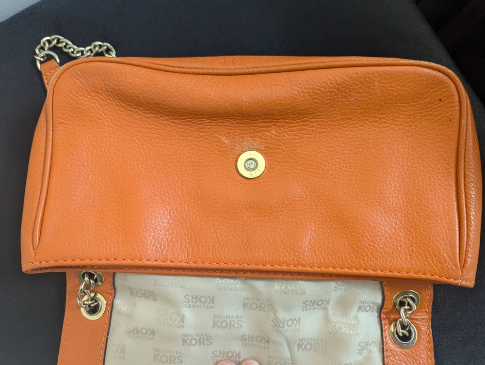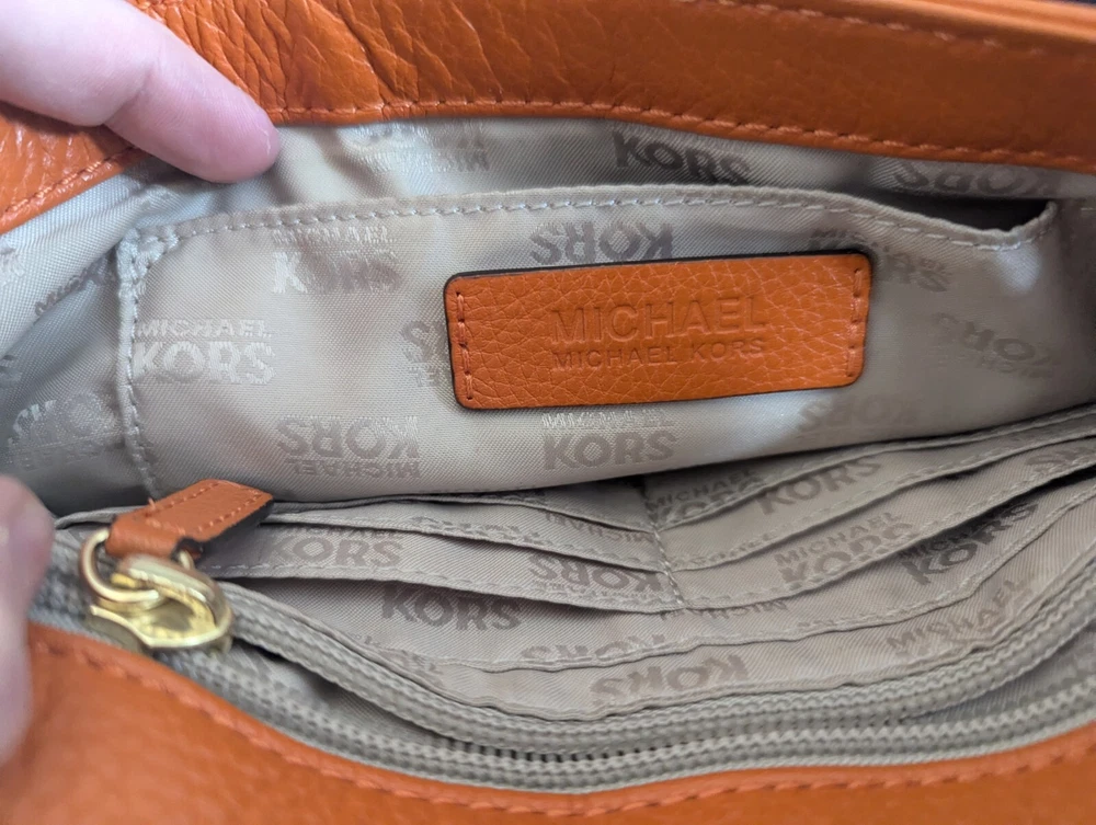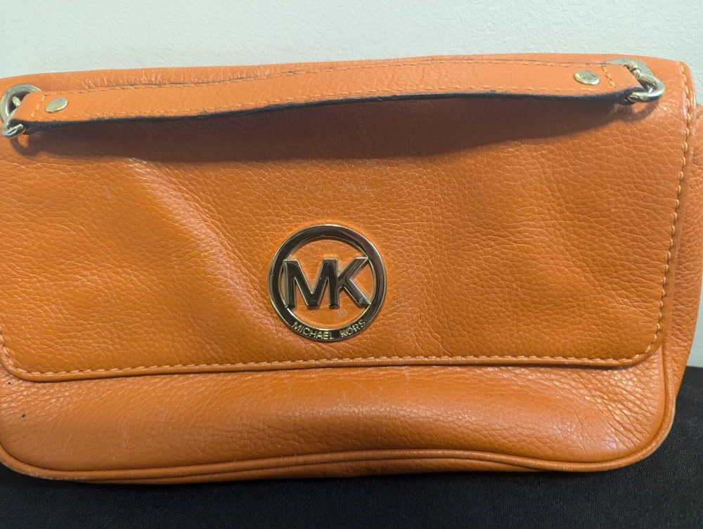 This Michael Kors Orange Pebbled Leather Crossbody/Shoulder Bag is perfect for adding a bold pop of color to your outfit while maintaining practicality. Though this bag has some signs of wear, it still has plenty of life left and is ideal for someone looking for a stylish accessory at a great price! Condition: This bag is in fair pre-loved condition. Please note:There are visible scuff marks and some black markings on the orange straps.The exterior has some minor wear and matting on the edges.The hardware shows light wear but is fully functional. The interior is clean with no major stains or odors. Measurements:Height: 6.5 inchesLength: 9.5 inchesDepth: 2 inchesStrap Drop: 23 inches (Adjustable)