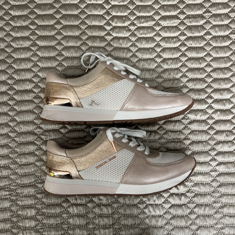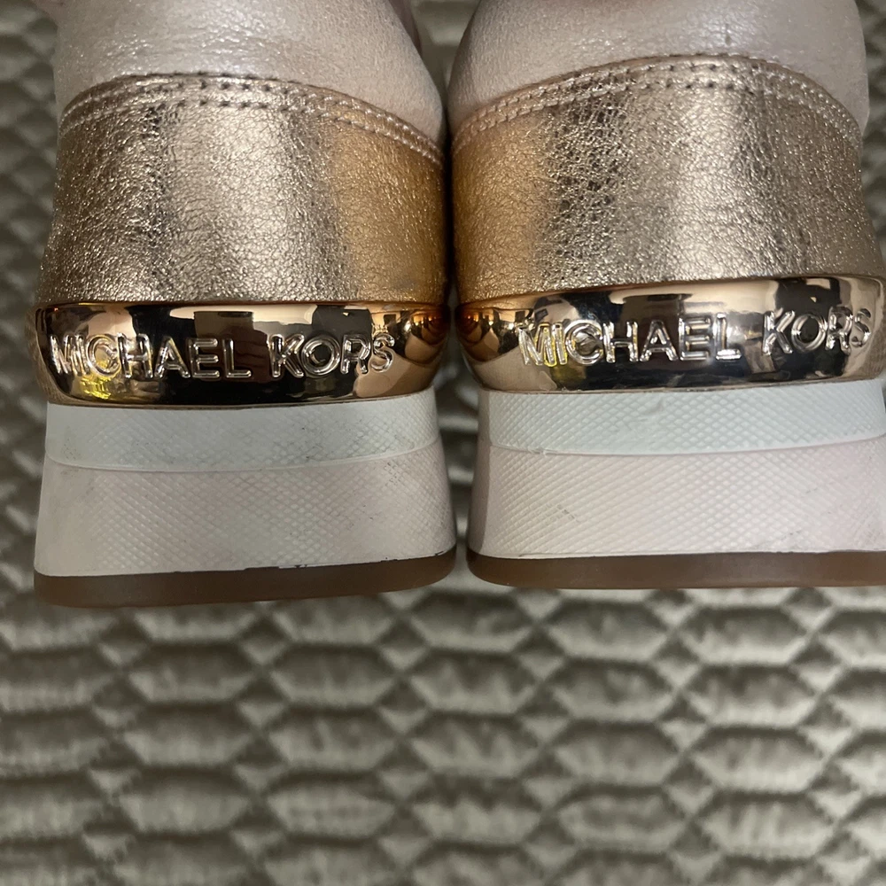 These Michael Kors Women's Size 10 Rose Gold Lace Up Fashion Sneakers are a stylish and comfortable option for casual wear during the summer, fall, or spring seasons. Made with a leather upper material and a rubber outsole, these sneakers feature a low top shaft style with a lace-up closure. The rose gold color adds a touch of glam, while the Michael Kors logo accents provide a signature look. Whether you're walking or just looking for a fashionable athleisure shoe, these sneakers offer both comfort and style for the modern woman.