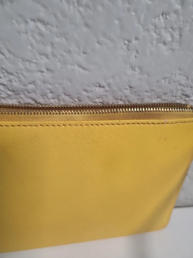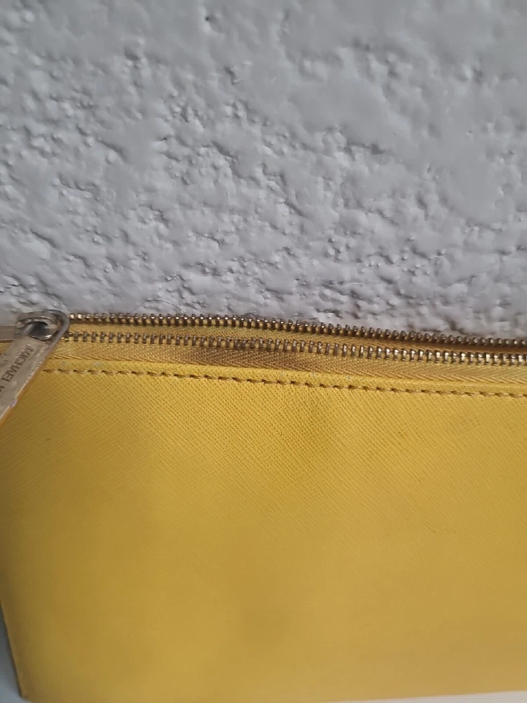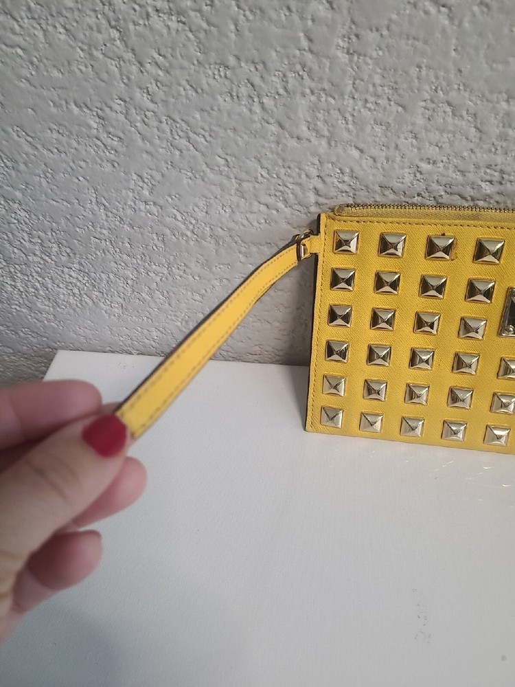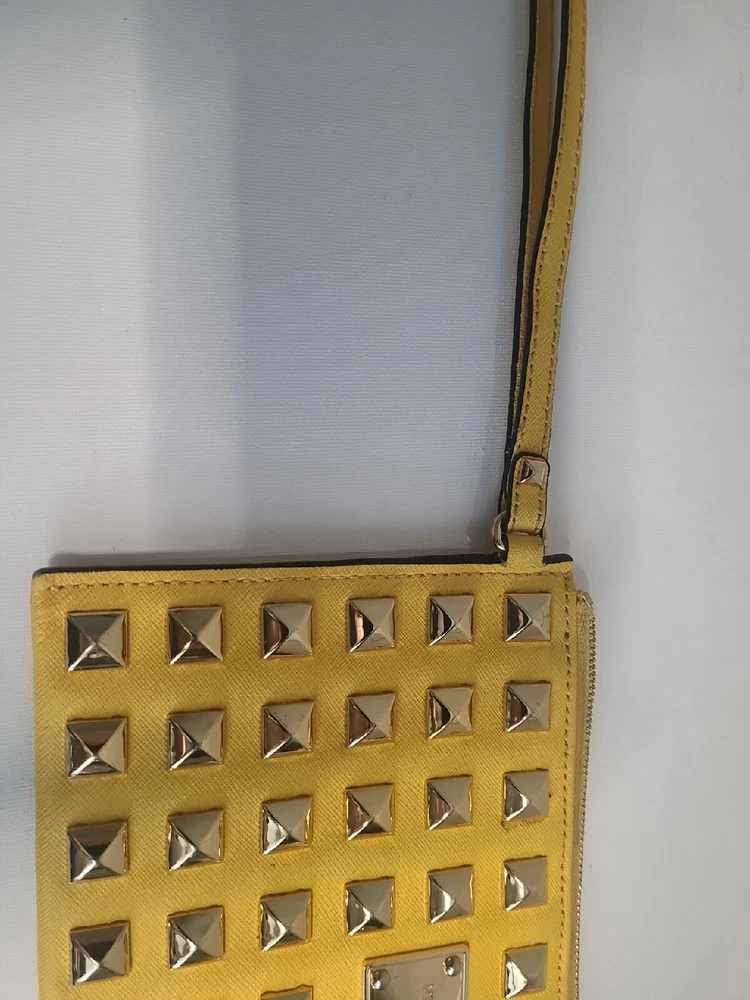 This chic Michael Kors clutch is a standout piece with its bold yellow color and stylish stud detailing. The compact size (10" x 5.5") makes it perfect for nights out. There’s minor discoloration near the zipper, but it’s barely noticeable. Great pre-owned condition at a steal! Shipping was smooth with USPS. Love it!