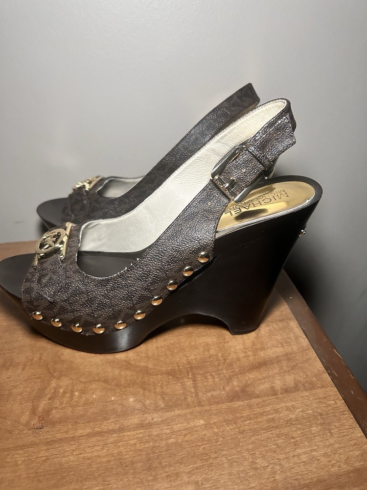 The product is a pair of black and gold Michael Kors heels in a pump style with a round toe shape. Made from leather, these size 7.5 heels are designed for women looking to add a touch of elegance and sophistication to their outfit. The black color and gold accents give these heels a luxurious and stylish look, perfect for a variety of occasions.