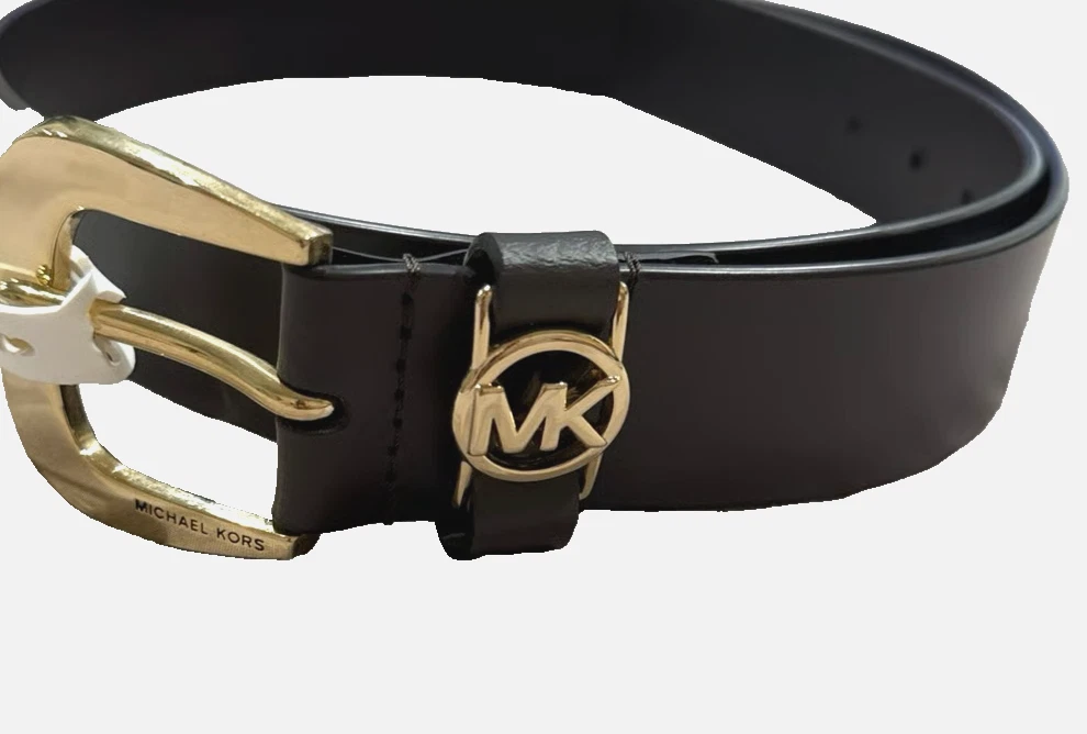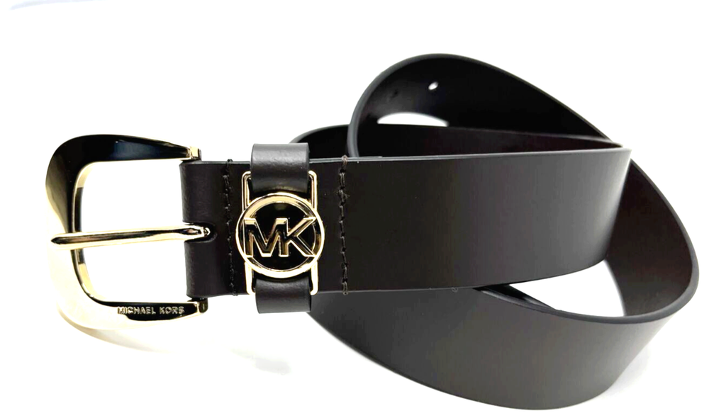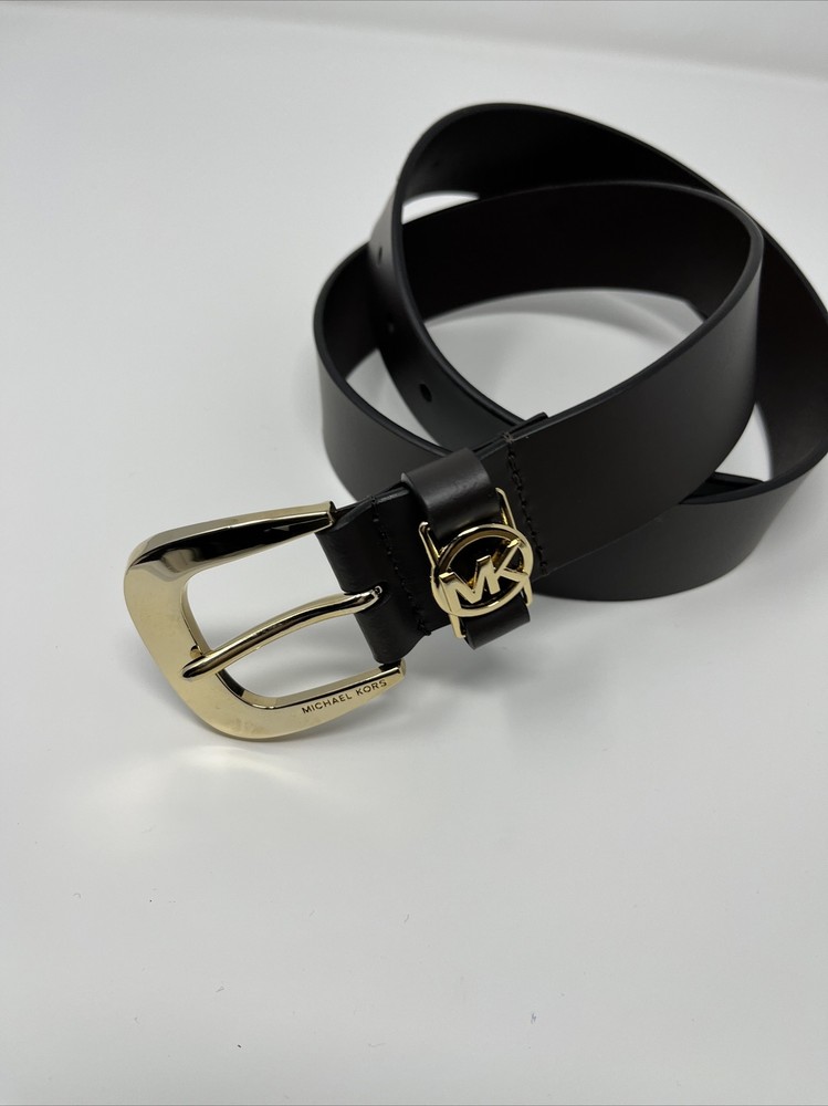 Michael Kors women's Leather Belt with Mk Logo size: Medium color: Chocolate Brown /Gold Leather Approximate width: 1.5 inch Polished C-ring buckle and cutout logo disc at closure Length: 35 inches