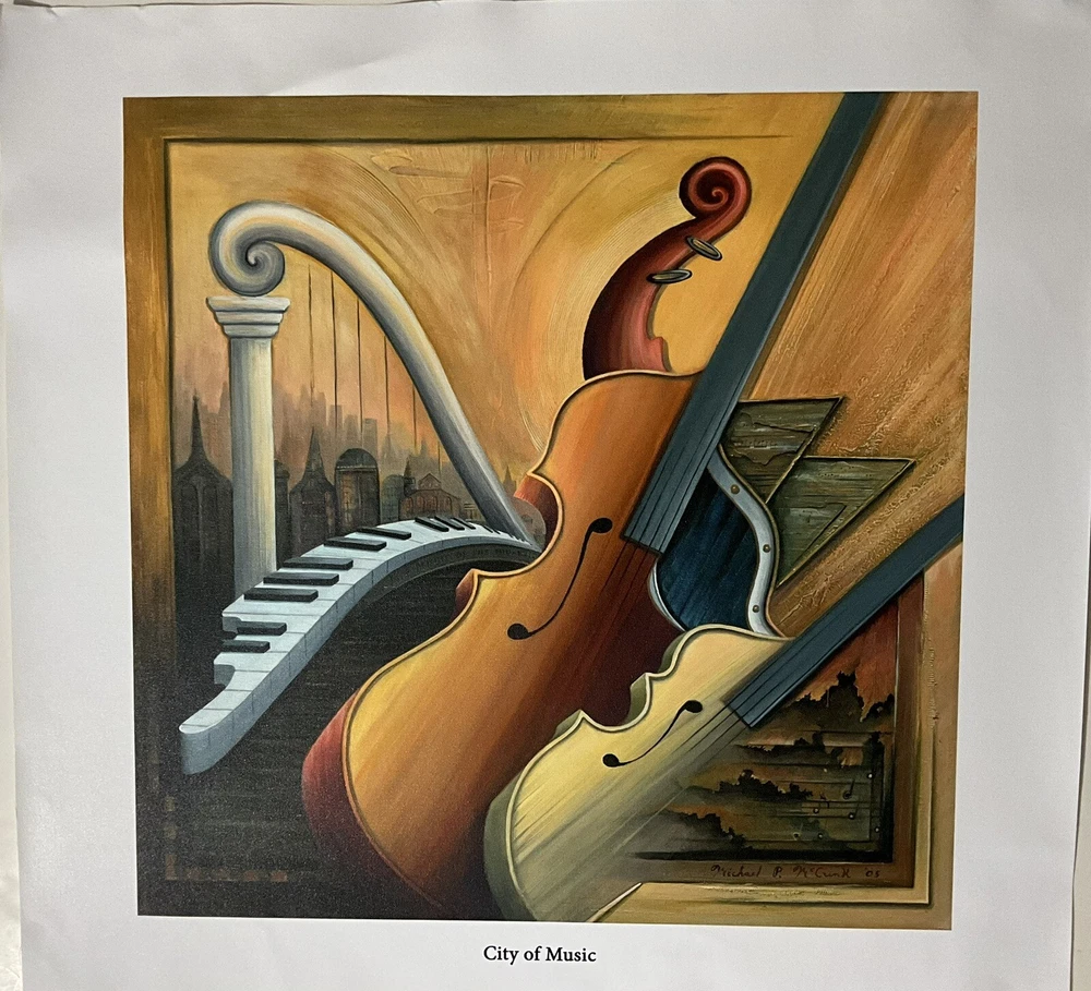 This beautiful canvas giclee artwork by Michael McCrink depicts a whimsical scene of a city filled with music. The piece measures 24 inches in height and width, and features a landscape orientation. It was produced in 2005 and is signed by the artist on the plate. The artwork is a contemporary piece that embodies the Americana and modernism styles. It is a single piece that is unframed and comes with a certificate of authenticity. The giclee print production technique was used to create this stunning piece. The subject of the artwork includes a piano, cello, violin, and other musical instruments, making it a perfect addition to any music lover's collection.