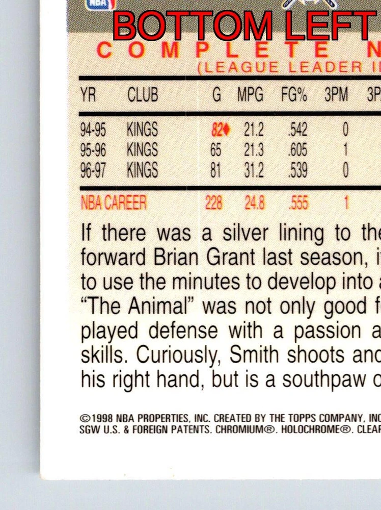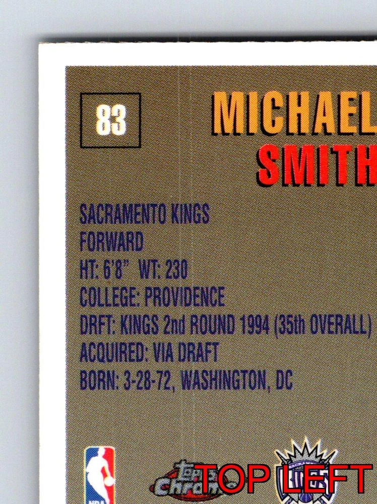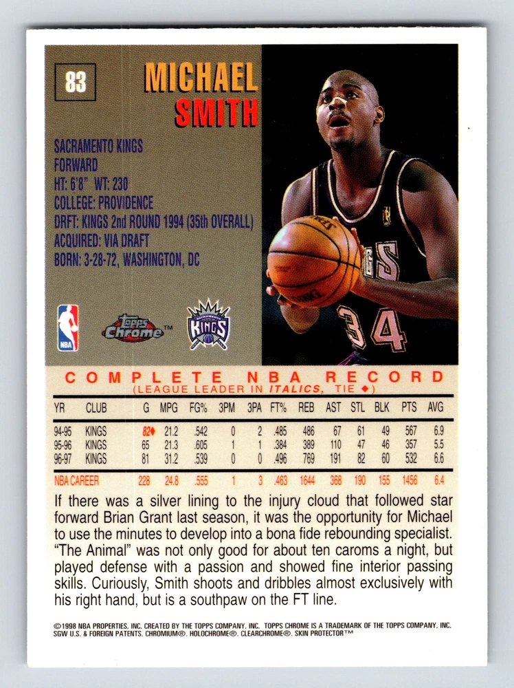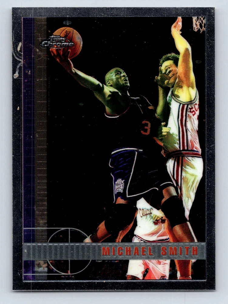 Item Description Title: Michael Smith Forward Sacramento Kings Topps Chrome 1998 Card 83 Collectible Description: This basketball trading card showcases Michael Smith, an accomplished forward known for his time with the Sacramento Kings. Part of the 1998 Topps Chrome series, a distinguished set renowned for its premium design and chrome finish, this card is a must-have for collectors and fans. The card captures Smith in a dynamic moment, displaying his athletic prowess and defensive skills on the court. Standing at 6'8 and weighing 230 pounds, Smith was known for his rebounding ability and strong defense. Born on March 28, 1972, in Washington, D.C., Smith was drafted in the second round of the 1994 NBA Draft, 35th overall by the Kings. Throughout his career, Smith was celebrated as a reliable player who contributed significantly to his team's performance. This card, reflecting his contribution to the Kings career from 1994 to 1997, provides detailed stats and highlights, making it a valuable piece of basketball memorabilia. MRSP: $4.99 Sport: Basketball Player/Athlete: Michael Smith Season: 1998 Manufacturer: Topps Parallel/Variety: Chrome Set: Topps Chrome Basketball 1998 Team: Sacramento Kings League: National Basketball Association (NBA) Card Number: 83 Counter: 165 Folder: BASKETBALL1224002