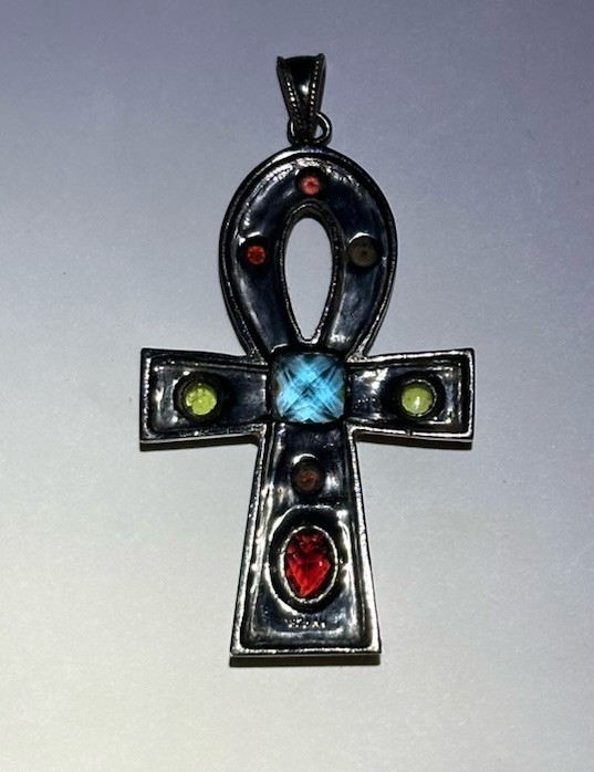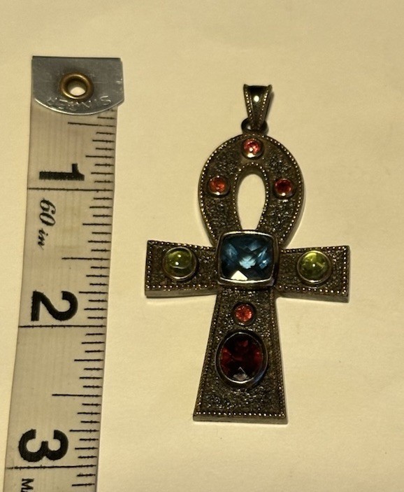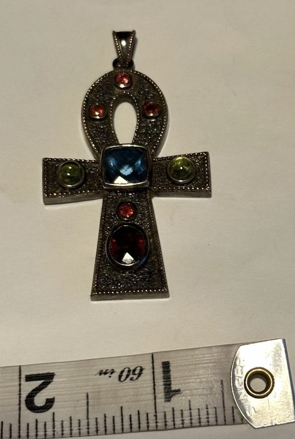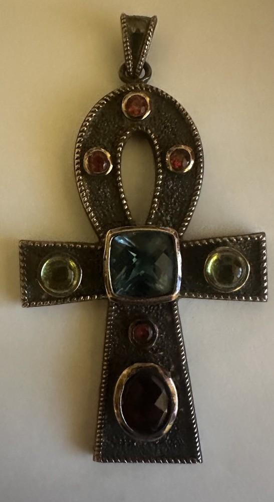 The Michael Valitutti 925 Sterling Silver Multi Gemstone Ankh Pendant is a beautiful and unique piece of fine jewelry. This pendant features a cross shape design with a square blue topaz as the main stone. It is signed by the brand and made of sterling silver, with garnet and peridot as secondary stones. The pendant is perfect for special occasions like Mother's Day, weddings, anniversaries, birthdays, and more. With a bohemian theme and 8 gemstones in total, this pendant is a stunning accessory for any jewelry lover. This Vintage pendant is in very good preowned condition with some overall wear. All the gemstones are in good condition. See all photos for details as this pendant is sold in as is condition.