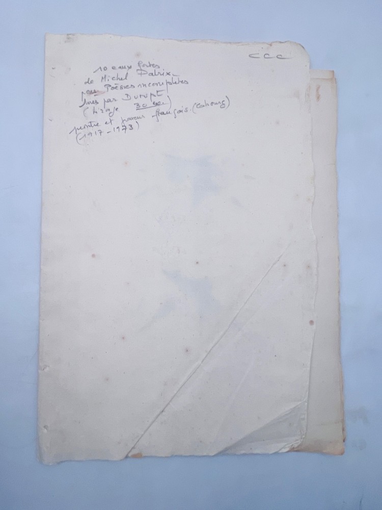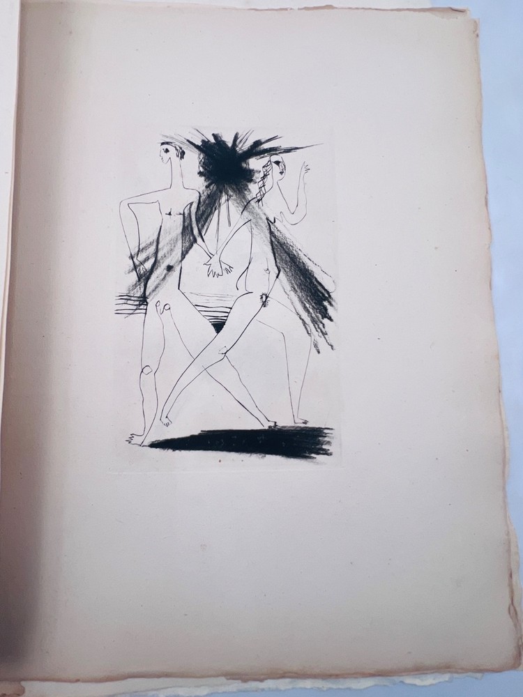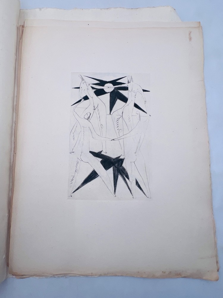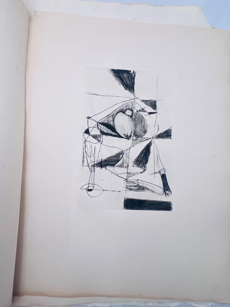 Rare exemplaire de Poésies incomplètes de Michel Dalrix (1917–1973), poète et écrivain français originaire de Cahors, accompagné de 10 eaux-fortes originales de l’artiste liégeois Dumez. Tirage limité à seulement 30 exemplaires, réservés aux bibliophiles. Chaque gravure présente un style expressionniste et onirique, mêlant corps féminins stylisés et compositions abstraites. L’exemplaire est conservé sous couverture d’attente souple, manuscritement titrée. État : exemplaire complet, mais la couverture est froissée et tachée, les feuillets présentent des rousseurs et marques du temps. Les eaux-fortes restent bien fraîches et contrastées. A14