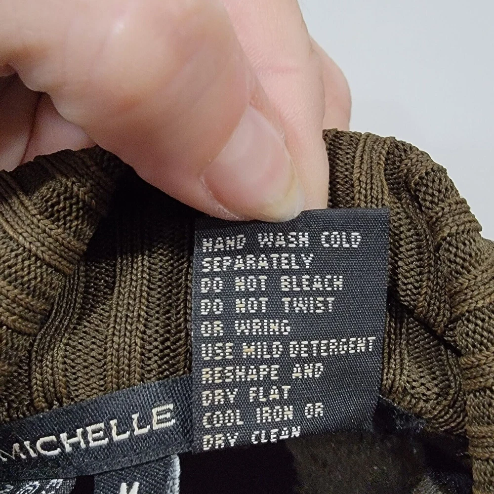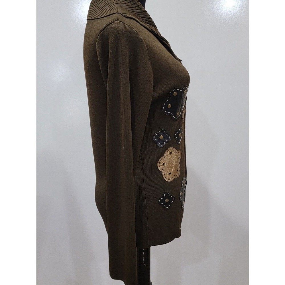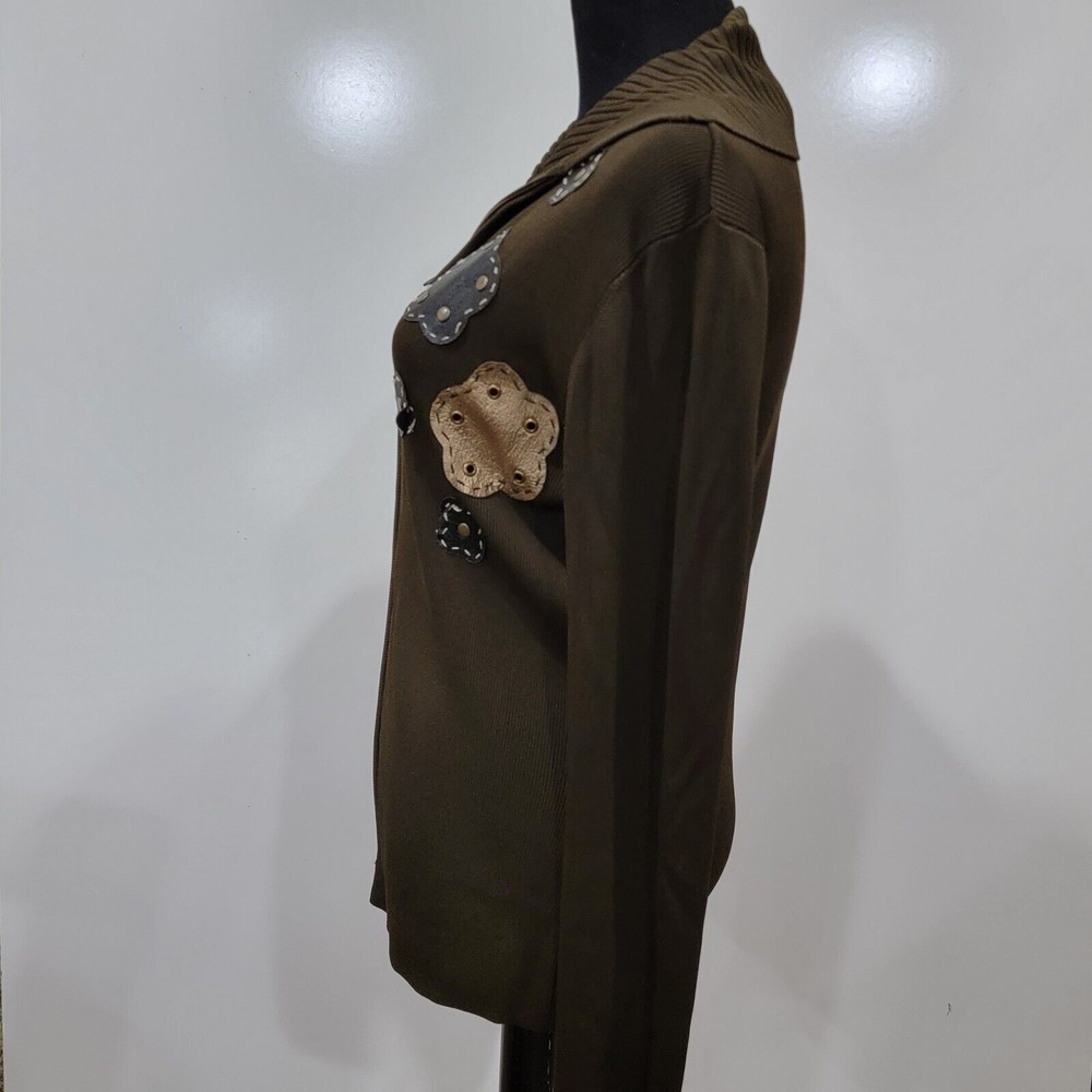 Michelle Nicole Olive Green Knit Sweater Full Zip Jacket Floral Patches Studs 3D. Size Medium. No Rips or Stains and is in Excellent Pre-Owned Condition. Cottagecore, Retro, Mature