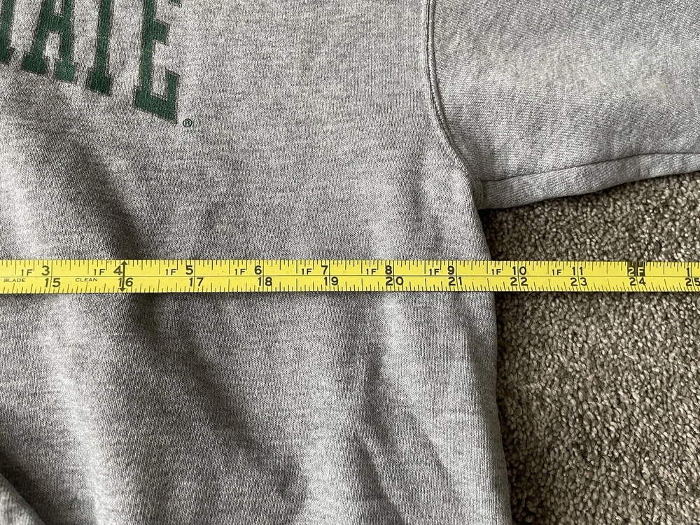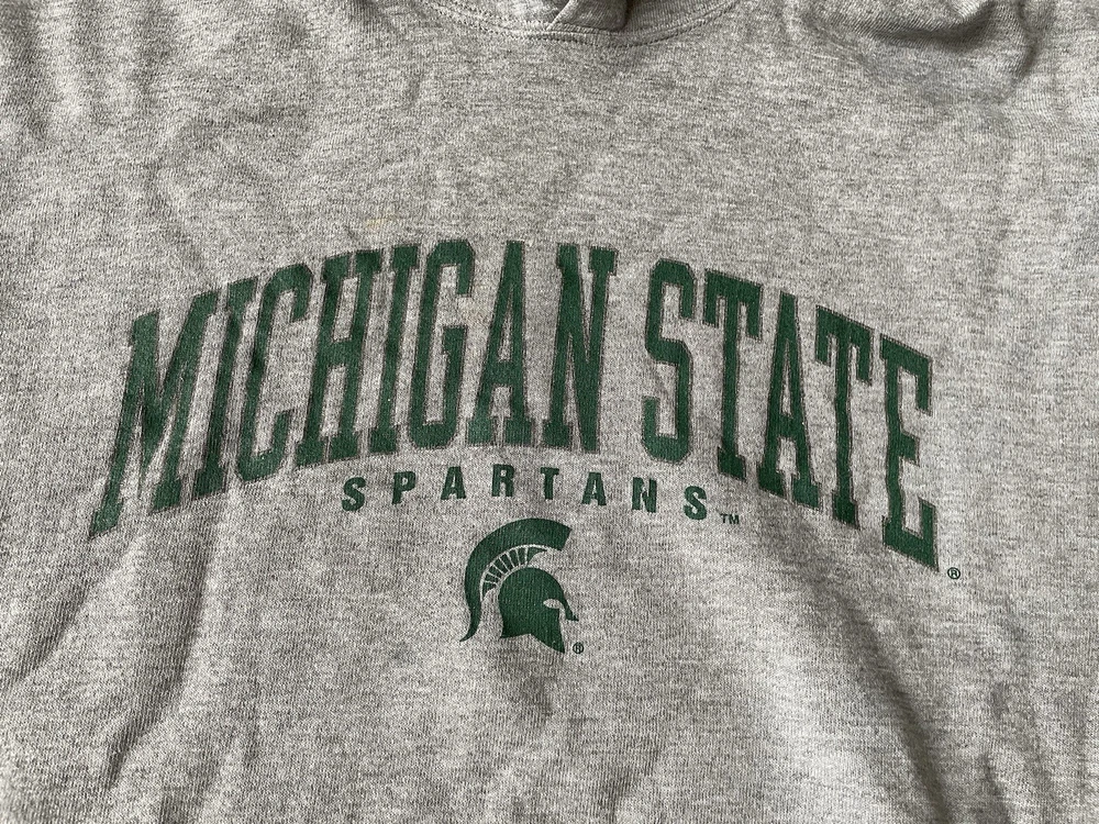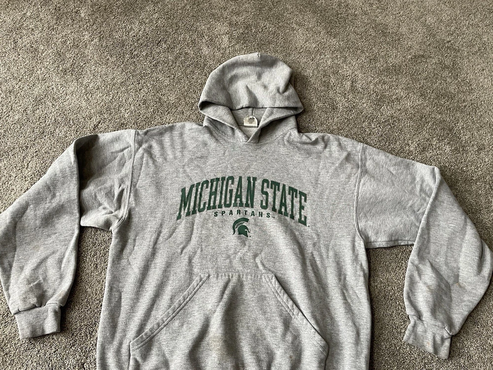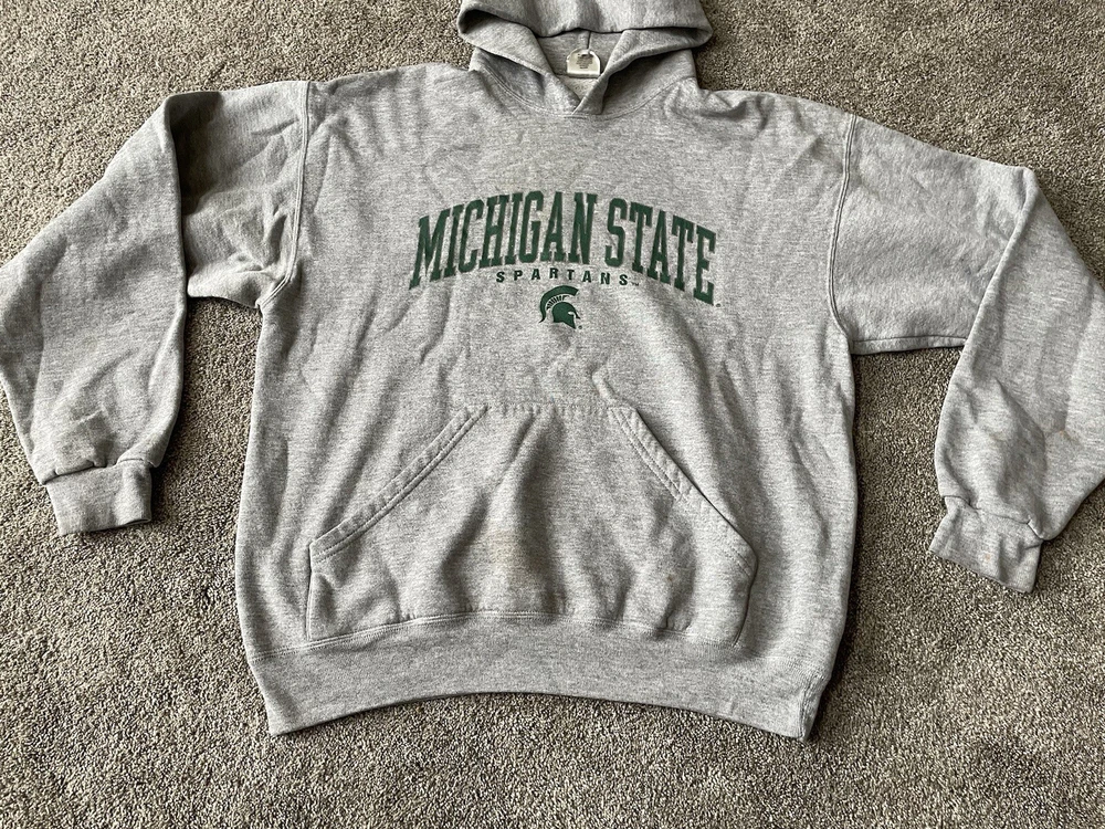 Show your support for the Michigan State Spartans with this vintage gray hoodie from MJ Soffe. Perfect for football season or just lounging around, this comfortable sweatshirt features the team's name and logo prominently on the front. Made for men and available in size L, it's a great addition to any fan's collection. Whether you're cheering on the team during the regular season or gearing up for the playoffs, this sweatshirt is a must-have for any true fan.