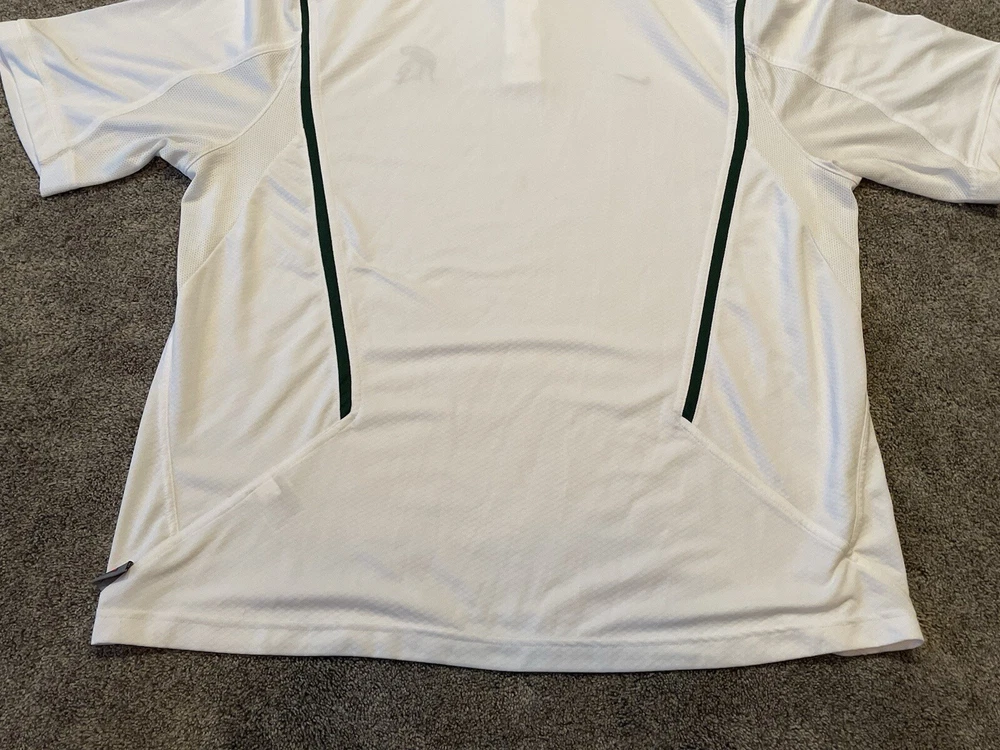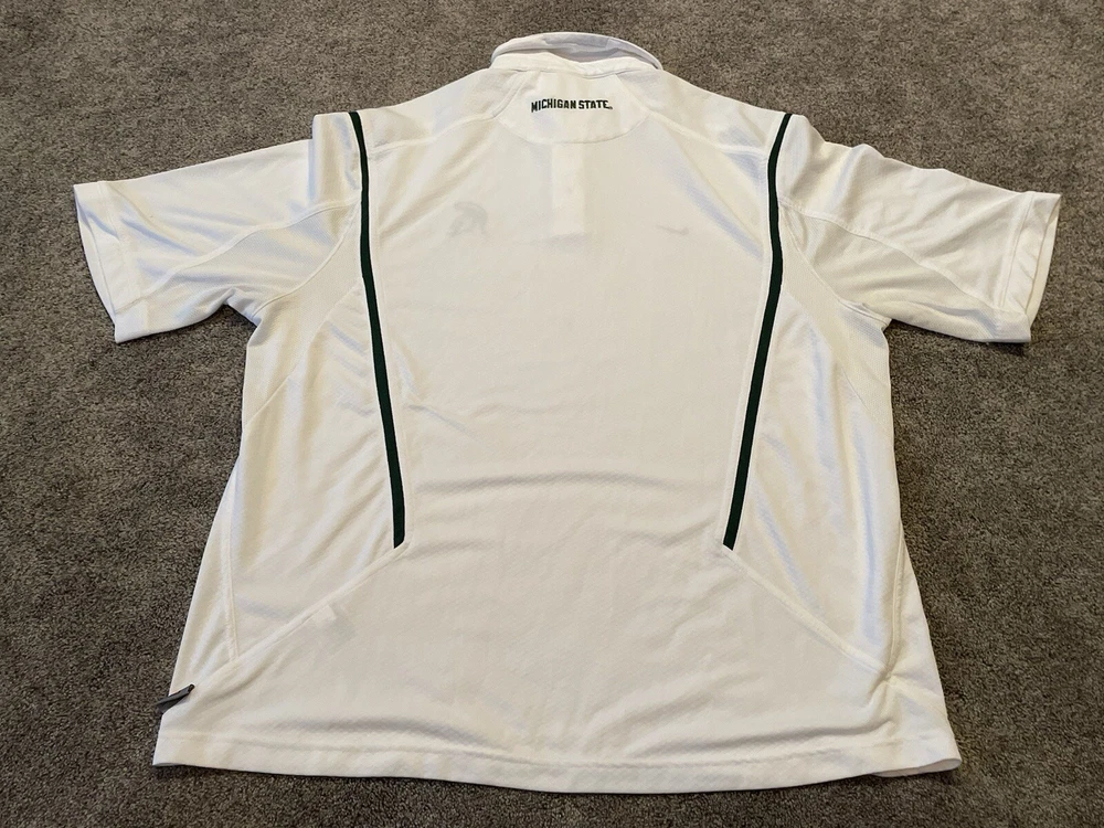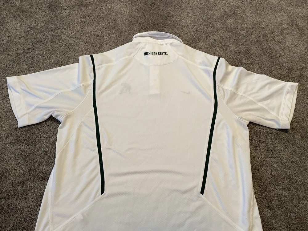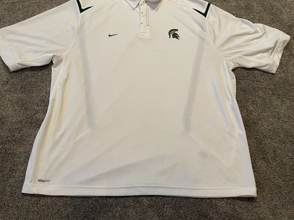 Elevate your game day attire with the Michigan State Spartans Polo Shirt. Designed for the ultimate fan, this white Nike Team Fit Dry polo is a staple for any supporter looking to combine style with comfort. Tailored to fit an XL, it's perfect for those who want to showcase their team pride without sacrificing a relaxed feel. Officially licensed by the NCAA, this polo is crafted to represent the Michigan State Spartans during the regular season and beyond. It's made in Indonesia, ensuring quality and durability, while the iconic Spartans branding makes it clear where your loyalties lie. Whether you're at the game or on the streets, this shirt is a consistent show of support for your favorite college football team. This item is preowned and shows signs of use and wear. Please see all photos for flaws and condition and please reach out with any further questions.