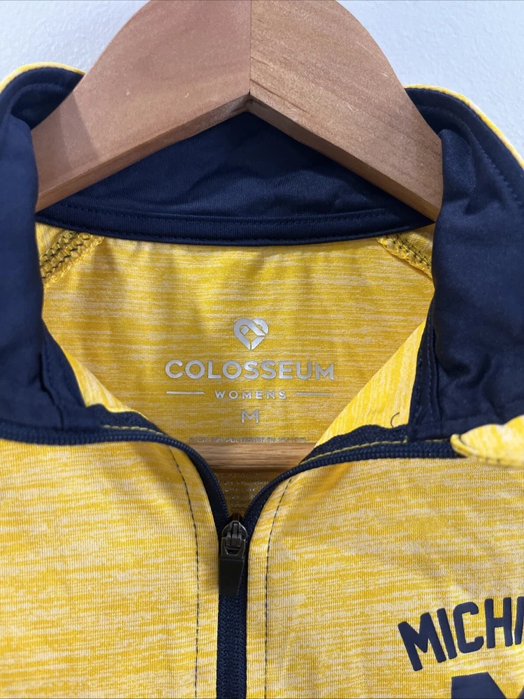 Player:naSport:FootballTeam:Michigan WolverinesBrand:Colosseum AthleticsSize:MEvent/Tournament:naCountry/Region of Manufacture:ChinaGender:WomenColor:YellowOfficially Licensed:YesPre & Post Season:Regular SeasonProduct:SweatshirtCapacity:12 oz