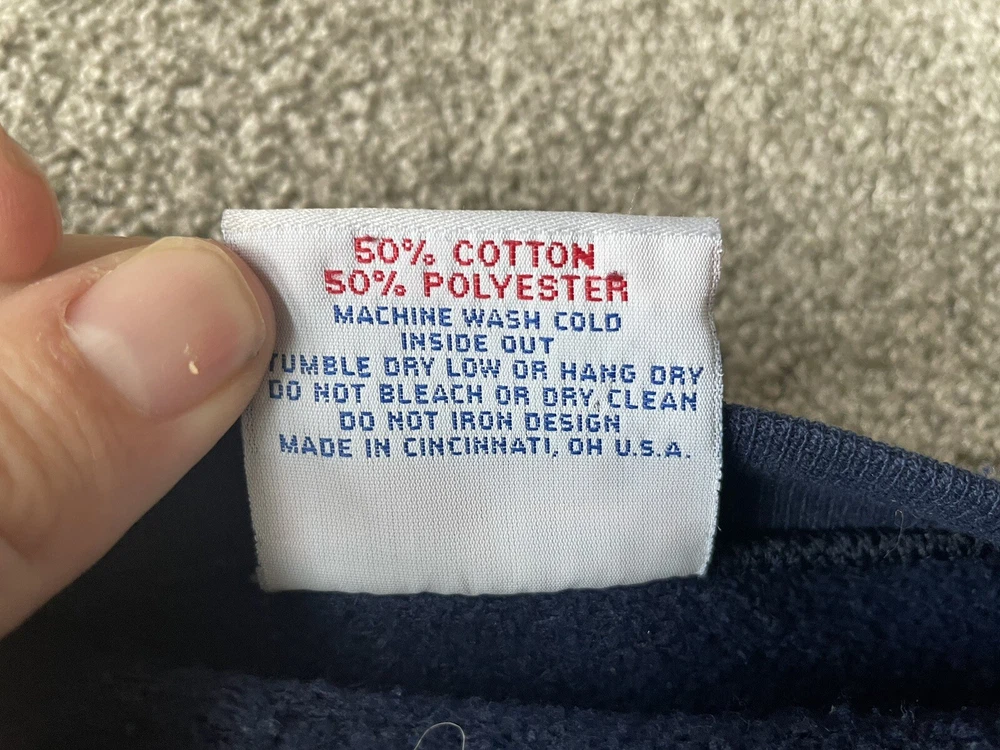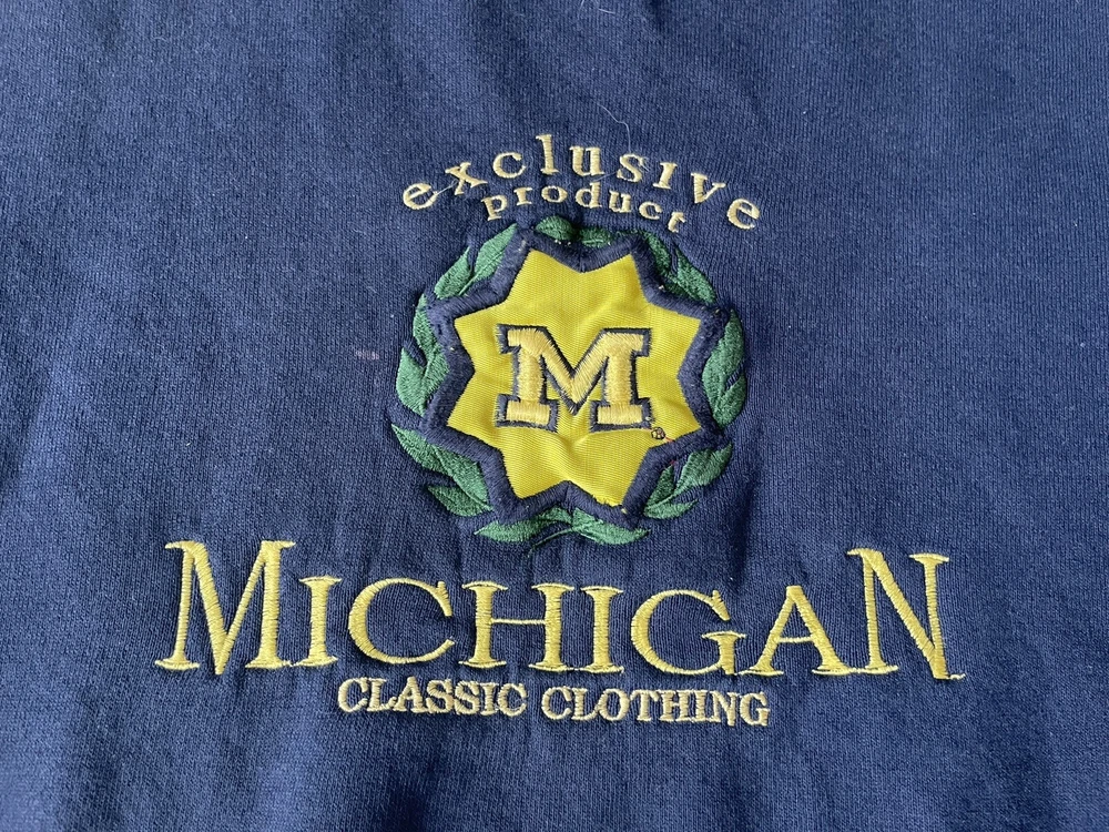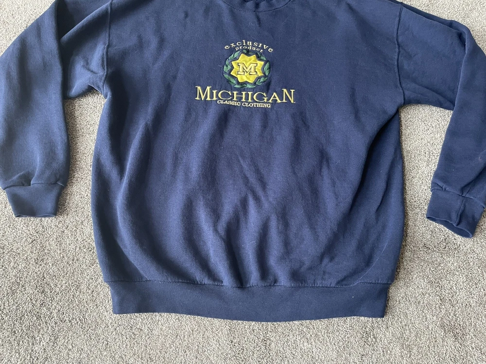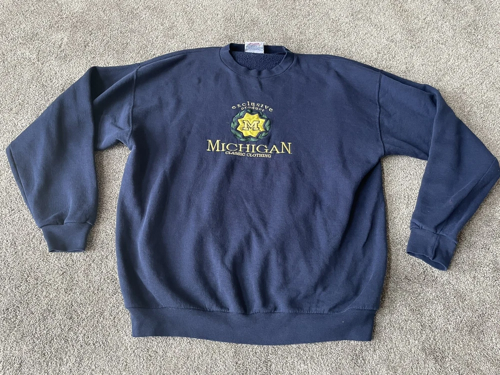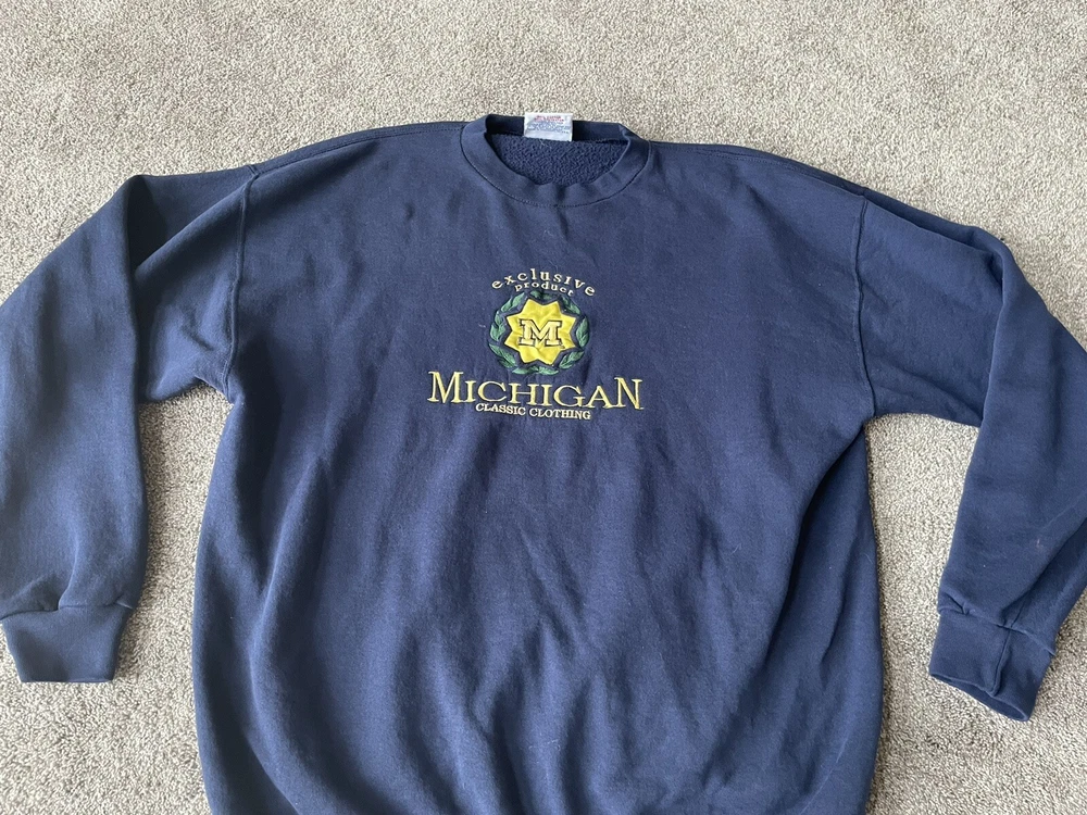 Crafted by Crable Sportswear, this Michigan Wolverines crewneck sweatshirt is a quintessential piece for any die-hard football fan. Adorned in a dark blue, this sweater embodies the spirit of the team and is designed to keep you comfortable while you cheer for your favorite college squad. With its XL size, it's a snug and warm addition to any fan's wardrobe. Proudly made in the United States, this sweatshirt is a nod to football tradition, perfect for regular season games and the playoffs. Whether you're at the stadium or watching from home, the sweater's classic design and durable construction make it a timeless piece for all kinds of fan celebrations.