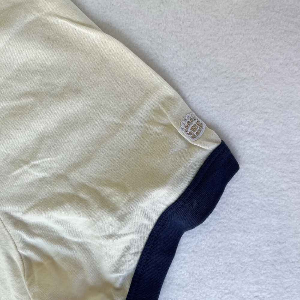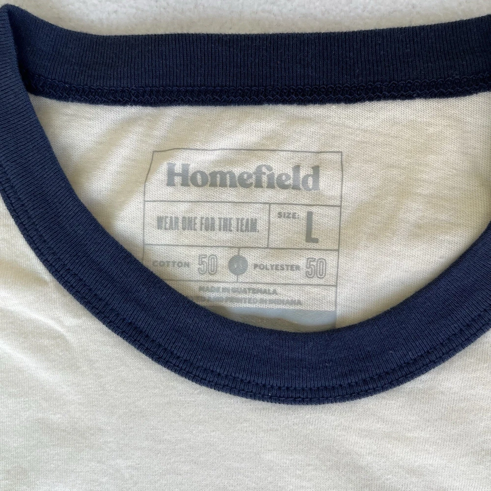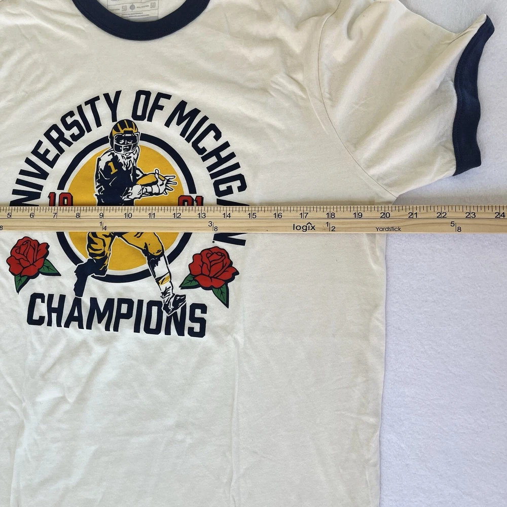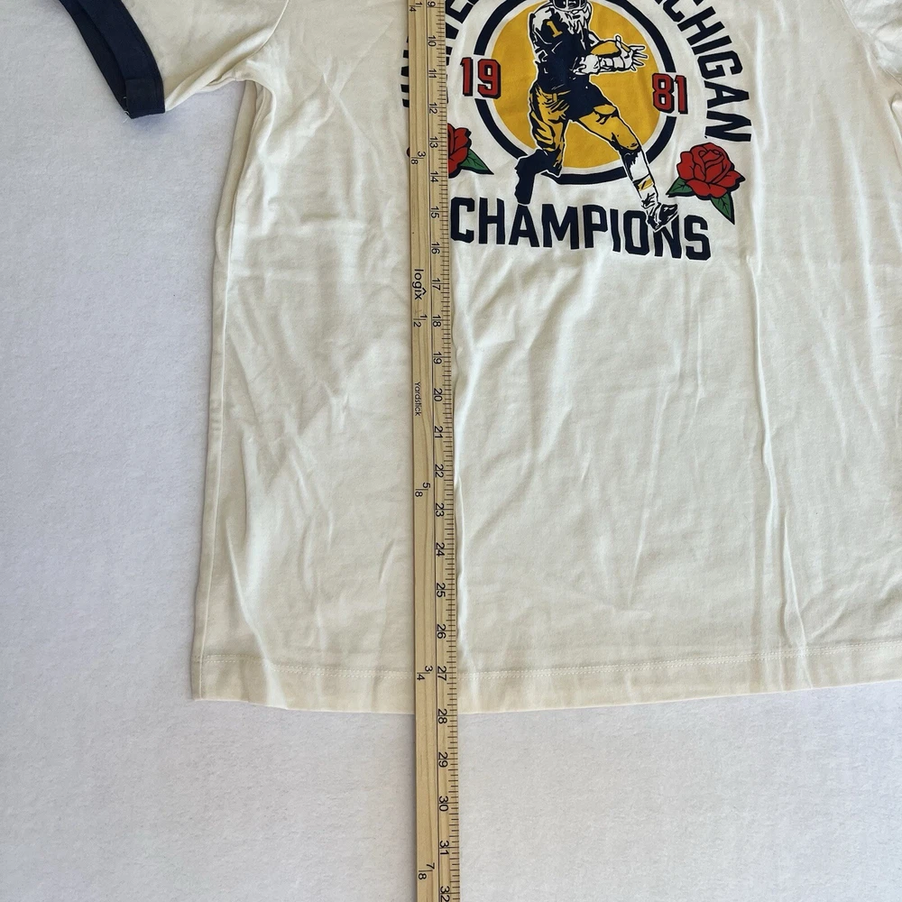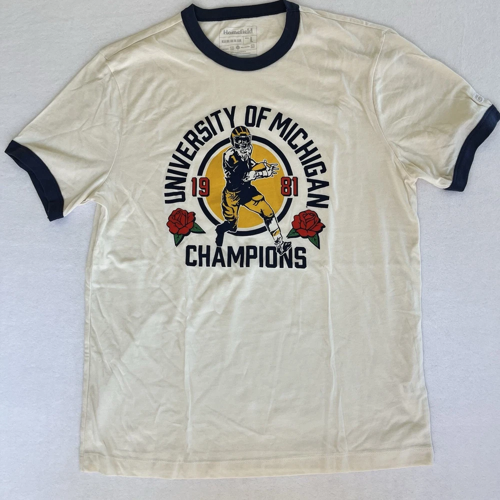 Homefield Brand (Wear One for The Team) Men's Size Larg Ringer T-Shirt Cream Color with Navy Blue Ringer Sleeve ends and Crew Neck Front printed, multi-color graphics commemorate Michigan's 1981 Rose Bowl win University of Michigan Wolverines, Big 10, NCAA Division I Soft Cotton/Polyester construction for comfort See photos for details, appearance and measurements Brand New Without Tags Buy It Now and Save $$ Inv#0463