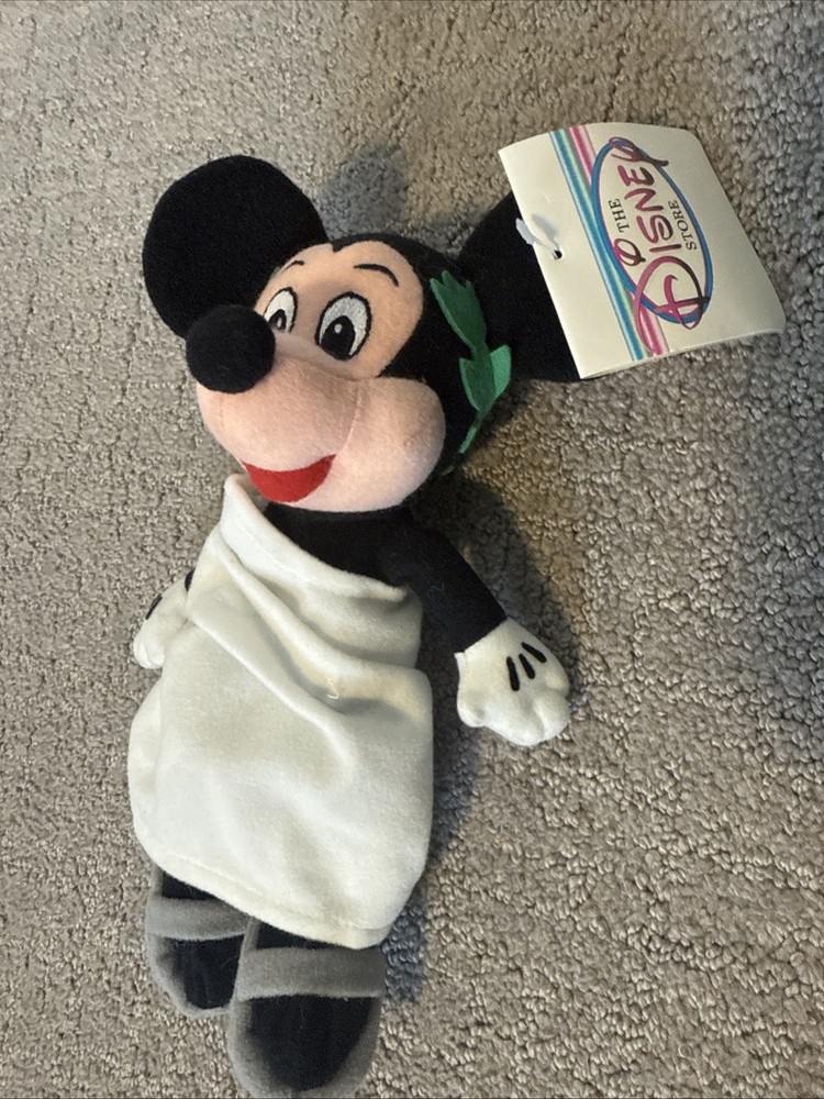 The product is a Mickey Mouse bean bag with a toga and laurel wreath headband, made by Disney Store. This collectible plush toy features the iconic character Mickey Mouse from the Disney franchise. Perfect for Disney fans and collectors, this item is a fun and unique addition to any Disneyana collection. With its whimsical design and high-quality construction, it is sure to delight fans of all ages.