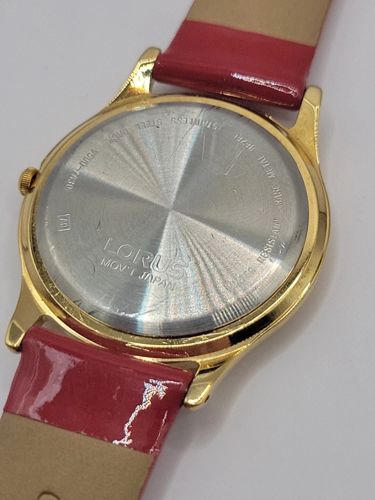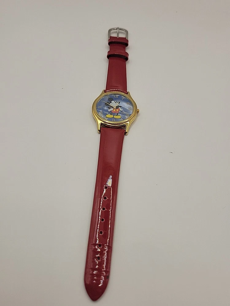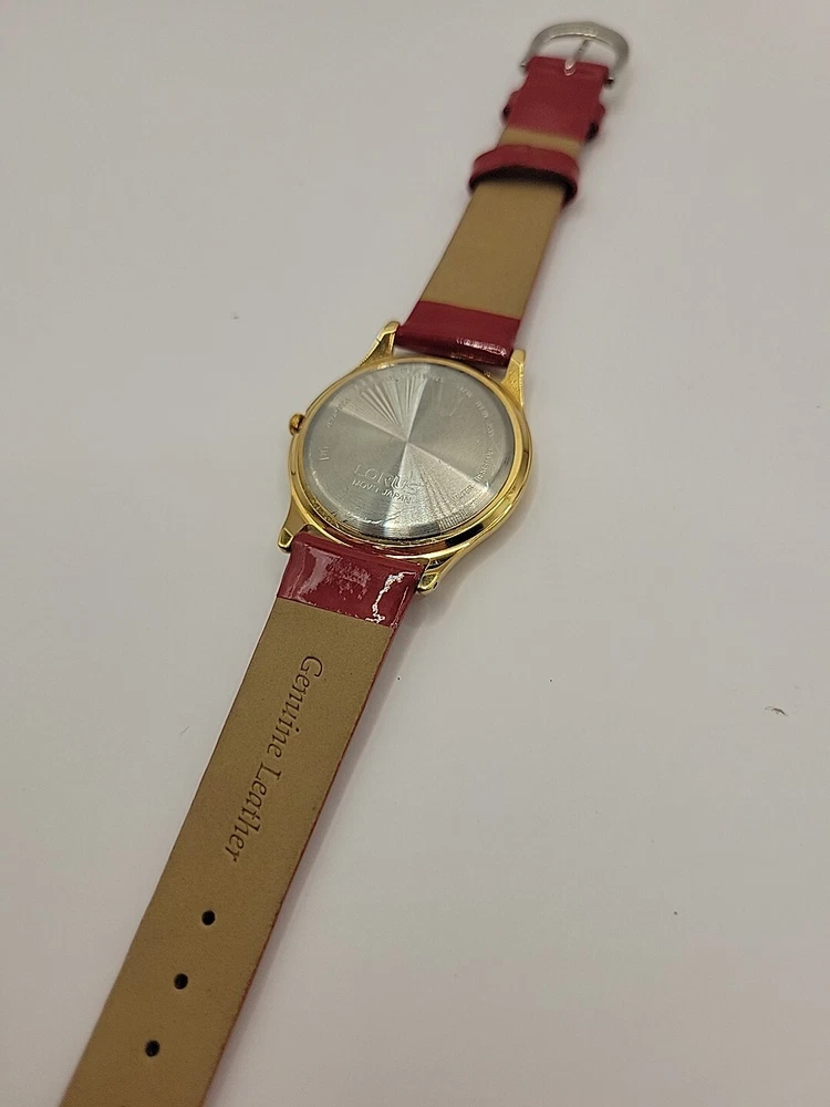 New Battery Works Lotus Rare Red leather band in mint condition This lotus rare girls wristwatch features Mickey Mouse in a red band design, perfect for any Disney fan. The watch is adorned with blue cloud pearls and is a must-have for collectors of Disneyana. The brand is Disney and the character/story/theme is Mickey Mouse, making it a unique addition to any collection. The watch is perfect for everyday wear or as a collector's item.