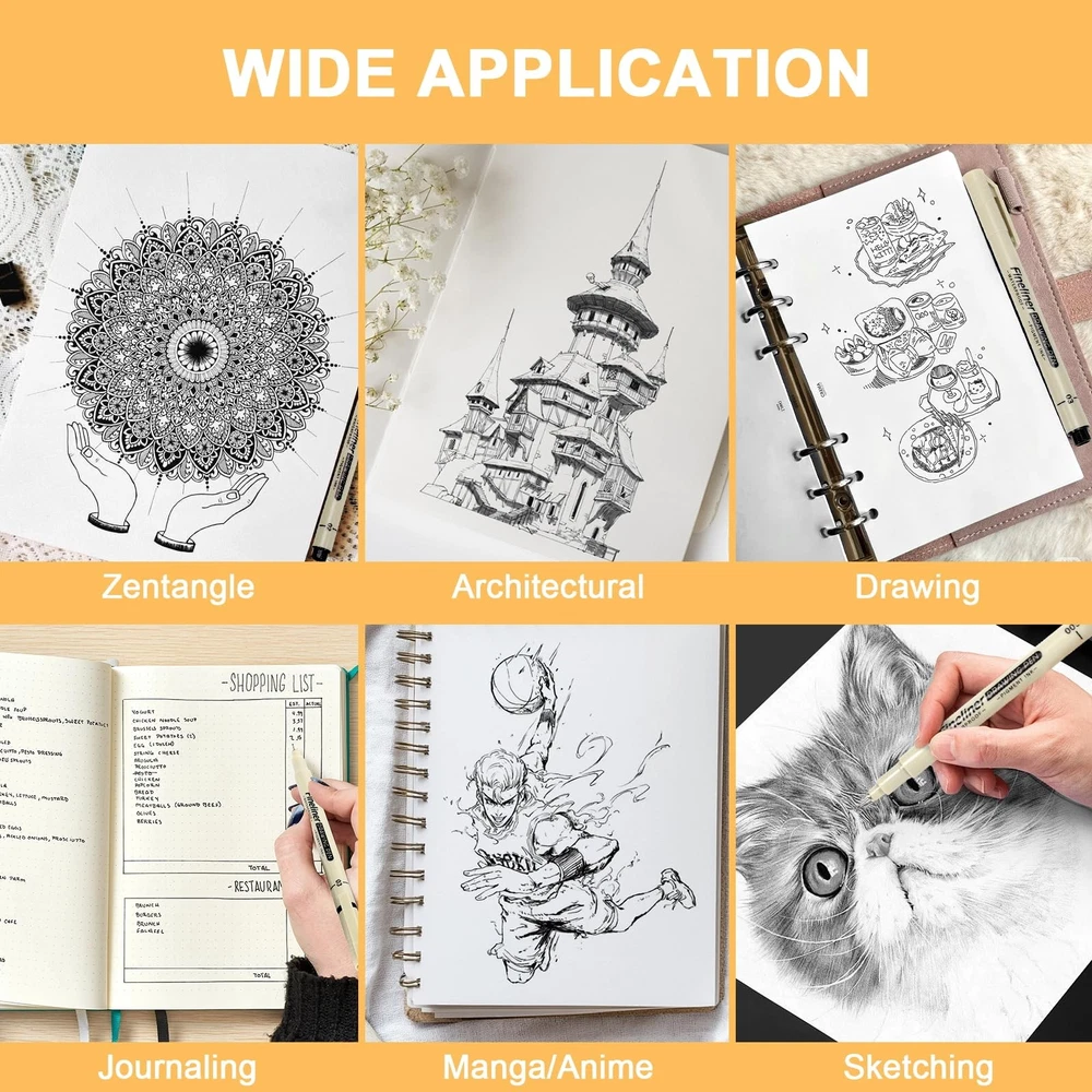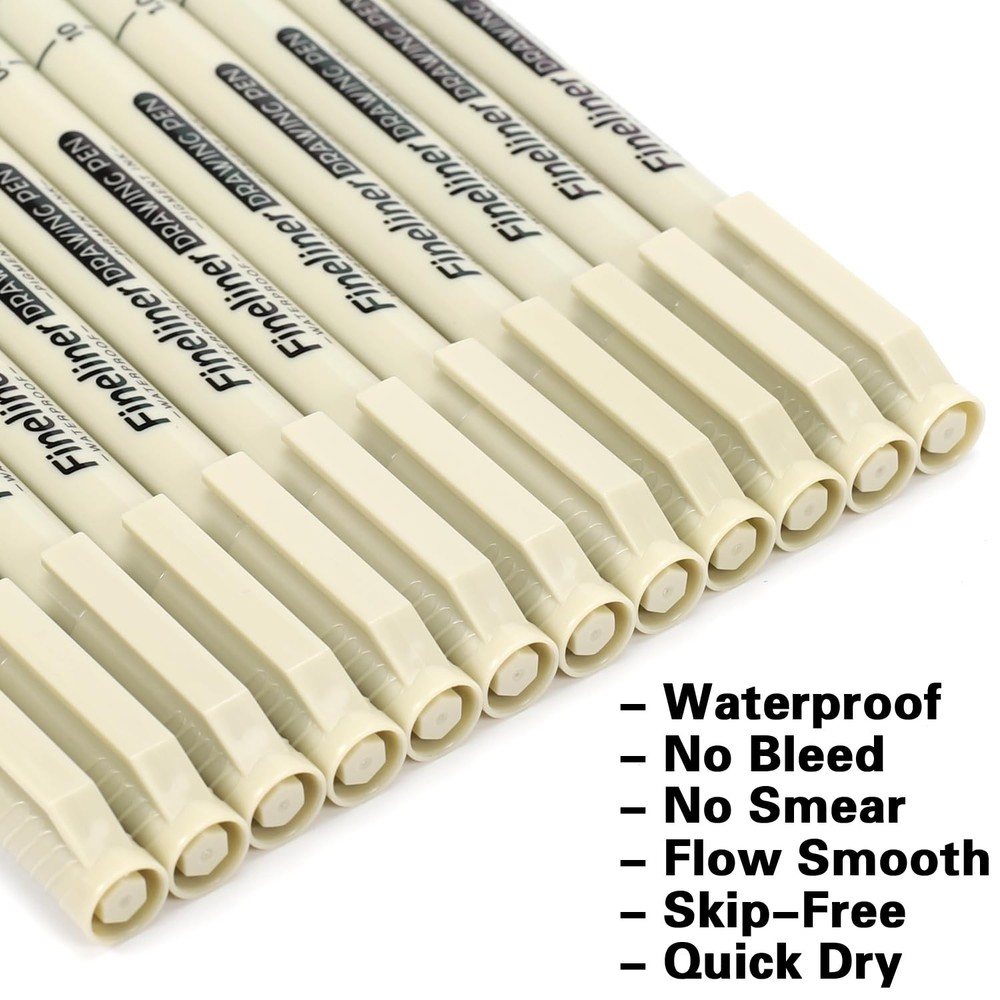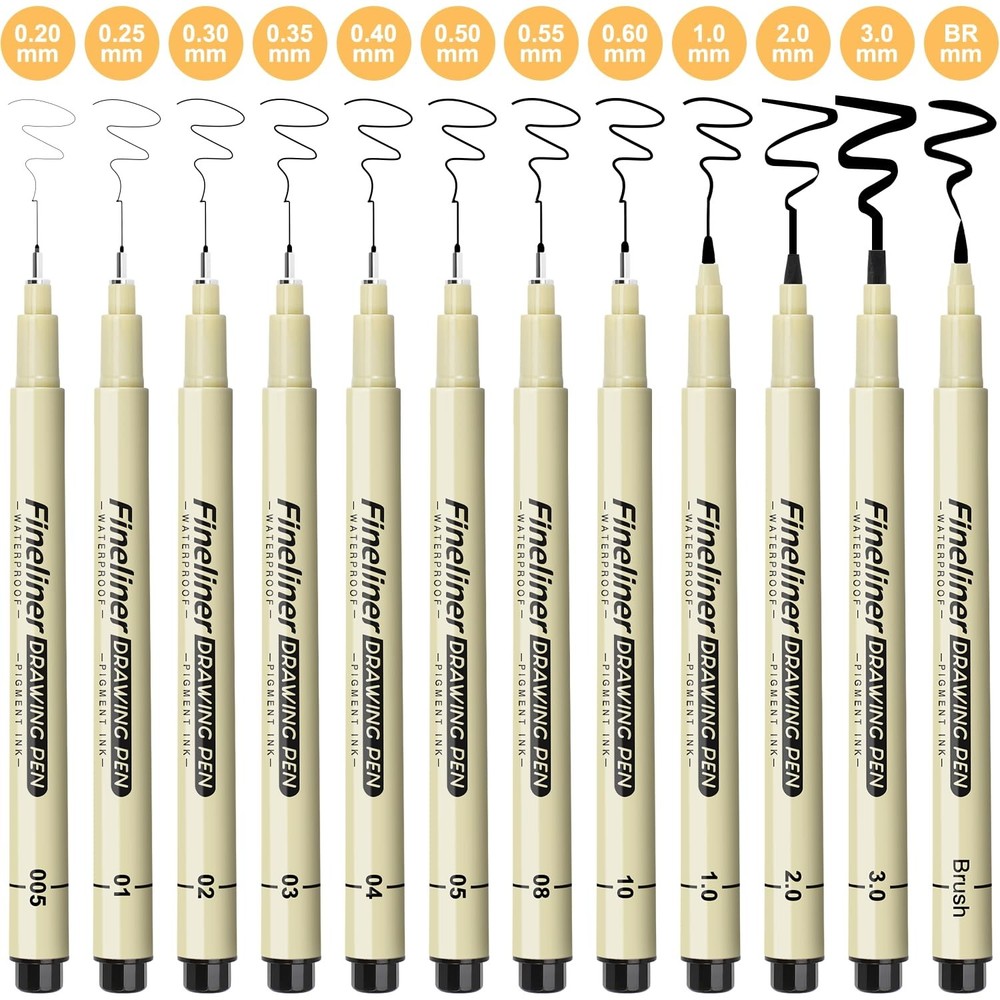 Micro Fineliner Black Drawing Pens,12 Waterproof Watercolor Dark Product Details AKUBLE Drawing Pens 12 Black: This professional set includes various tip sizes from 0.2mm to 3.0mm, plus a brush tip. They are bleed-proof, smear-proof, and waterproof. Ideal for drawing and writing, these pens meet all your artistic needs. Suitable for both artists and beginners. Tip sizes: 0.2mm (005), 0.25mm (01), 0.3mm (02), 0.35mm (03), 0.40mm (04), 0.45mm (05), 0.50mm (08), 0.55mm (1.0), 1.0mm (1), 2.0mm (2), 3.0mm (3), Brush (BR) Smooth & Skip-Free Nylon Nib: Crafted from high-quality nylon, this premium nib ensures exceptionally smooth, skip-free writing on journals, watercolor paper, trace, vellum, and more. Available in various tip sizes (needle, medium, thick, and brush). (Note: Avoid pressing too hard to protect the fine point.) Waterproof Archival Pigment Ink: Protect your artwork from bleed-through and smudges. Our archival-grade ink is bleed-proof, smear-proof, waterproof, quick-drying, and fade-resistant. It's also acid-free, non-toxic, odorless, and complies with ASTM D-4236 & EN71-3 standards. (Note: Ink becomes water-resistant after full drying, which typically takes a few seconds.) Ideal Gift Choice: The elegant plastic package also serves as a handy storage case. Perfect for family, friends, and neighbors. Suitable for home, school, office, or travel use. Excellent as stationery, craft supplies, journaling kits, and for Birthdays, Anniversaries, Holidays, and special celebrations Wide Compatibility: Works perfectly with pencil, watercolor, alcohol markers, highlighters, and more. Ideal for artists, designers, writers, architects, illustrators, and calligraphers. Supports bullet journaling, sketching, manga, calligraphy, note-taking, coloring, drafting, scrapbooking, and various other artistic and writing applications
