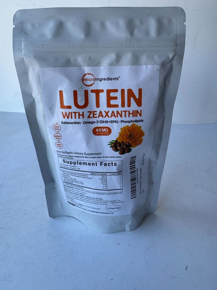 Micro Ingredients Lutein & Zeaxanthin Eye Health Support 40mg Softgels 240 Count Description Micro Ingredients Lutein & Zeaxanthin Eye Health Support 40mg Softgels 240 Count . Product Detail • Brand : Micro Ingredients • Department : Adult • Type : Supplement Please message me if you have any questions.