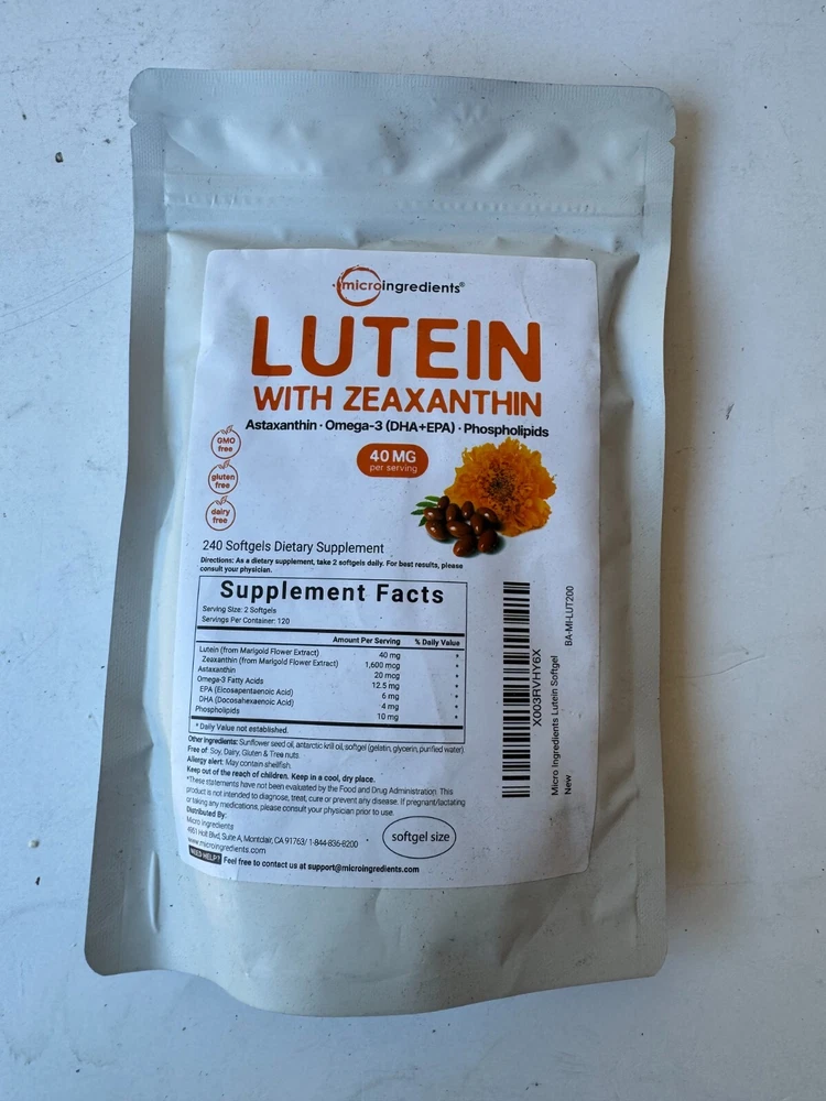 Micro Ingredients Lutein & Zeaxanthin Eye Health Support Softgels 240 Count 40mg Description Micro Ingredients Lutein & Zeaxanthin Eye Health Support Softgels 240 Count 40mg . Product Detail • Brand : Micro Ingredients • Department : Adult • Type : Eye Health Support Please message me if you have any questions.