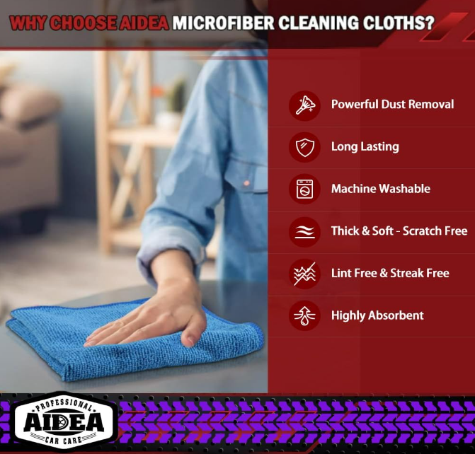 About this item -Super Absorbent : Experience the excellent quality of AIDEA all-purpose microfiber cleaning cloths ; made from 87% polyester and 13% polyamide ; offering exceptional absorbency and quickly wicking away water to keep you dry ; ideal for swiftly and safely removing dirt , grime, and liquids -Soft & Lint-Free : Our ultra- soft and non-abrasive microfiber towels ensure a scratch-free cleaning experience on surfaces , paint , glass , and coatings ; effective in tackling the toughest grease , grime, and dirt ; suitable for cleaning kitchens or cars ; leaving surfaces shiny and pristine -Remarkable Durability and Reusability : These microfiber dusting cloths can be washed and reused hundreds of times ; resistant to shrinking , falling apart, or losing cleaning power ; designed for long-term use -Easy Care and Use : Available in five different colors for easy color coding of cleaning tasks ; designed with premium fabrics that prevent scratching ; ideal for polishing and drying without damaging surfaces ; keeps your car shiny and intact Versatile : AIDEA cleaning rags are perfect for a variety of tasks ; effective with just plain water ; suitable for use in kitchens , bathrooms , and for dusting ; an essential tool for any cleaning routine CONTACT US You can contact us 24/7. Have fun shopping.