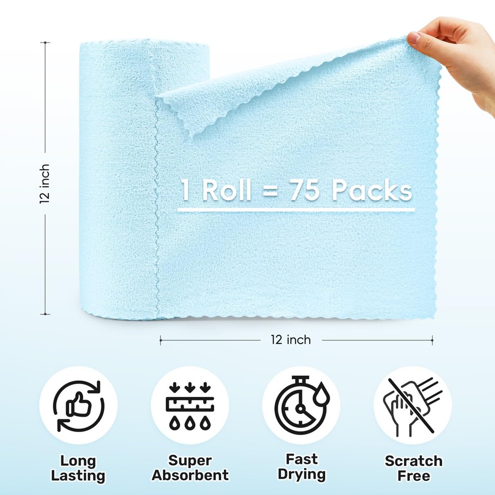 This microfiber cleaning cloth roll is perfect for cleaning your glasses, phone screen, kitchens , home, laptop, and any other sensitive surfaces. The cloth roll is made of high-quality microfiber material, which is soft, lint-free, and non-abrasive, ensuring that your devices are protected from scratches and smudges. The cloth roll is easy to roll up and Tear Away Towels, making it a must-have accessory for anyone who wants to keep their devices clean and smudge-free. The microfiber cleaning cloth roll is also machine washable, making it a reusable and environmentally friendly choice. Whether you are at home, office, or car, this microfiber cleaning cloth roll is the perfect tool for keeping your devices clean and looking their best. Premium Microfiber Cleaning Cloth Roll for Effortless Cleaning:Measuring 12" x 12", our microfiber cloth roll is the ultimate alternative to paper towels, perfect for kitchens, cars, windows, and delicate surfaces. The tear-away microfiber towel roll design ensures quick access, while the ultra-soft lint-free rags deliver a streak-free finish every time. Superior Absorbency & Reusable Microfiber Towels:Our microfiber towels absorb up to 7x their weight in water—outperforming traditional paper towels. Made from high-quality microfiber rags, they’re washable and reusable 50+ times, reducing waste while maintaining durability for long-term use. Gentle & Effective Microfiber Kitchen Towels:Designed for a smooth, residue-free clean, our microfiber kitchen towels are lint-free, non-abrasive, and safe for glass, mirrors, and stainless steel. The textured surface enhances scrubbing power without scratching, making them a top choice for reusable towels for kitchen roll use. Convenient Roll of Microfiber Towels for Every Need:Each microfiber roll of towels is pre-cut for easy dispensing, just like paper towels, but far more durable. Store them in your car, garage, or kitchen—our microfiber cleaning cloth roll ensures you always have a fresh cloth ready for spills, dusting, or polishing. Eco-Friendly & Versatile Microfiber Towel Roll:Ditch disposable wipes with our microfiber towel roll, designed for sustainability and efficiency. Whether for household chores, automotive detailing, or workshop cleanup, these microfiber cloths deliver superior performance while reducing environmental waste.
