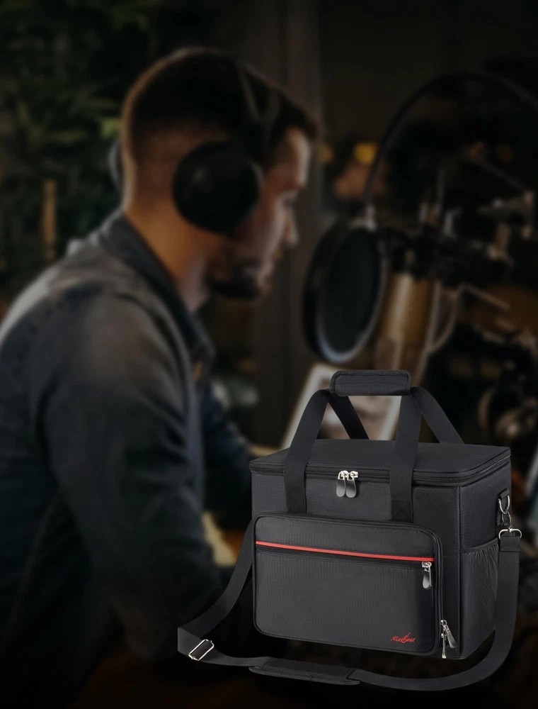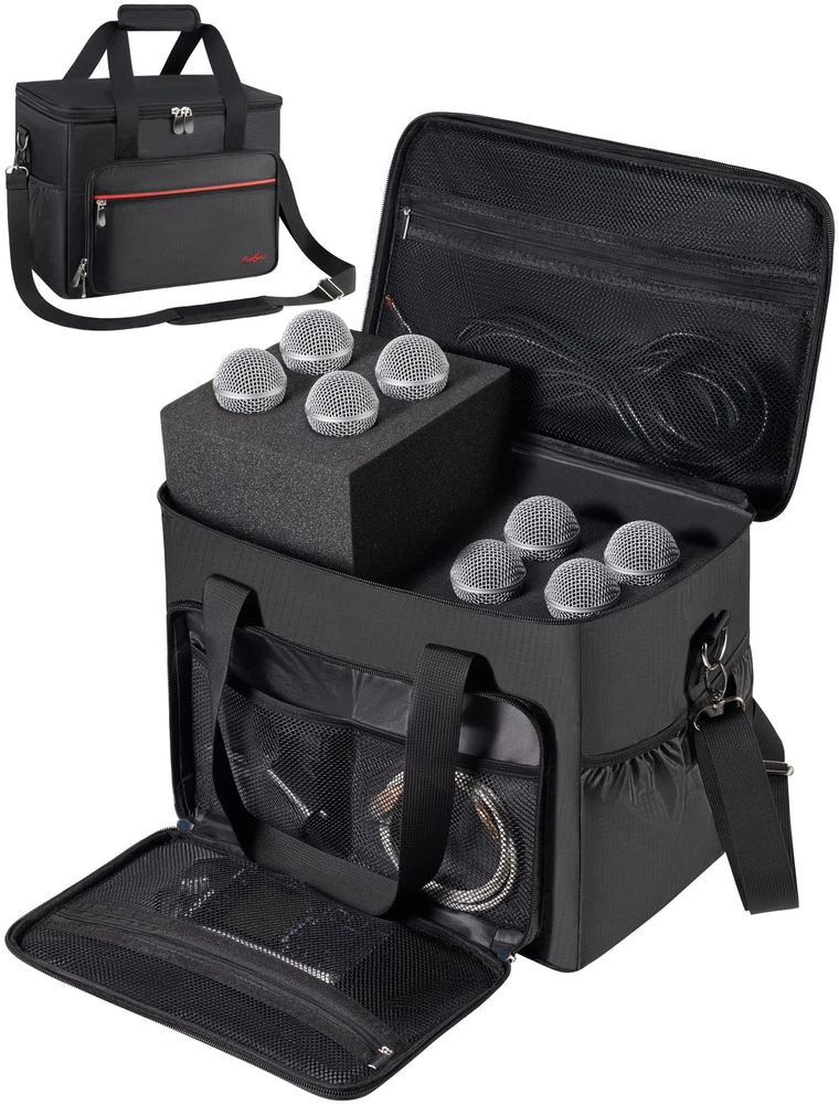 Secure Padded Protection: Worried about your precious microphones get shocked? The microphone bag features a thickened interior foam pad to hold the standard dynamic microphones or wireless stage microphones securely like a cloud coddling a newborn. When the zipper shut, the solid construction would ensure the mics snugly held and not bouncing around in the microphone storage bag. 8+ Pockets for Mics and Cables: To fit both wire mics and wireless mics accessories, we design as many pockets as possible. There is a zippered mesh pockets on the lid to prevent stuffs falling out. The separate zippered front pouch has more than adequate room for your mic stand clips and charger. There are 2 side pockets of the microphone carrying bag for guitar picks, handheld recorder, and cables. The front interior mesh compartment could also hold a compact mixer and small di box. Fits for Wired and Wireless Mics: If you are looking for a case compared to other microphone case only suit for one kind of microphone, this microphone organizer case specially designed for both short wired vocal mics like SM58, and those longer wireless mics, or standard condenser vocal mics like the Beta 87A, the soft padded lid can be expanded to accommodate even non standard square sized mics like the e609. How to inflate the foam? We recommend 3 methods to restore the sponge: 1. If you're not in a hurry, the best way is to let it naturally regain its shape over a period of 48 hours. 2. You can also use a hair dryer on a higher temperature and speed setting to inflate it. 3. Another option is to place it in the dryer on the "fluff" setting along with a couple of dryer balls to help expand it. 3 Ways Carrying: Hard to find a portable travel mics storage bag? This mics bag would be an excellent choice for light mobile use, especially perfect for the people engaged in podcasting, church events, karaoke shows, and road trips. Comes with a padded handle, allowing for one-handed carrying and an adjustable shoulder strap with padded to alleviate shoulder pressure. It also features a luggage belt on the backside, enabling to securely fasten the bag to the rolling suitcase to free up hands.