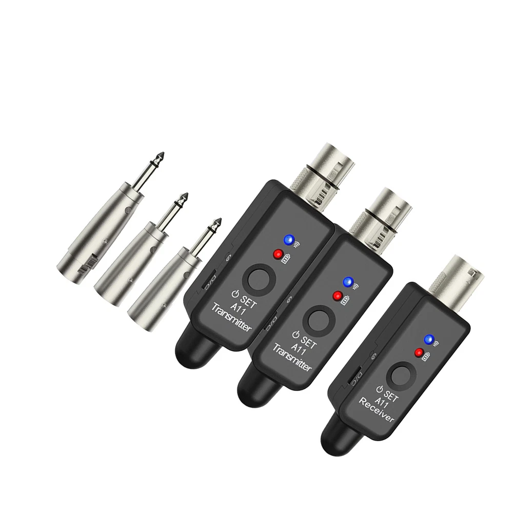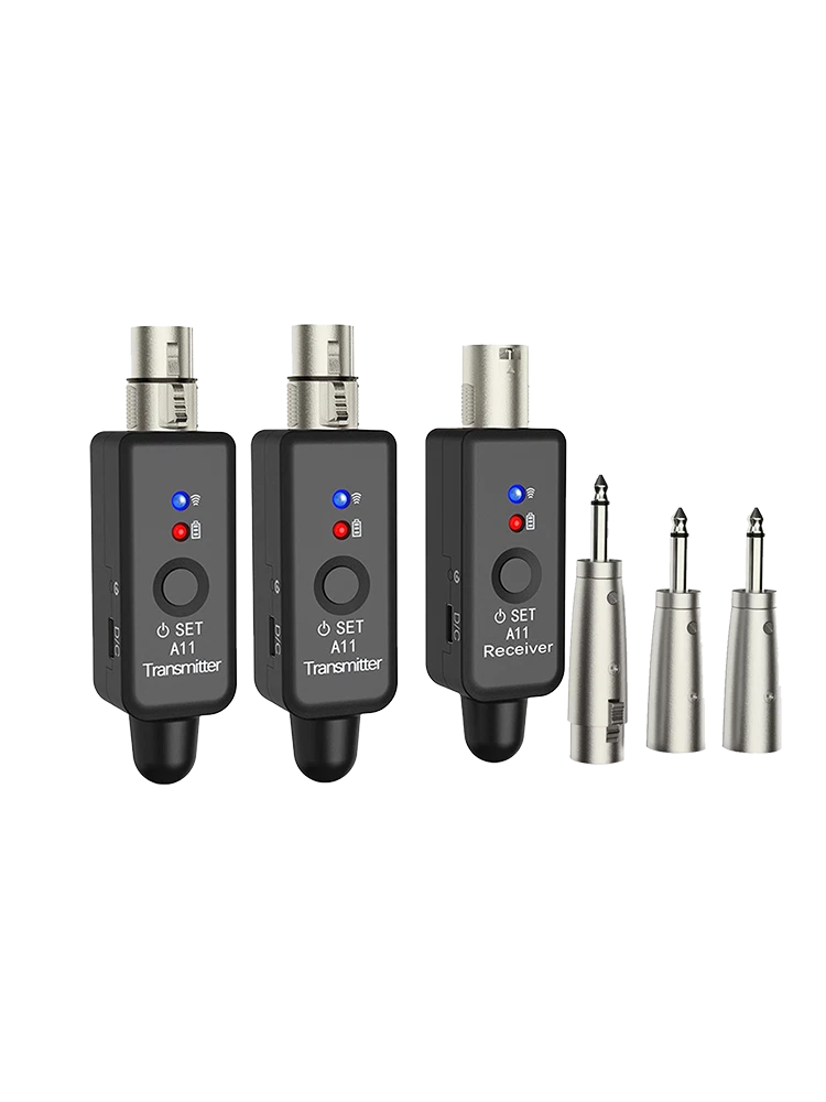 [Professional Wireless Transceiver Systems] The A11 Wireless Microphone System Upgrade features dual transmitters and the latest wireless UHF frequency transmission technology,2.4GHz band is optimal for Microphone wireless, Solid RF connection over a 100 feet range, uncompressed wireless signal transmission, low noise and latency. [Crystal Clear Sound] Enjoy high-resolution 24-bit/48kHz audio with a wide 20Hz to 20kHz frequency response, delivering detailed sound at any volume, supported by up to 108 dB signal-to-noise ratio and a dynamic range of 108 dB for exceptional clarity. [Ultra-Low Latency] Experience virtually no lag with less than 4ms latency, perfect for live performances. [Long-Lasting Battery] Perform without interruption with up to 5 hours of battery life. Both the transmitter and receiver come with rechargeable batteries, ensuring you're always ready to go. [Super Easy to Use] Small and delicate, no complicated settings, plug and play design is convenient to use. You would find that the XLR wireless transmitter and receiver works very well for you and your setup from the moment you begin to use it! [Stable and Flexible] Designed for professional dynamic / harmonic / condenser microphones, the A11 features recording-level sound transmission quality, and a stable and reliable wireless signal. This flexible and portable wireless solution accommodates a wide range of microphones—use your favorite! The A11 system is suitable for recording studios, music and theatre performances, public speaking, videography, outdoor use and more.