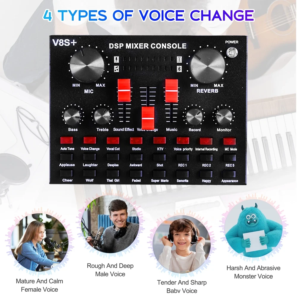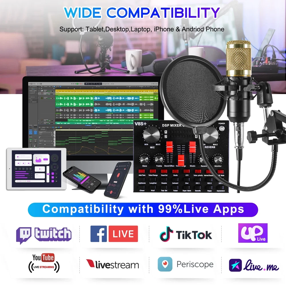 Capture crystal-clear audio with our professional-grade USB microphone.Designed for recording podcasts and live streaming, this studio microphone kit is equipped with advanced features, including an adjustable microphone stand and a high-quality sound card.Whether you're a content creator on TikTok, YouTube, or Twitch, our USB microphone ensures optimal sound quality and versatility. Delve into the world of online streaming with this top-rated microphone and elevate your audio production. Package Contents: 1*Nylon Filter 1*V8 Live Sound Card 1*BM-800 Condenser Microphone 1*Adjustable Microphone Stand 1*Faux-plastic Shock Mount 1*Microphone Windscreen 1*USB 3.5mm Charging Cable 1*USB 3.5mm Accompaniment Cable 1*USB 3.5mm Live Cable 2*English Manual Instruction Podcast equipment bundle with 2024 upgraded V8 sound card. Professional BM-800 podcast microphone - cardioid pickup mode provides original and accurate voice capture and reduces unwanted background noise. This condenser microphone bundle is easy to use, with no need to download the additional driver software, and suitable for recording equipment for Laptop/Computer Vlog Living Broadcast /YouTube TikTok live streaming. BM-800 Condenser Mic Kit with Live Sound Card, Shock Mount, Pop Filter, Mic Adjustable Suspension Scissor Arm Stand for Crystal Clear Sound (Gold)