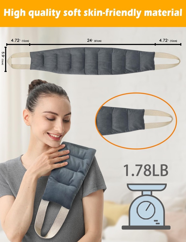 Kivdes Microwavable Heating Pads for Neck Shoulders Pain Relief 33*5.9" Heated Neck Wrap Warmer Microwave Pad Moist Heat for Cramps Back Joints Muscles Warm and Cold Compress Reusable with Handles QUICK PAIN RELIEF: The Neck Heating Pad helps relieve neck, shoulder and back pain. Heating it improves blood circulation while soothing stiffness and soreness. HOT & COLD THERAPY: Moist heat therapy effectively relieves joints, cramps, stiffness, muscle aches, tightness, arthritis, swelling and inflammation, providing deep, penetrating moist heat and improving blood circulation. Cold therapy provides a comfortable cooling sensation and reduces swelling from strains and sprains. No need to worry about medication side effects. EXTRA LONG & FLEXIBLE & MULTIPURPOSE: This microwave heating pad measures 33.44*5.9 inches,1.78LB, which can fit your neck, shoulders and back well. In addition, it is longer than most regular rice heating pads. This microwave heating pad is an amazing multi-purpose heat pack that is soft and flexible enough to fit your body parts and provide calming heat to your neck, shoulders, back, arms, legs, ankles and knees. SECTIONAL CHAMBER & ERGONOMIC DESIGN: Featuring a unique segmented chamber stitching, it helps to fit your body and provide more even and long-lasting heat, and it has two handles that are flexible enough to be applied to any part of your body, providing you with instant relief from aches and pains. 100% NATURAL FILLING & DURABLE: Our heating pads are filled with flaxseed,millet and clay beads, these natural ingredients have the effect of keeping you warm for a long period of time, no matter where you are, this heat pad will keep you warm and relax you. In addition, the heat neck cover is made of skin-friendly fabric. It can withstand high temperatures and retain heat. Durable enough to withstand frequent use. GREAT GIFT FOR HOLIDAYS: Our microwave heating pads, either on their own or in a value pack, make a beautiful gift for any occasion. Give someone you care about a gift that keeps on giving. Every time they use it to relieve neck, shoulder, lower back, knee pain or cramps, or if they want to feel comfortable, they'll know you care through our neck and shoulder heating pad.